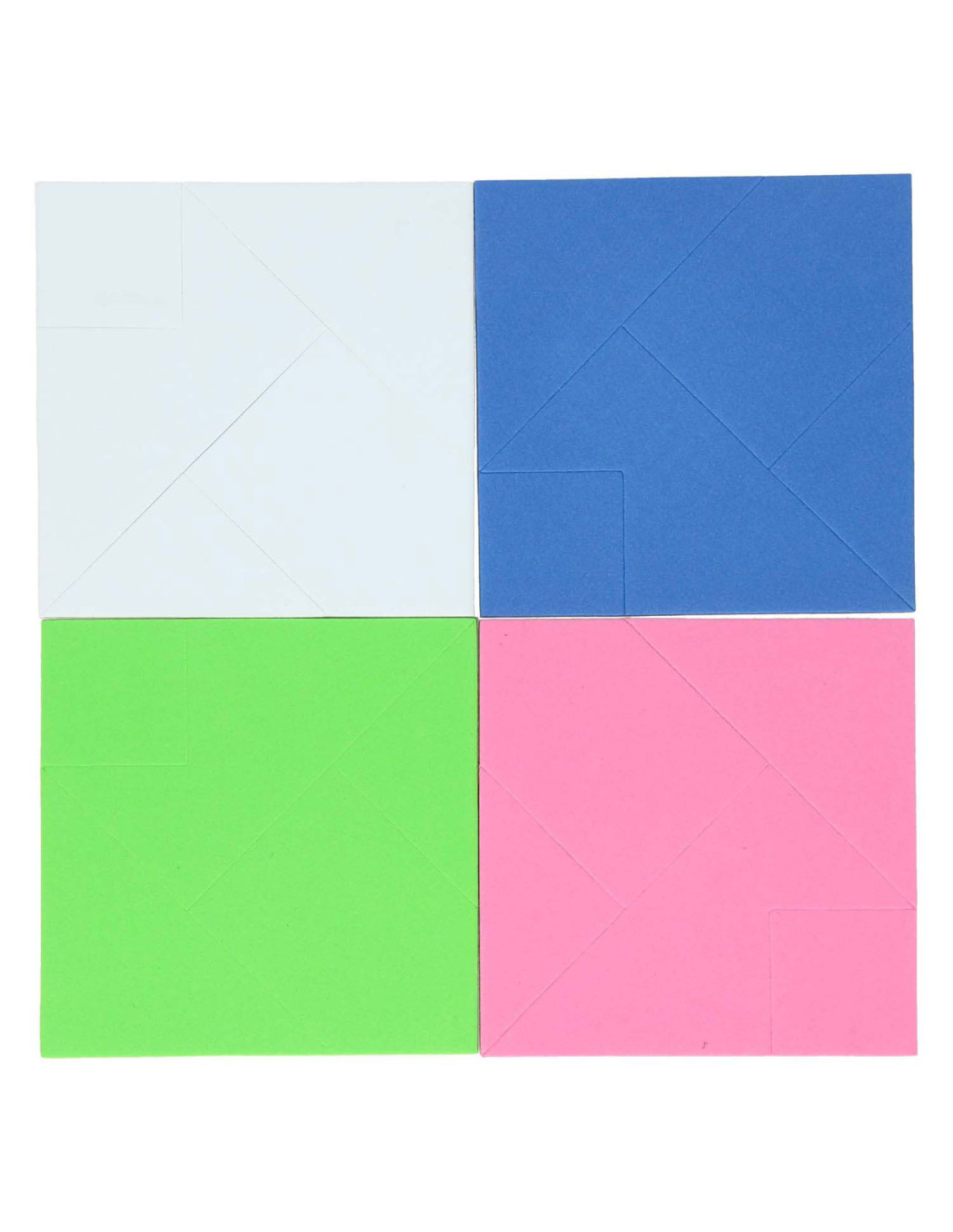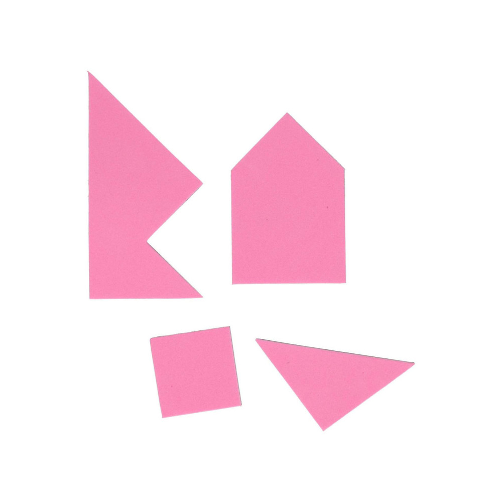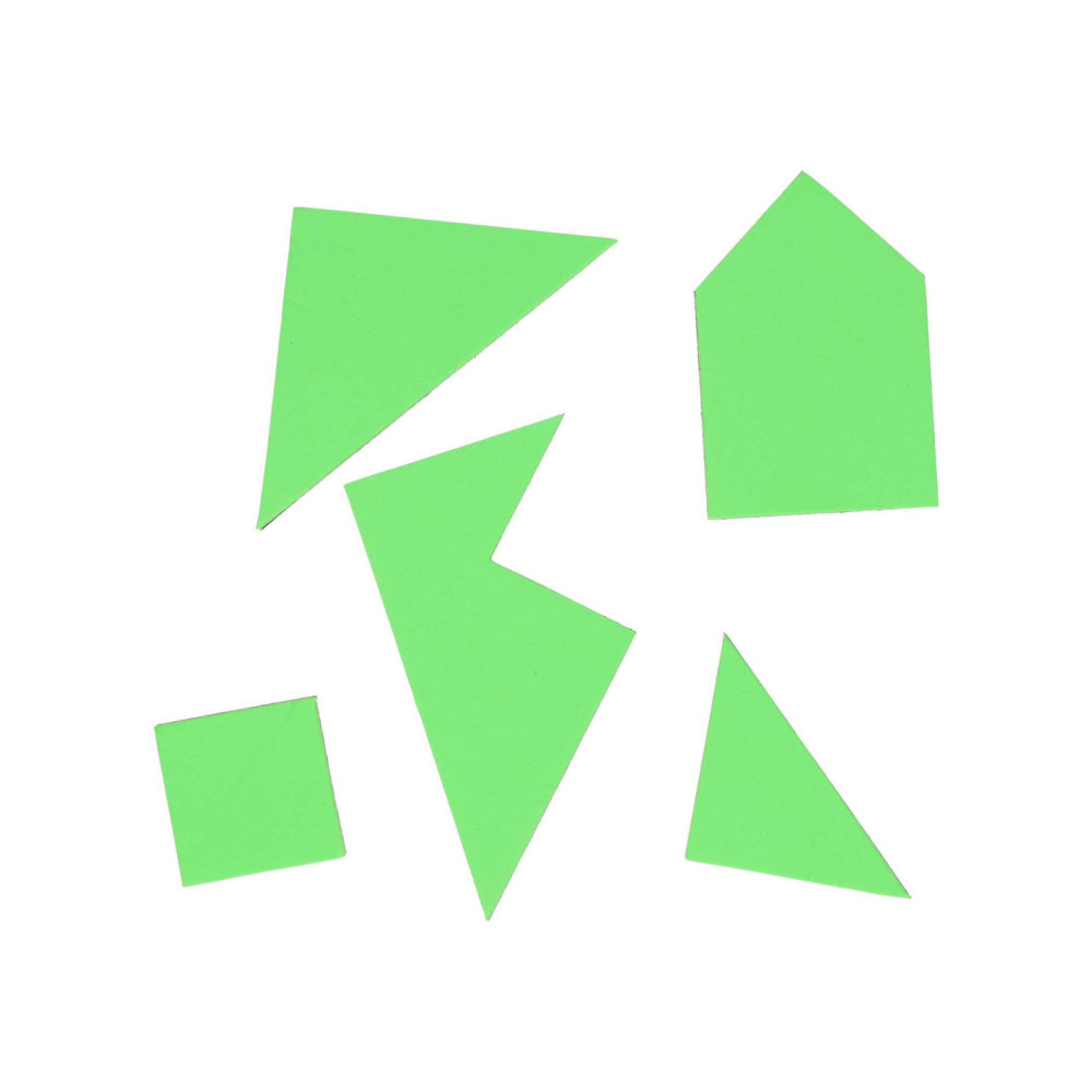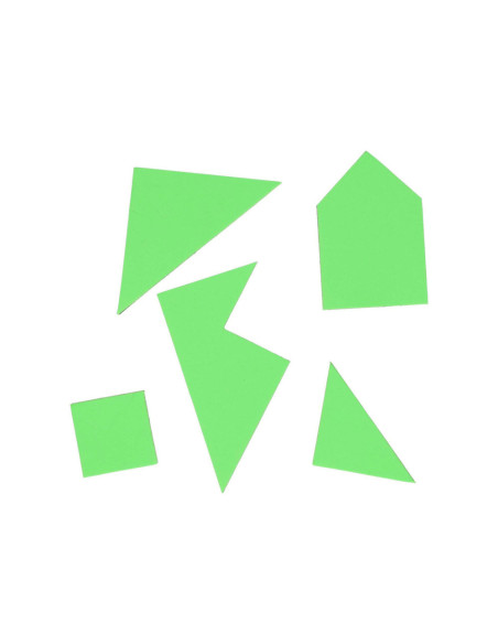4 kleuren Tangrampuzzel van 4 x 5 stukken. De puzzel die je kunt maken, bestaat uit 5 stukken. Geschikt vanaf 3 jaar.
