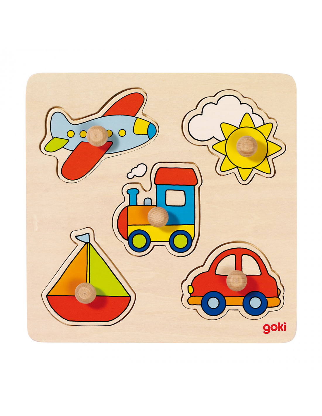 Houten noppenpuzzel met 5 puzzelstukken in de vorm van voertuigen.