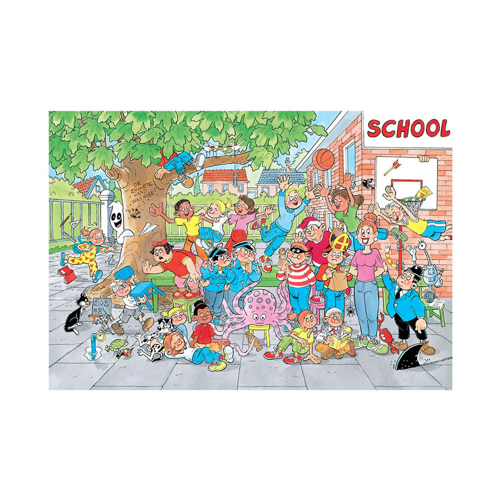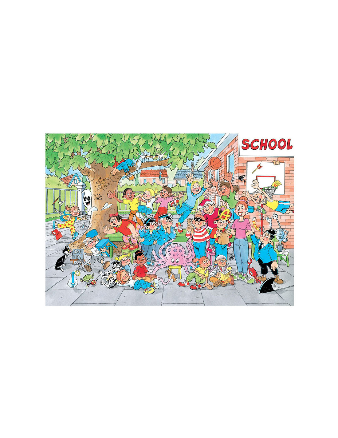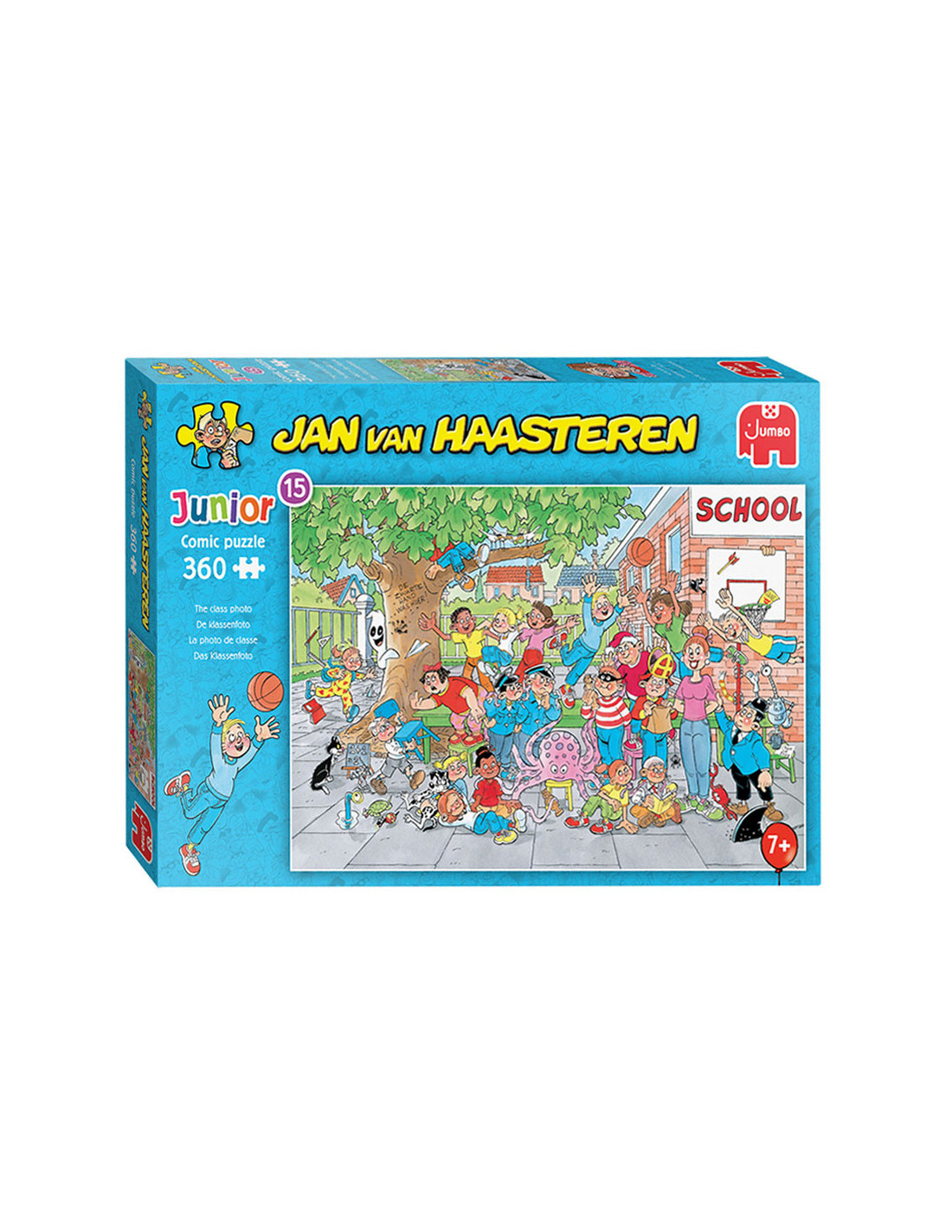 Iedereen ziet er op zijn best uit voor de jaarlijkse klassenfoto, maar ze hebben het te druk met spelen. Sjaak probeert een stoel te stelen, John wil de basketbalwedstrijd afmaken en Nick zoekt zijn broodje. Zal de foto ooit gemaakt worden?Jan van Haasteren Junior laat kinderen vanaf 5 jaar kennismaken met de absurde wereld van deze beroemde puzzels. Ze zetten hun eerste stappen in de humoristische illustraties van Jan van Haasteren en maken vorderingen met verschillende aantallen en moeilijkheidsgraden.