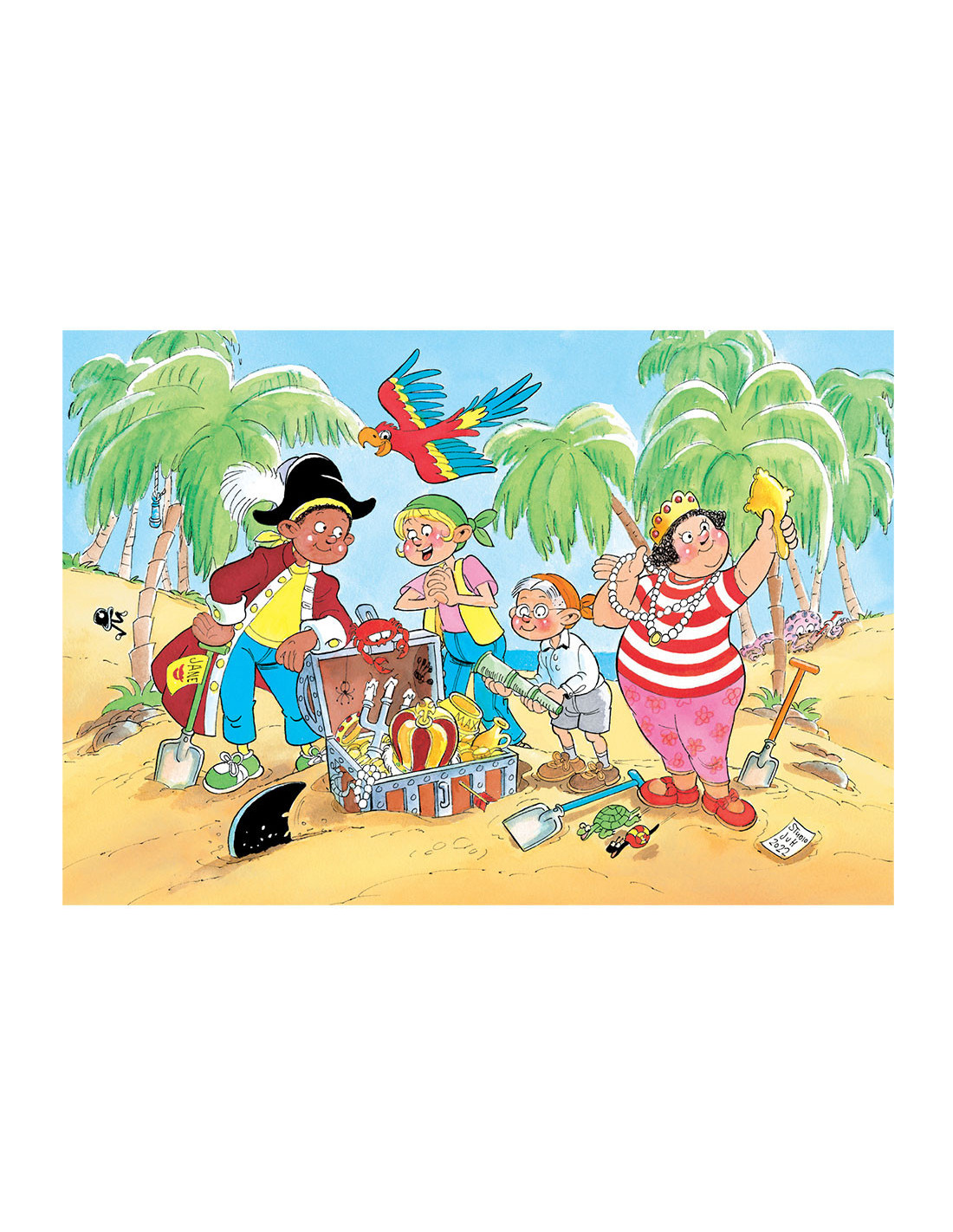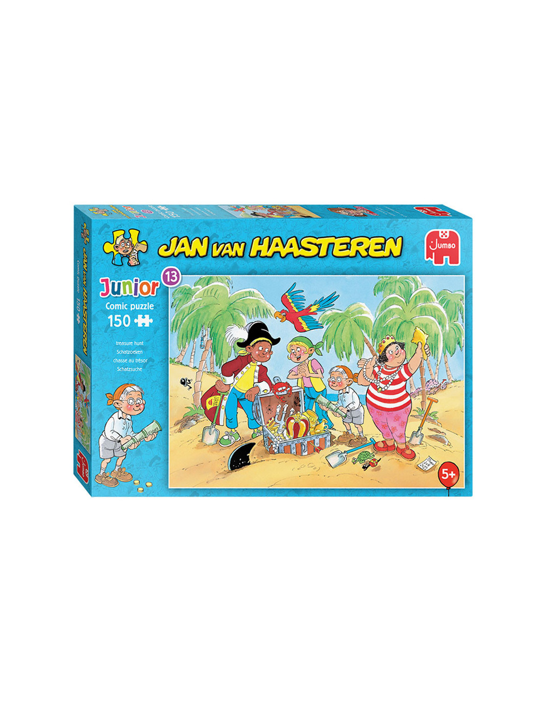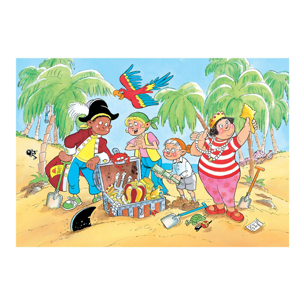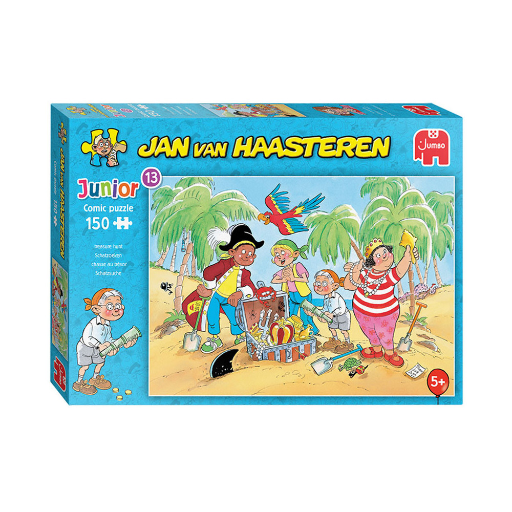 Na lang zoeken en graven hebben Sjaak, Wendy en enkele vrienden de schat gevonden. Wauw, wat een mooie vondst! Wendy bewondert de parelketting, terwijl de anderen erg trots zijn op hun harde werk.Jan van Haasteren Junior laat kinderen vanaf 5 jaar kennismaken met de absurde wereld van deze beroemde puzzels. Ze zetten hun eerste stappen in de humoristische illustraties van Jan van Haasteren en maken vorderingen met verschillende aantallen en moeilijkheidsgraden.