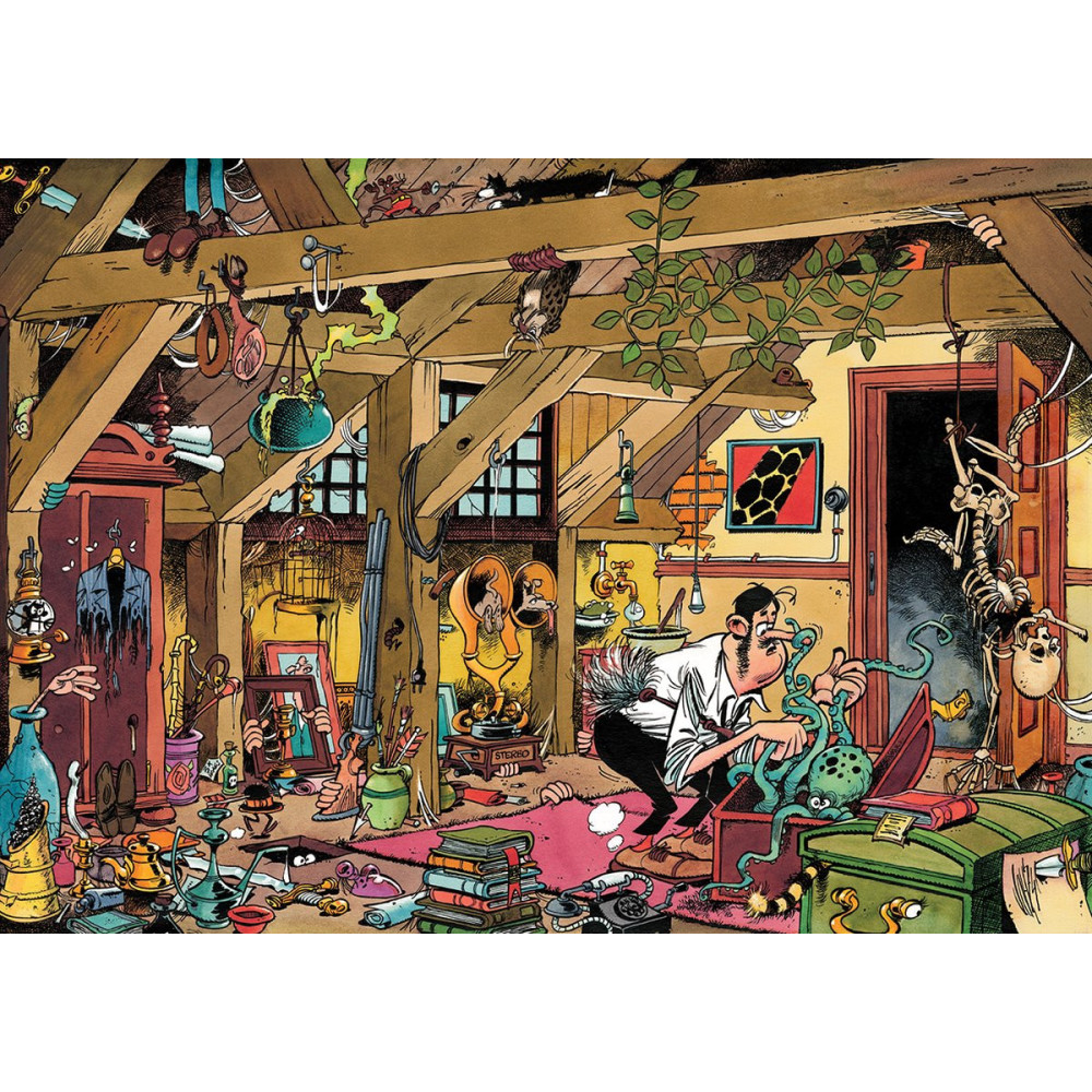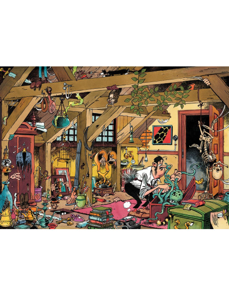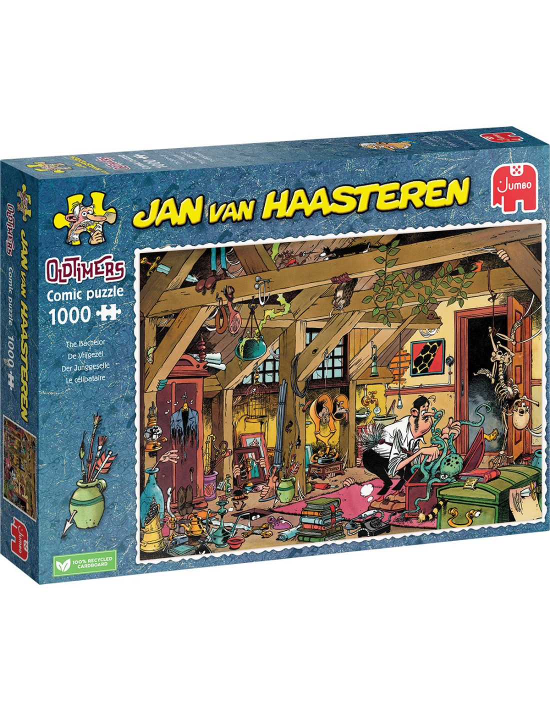 Jan van Haasteren Oldtimers - De Vrijgezel puzzel bestaande uit 1000 stukjes. Met de Oldtimers-serie kijken we terug naar de vroege periode van Jan van Haasteren legpuzzels. Het is een beetje nostalgie en bovenal een eerbetoon aan het ongelooflijke vakmanschap van Jan van Haasteren. In deze puzzel maak je kennis met "Baron van Tast tot Zeveren". Dat was een stripfiguur die Jan van Haasteren vroeger tekende. Deze tekening is gemaakt in 1974. In deze puzzel vind je al een aantal terugkerende elementen zoals: de pijl, ogen, kogelgaten of kijkgaatjes, inktvis, de muis en de kat, en de bekende kleine handjes.