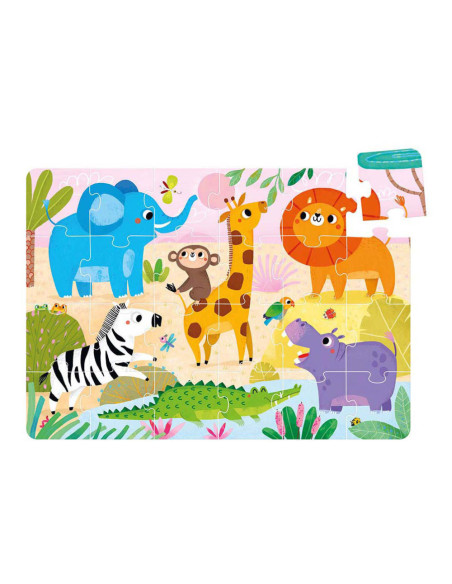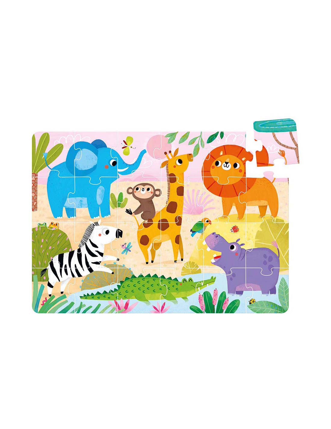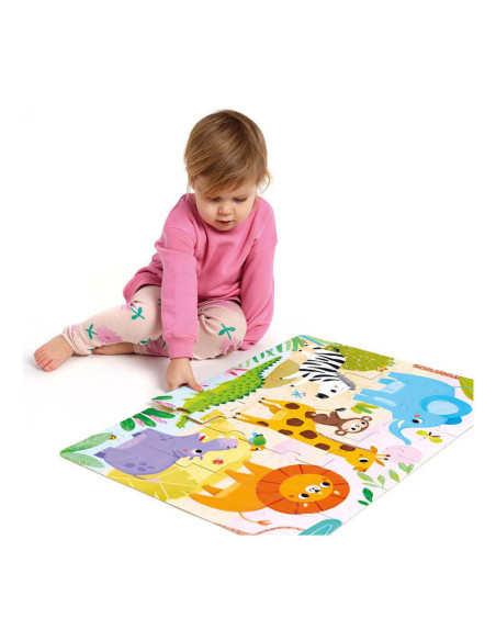 Deze grote, prachtige illustratie toont bekende en geliefde wilde dieren van de Afrikaanse savanne, perfect voor jonge ontdekkingsreizigers. Wie nodig je uit om mee te spelen en op puzzelavontuur te gaan?