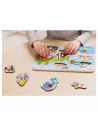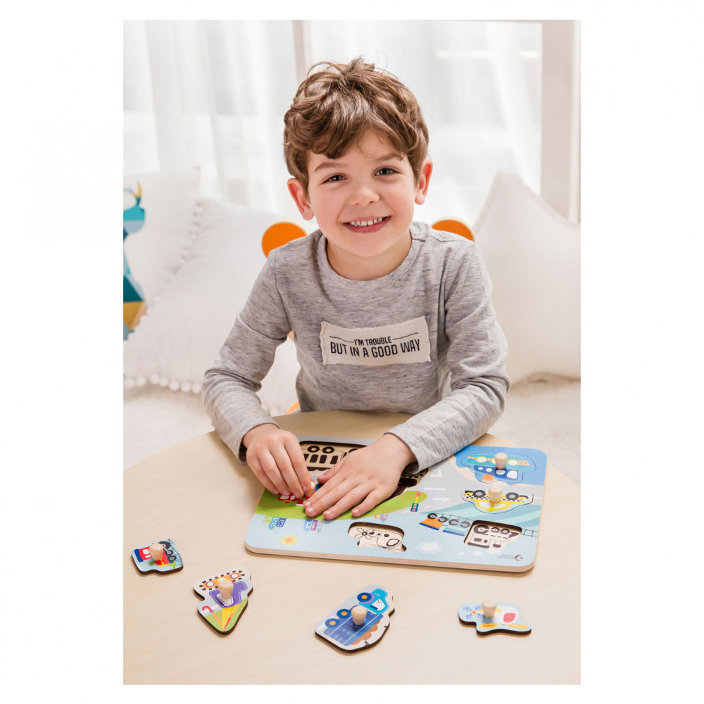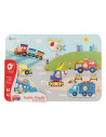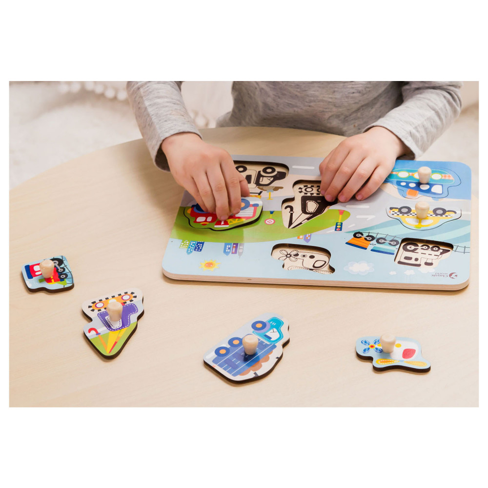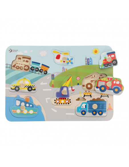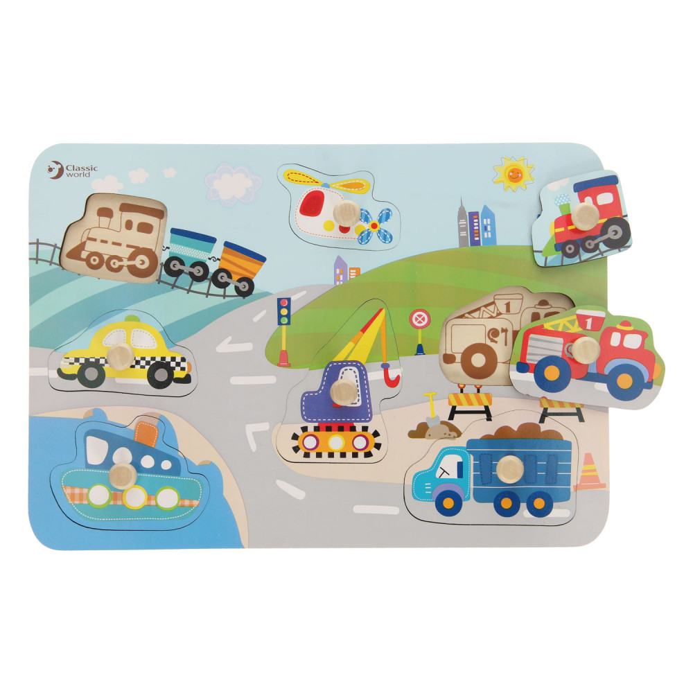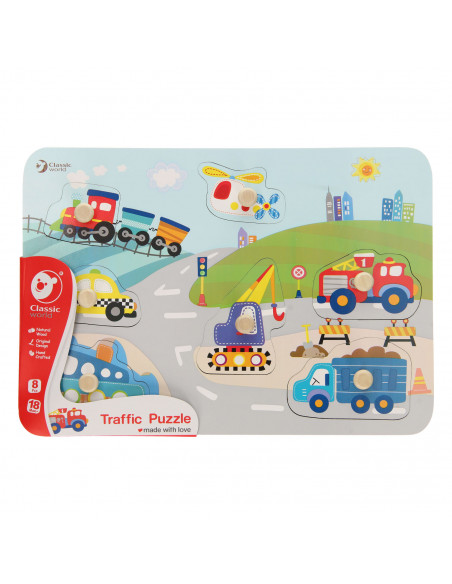 Leer verkeersvoertuigen kennen met deze houten noppenpuzzel Verkeer van Classic World. Zoek de juiste verkeersvoertuigen bij de vakjes, om je een extra handje te helpen staan de figuren ook al op de puzzelplaat afgebeeld. De puzzel is gemaakt van stevig hout in vrolijke kleuren. Spelen met de puzzel stimuleert de ontwikkeling van hand-oog coördinatie en logisch denken. Geschikt voor kinderen vanaf 18 maanden.