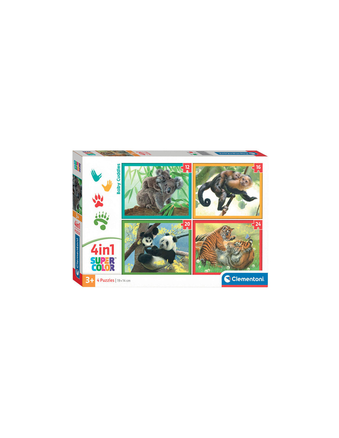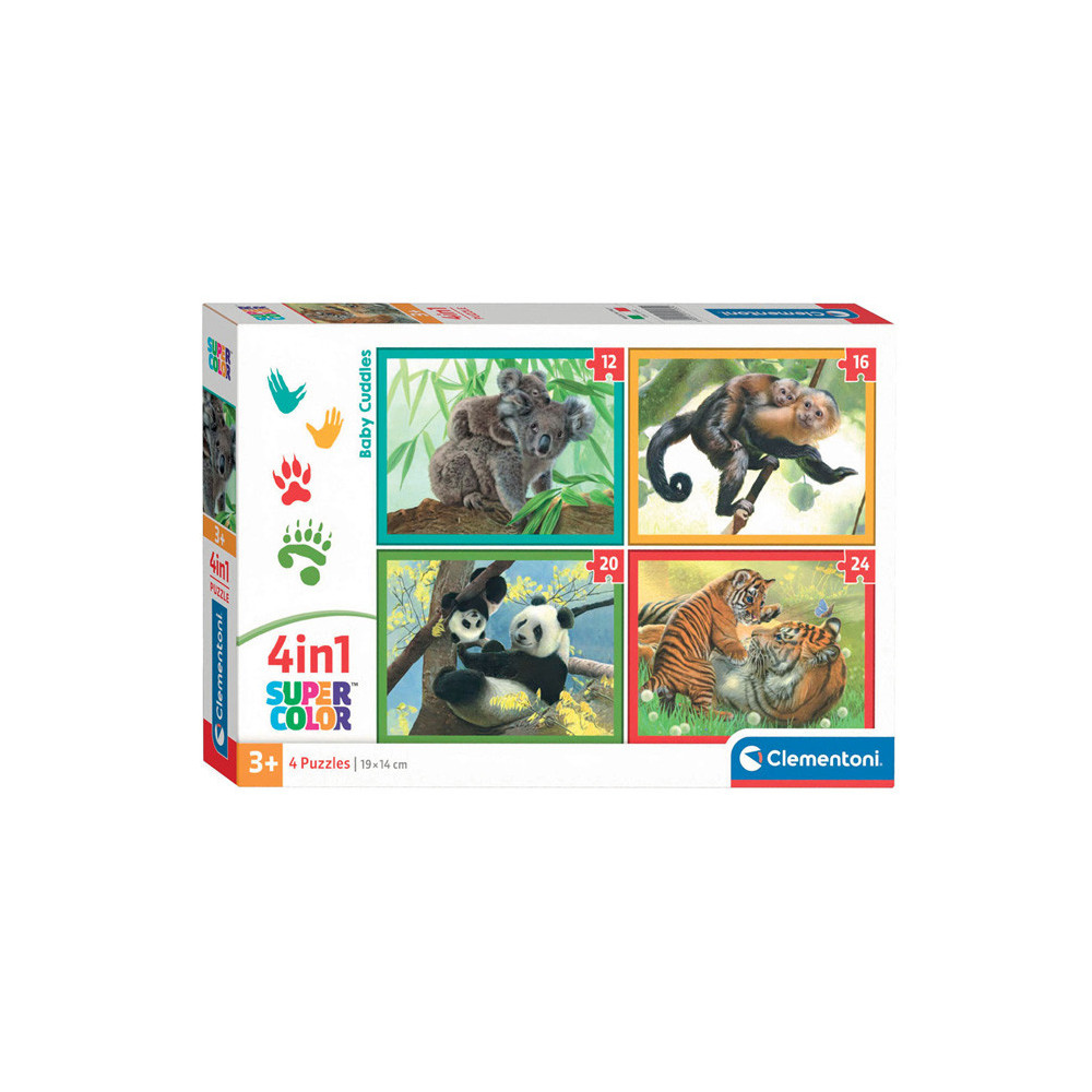 Kinderpuzzel 4 in 1 met verschillende afbeeldingen van wilde dieren moeders met hun baby's (koala, aapje, panda en tijger). De puzzels hebben 12, 16, 20 en 24 stukjes. Geschikt voor kinderen vanaf 3 jaar oud.