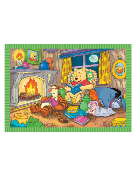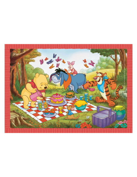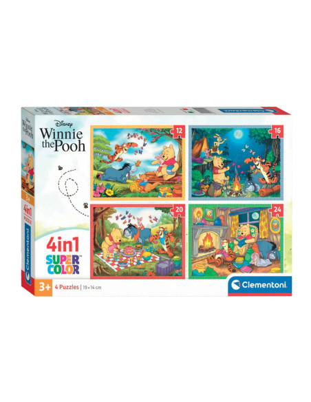 Set met 4 kleurrijke Winnie de Poeh-puzzels. De 4-in-1 puzzels zijn 19 x 14 cm groot en hebben 4 verschillende puzzels, met 12, 16, 20 en 24 stukjes. Adviesleeftijd: 3+