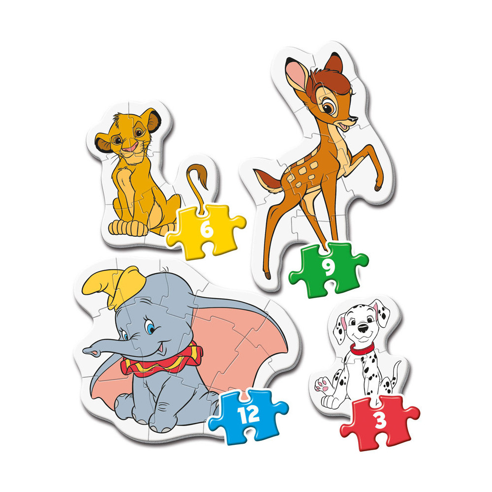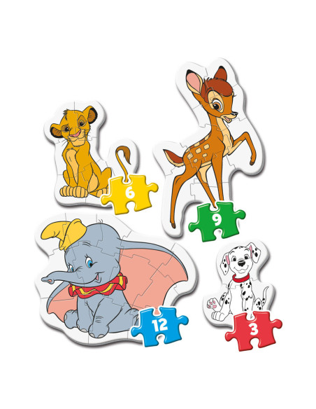 Disney 4in1 vormenpuzzel met Disney-karakterpuzzels van 3, 6, 9 en 12 stukjes. Geschikt voor kinderen vanaf 2 jaar oud.