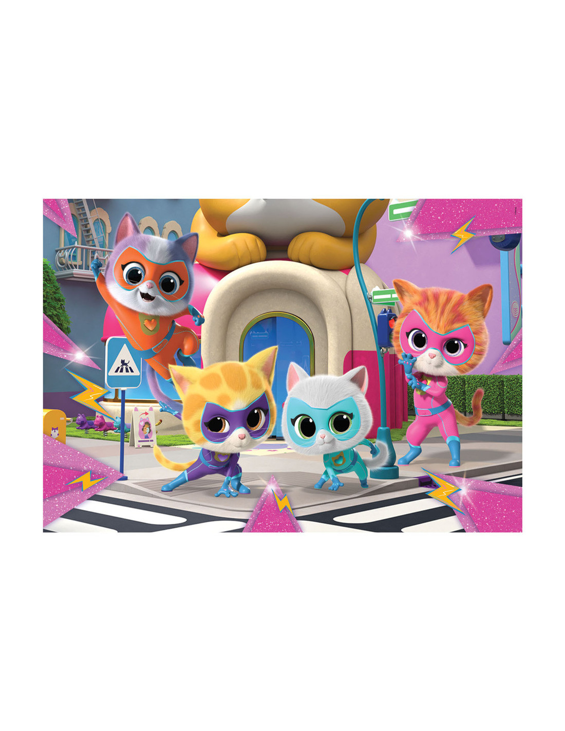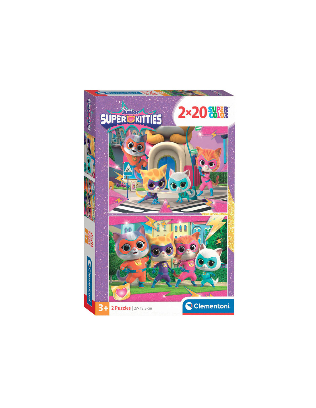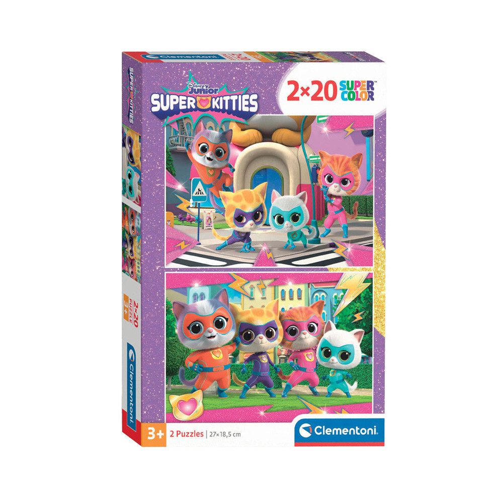 Clementoni puzzels. In deze doos zit een set van twee 20-delige legpuzzels van Super Kitties! Gemaakt van stevig karton en met heldere kleuren.