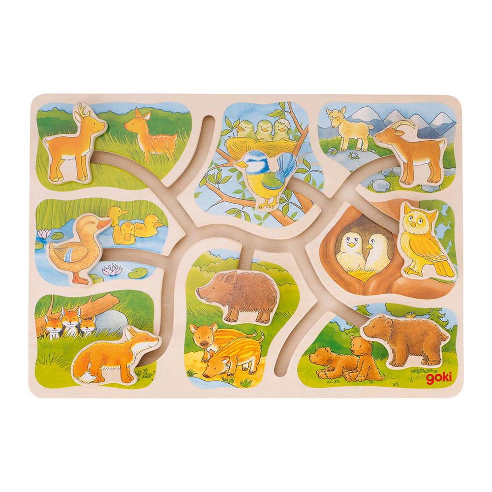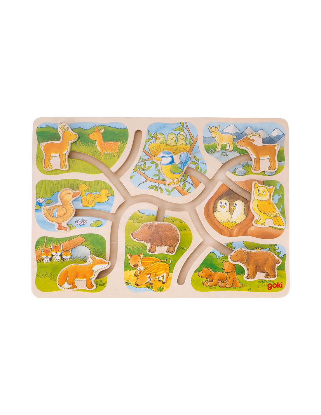 Houten schuifpuzzel met verschillende dieren van Goki. De afgebeelde dieren zijn een herten, eenden, vossen, vogels, zwijntjes, berggeiten, uilen en beren. De puzzel bestaat uit 8 stukken en is geschikt voor kinderen vanaf 24 maanden. Afmetingen: 30 x 21 x 2,4 centimeter.