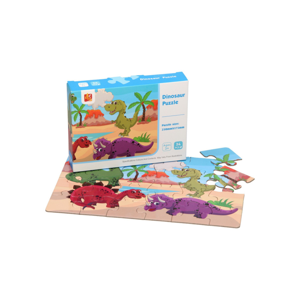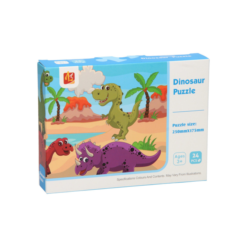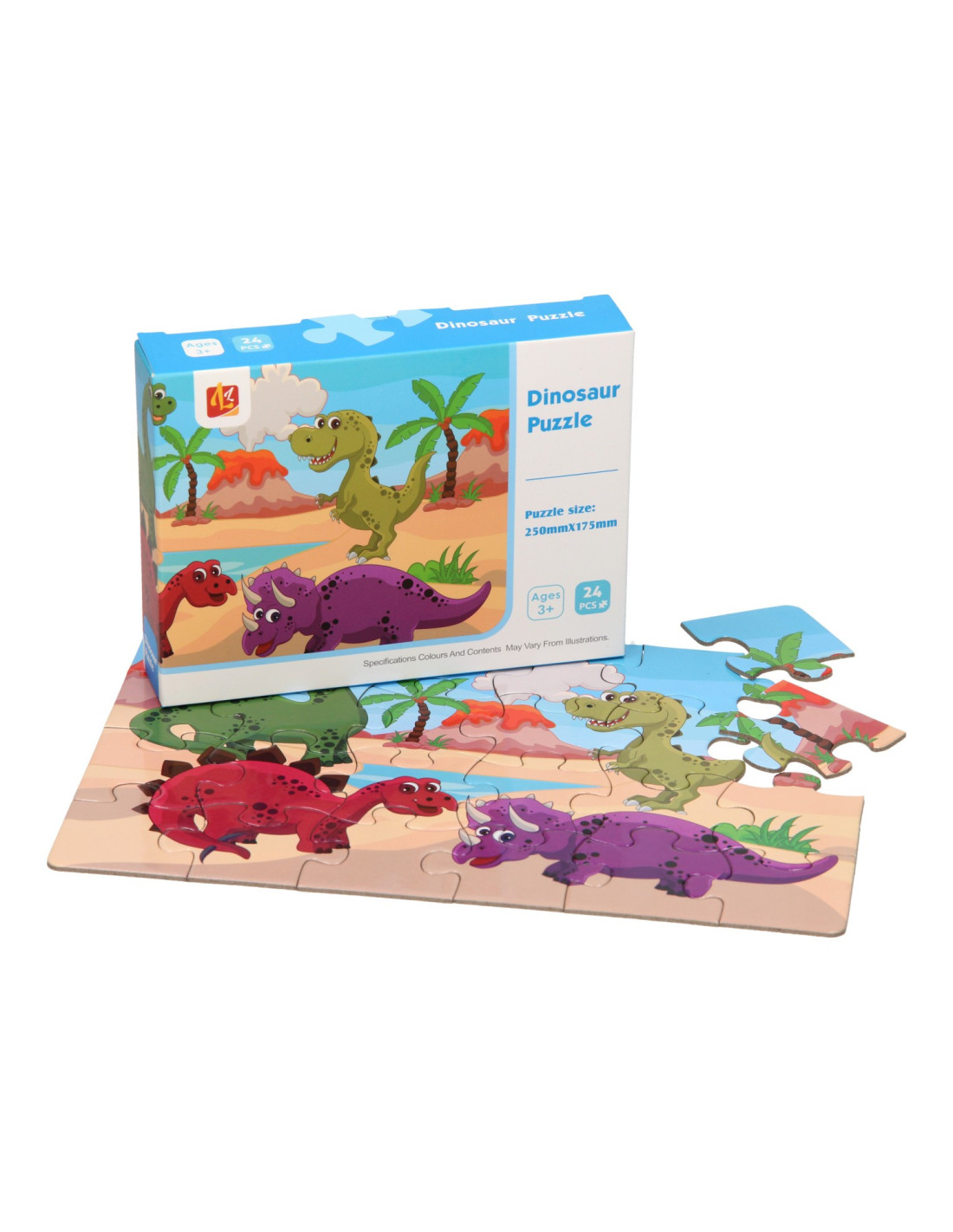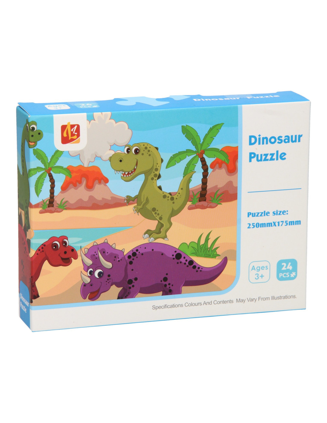 Een vrolijke dino puzzel waarop vier dinosauriërs staan in een landschap van vulkanen. De kartonnen puzzel bestaat uit 24 stukjes en is geschikt voor kinderen vanaf drie jaar. Hier zijn de kleintjes wel even zoet mee! De puzzel zit verpakt in een kartonnen doosje.