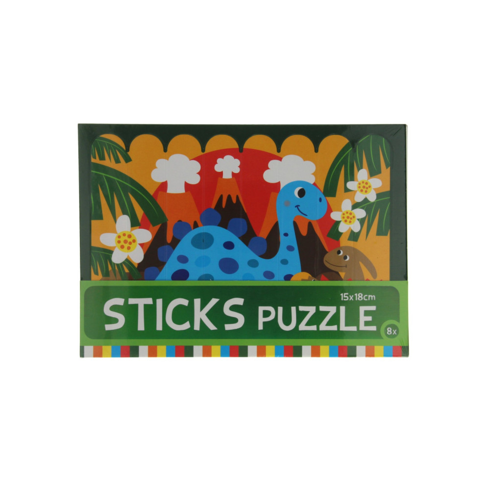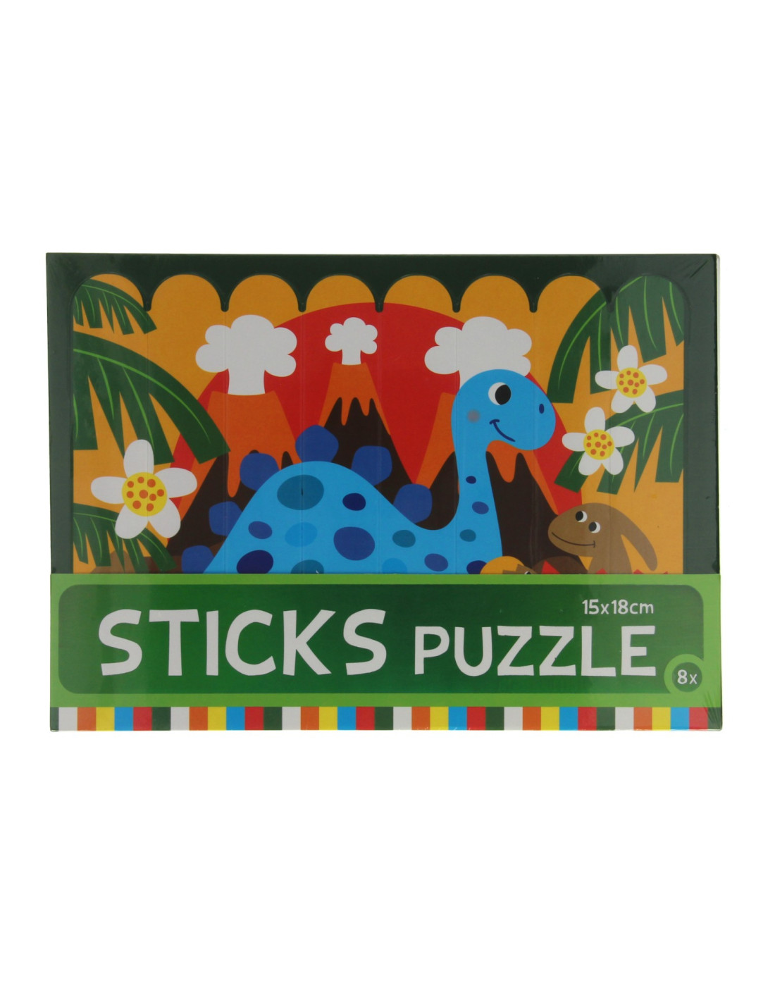 Kartonnen strokenpuzzel (8 stukken) met dubbelzijde dinoprint. Afmetingen: 15 x 18 cm. Adviesleeftijd: 3+