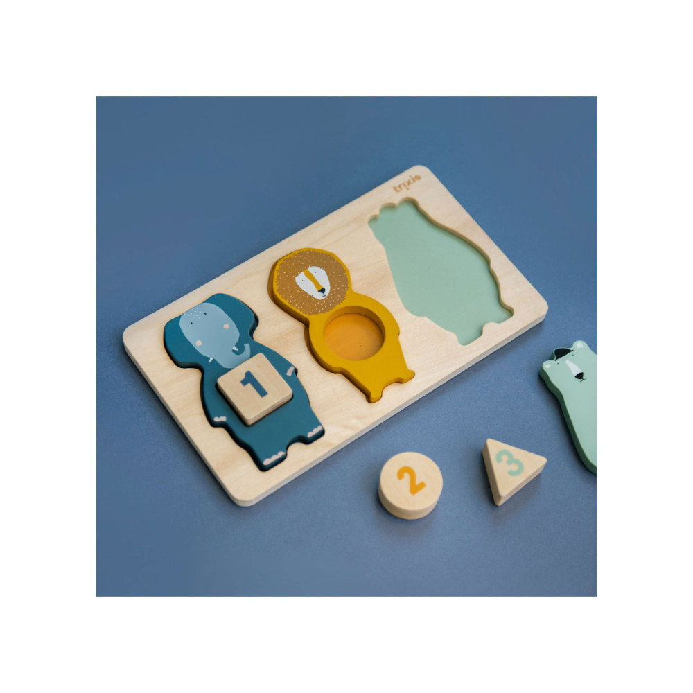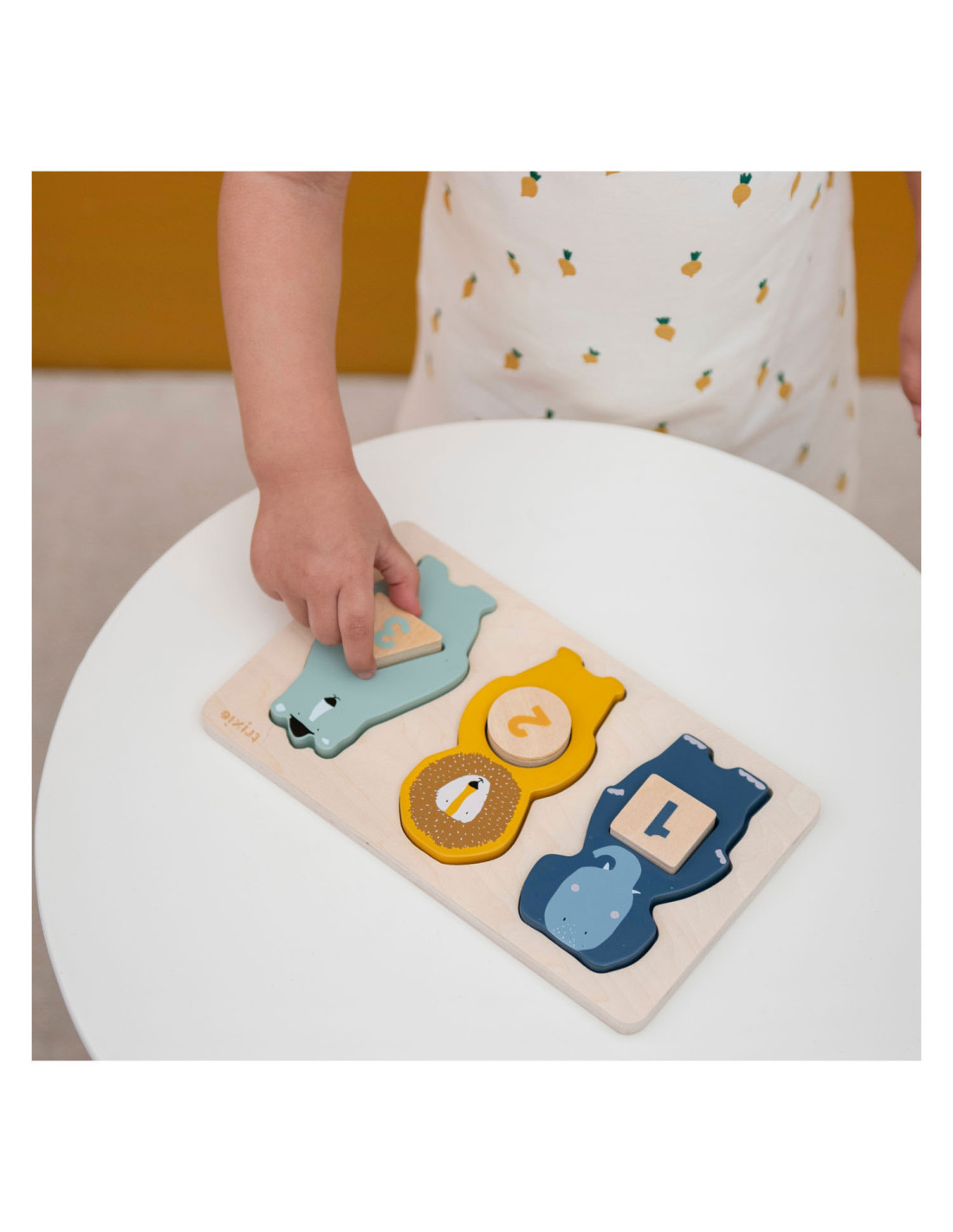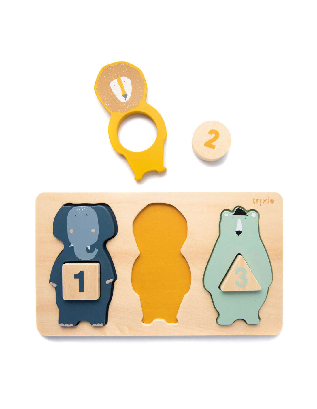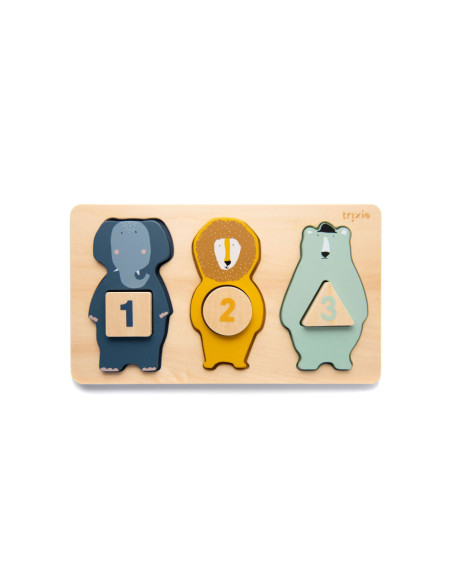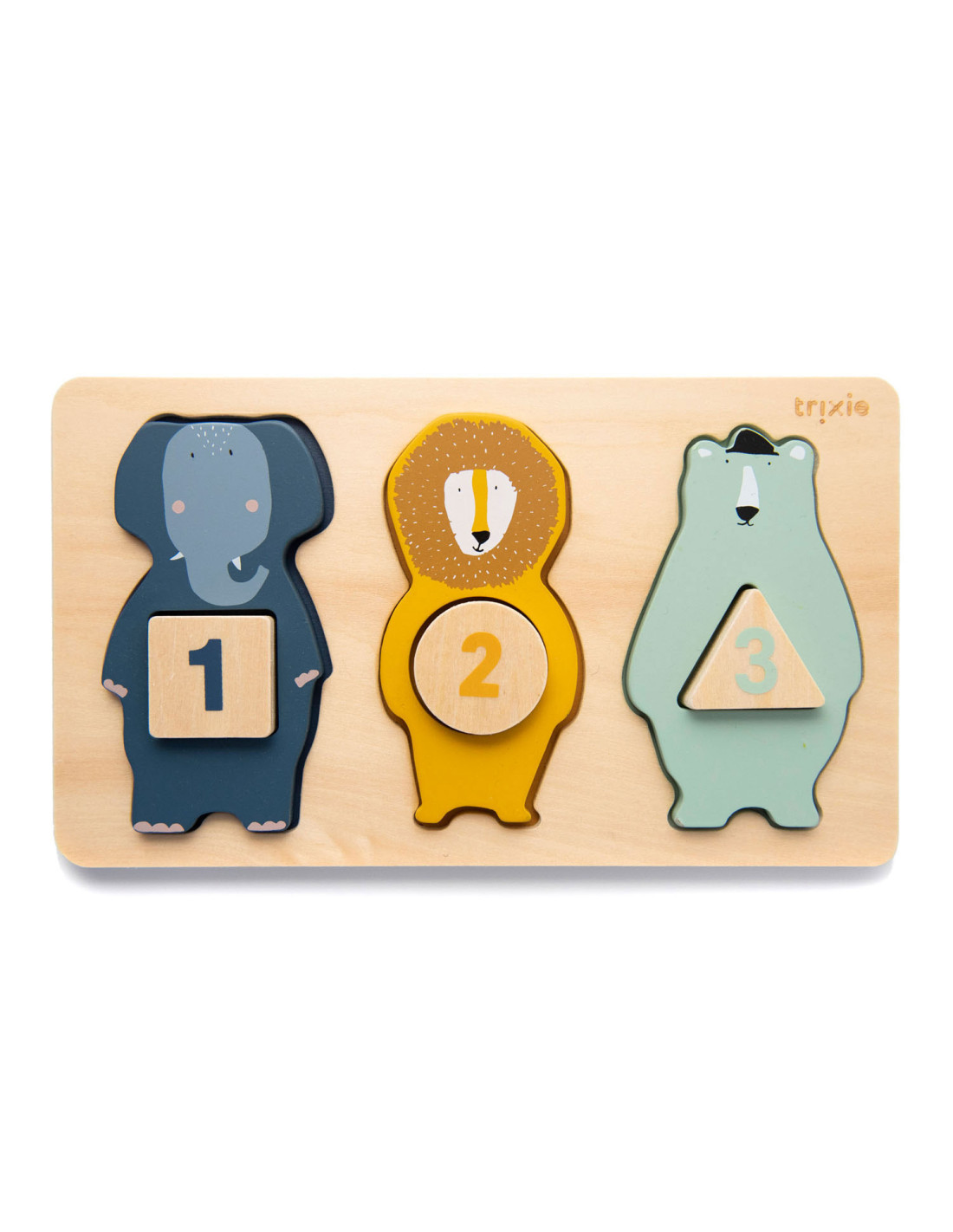 Leer tot drie tellen met deze leuke vrienden! Met deze puzzel kan je veel verschillende dingen ontdekken. Kinderen kunnen leren over kleuren, vormen, dieren en cijfers. De vele dikke puzzelstukken maken het voor kleine handjes gemakkelijk om ze vast te nemen, waardoor hun fijne motoriek gaandeweg verbetert. De puzzel en dieren zijn gemaakt van 100% FSC © gecertificeerd hout. Alle verven zijn op waterbasis en veilig voor baby's.