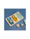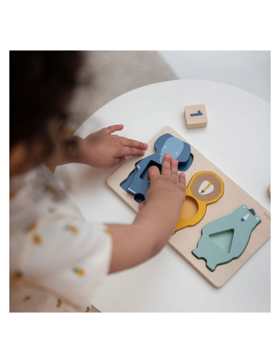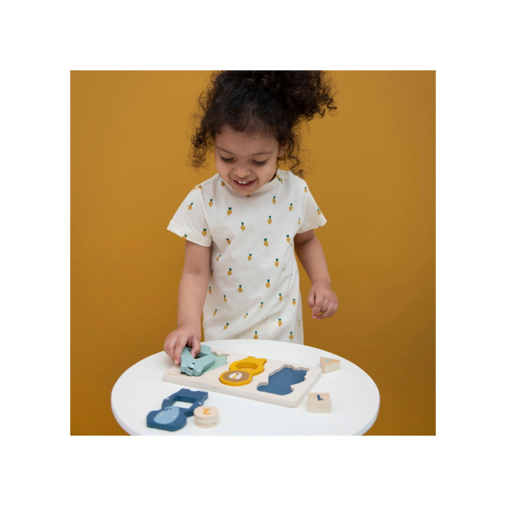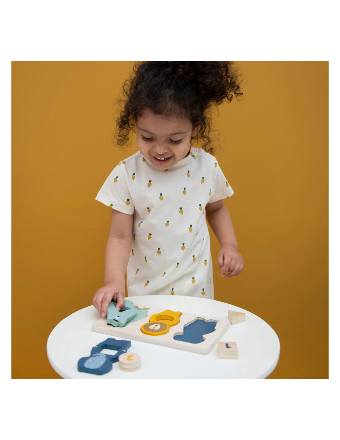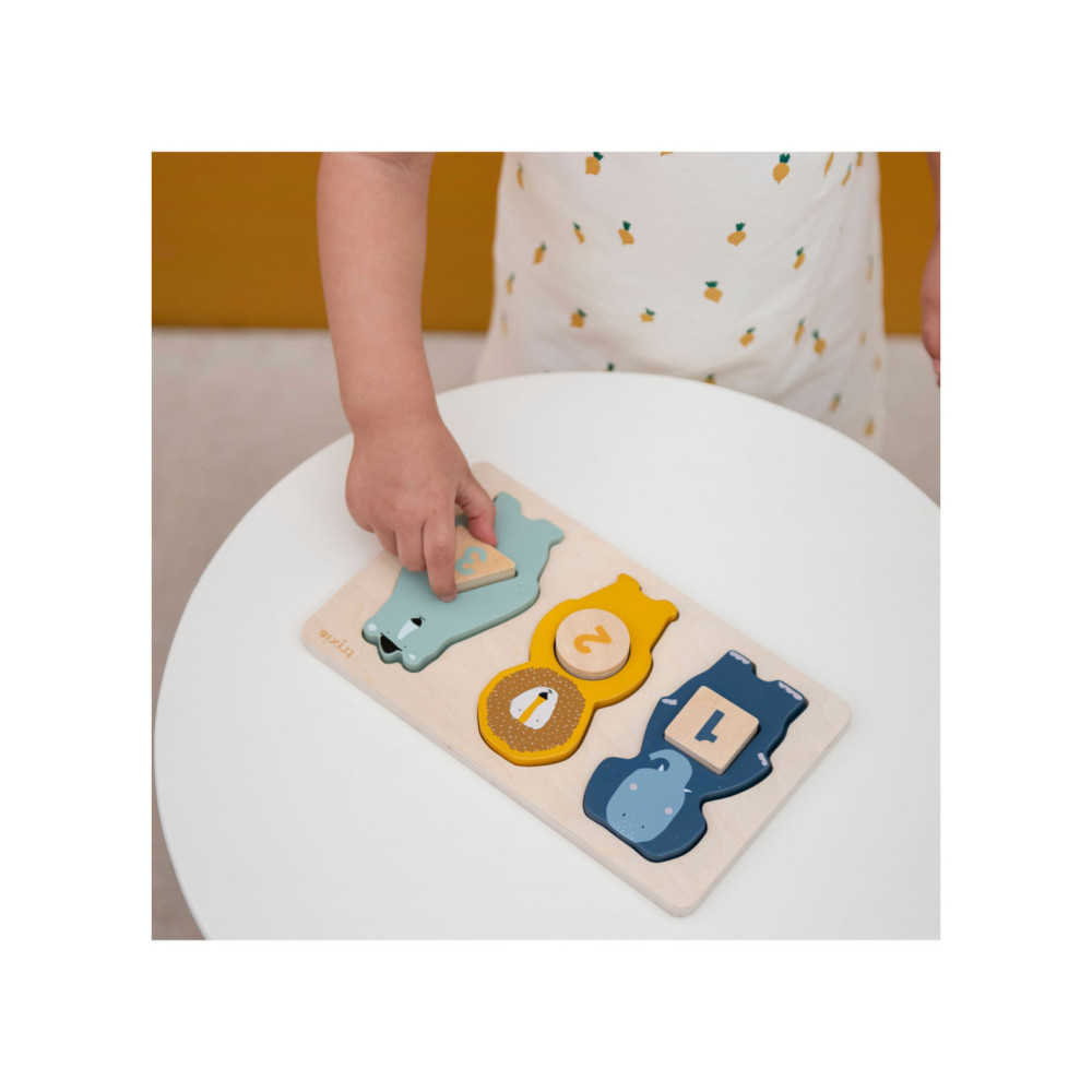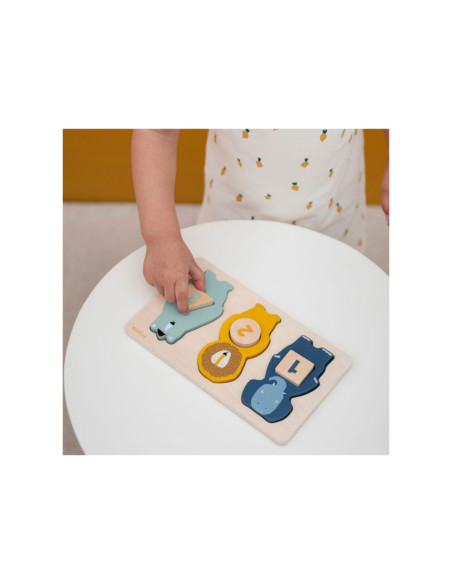 Leer tot drie tellen met deze leuke vrienden! Met deze puzzel kan je veel verschillende dingen ontdekken. Kinderen kunnen leren over kleuren, vormen, dieren en cijfers. De vele dikke puzzelstukken maken het voor kleine handjes gemakkelijk om ze vast te nemen, waardoor hun fijne motoriek gaandeweg verbetert. De puzzel en dieren zijn gemaakt van 100% FSC © gecertificeerd hout. Alle verven zijn op waterbasis en veilig voor baby's.