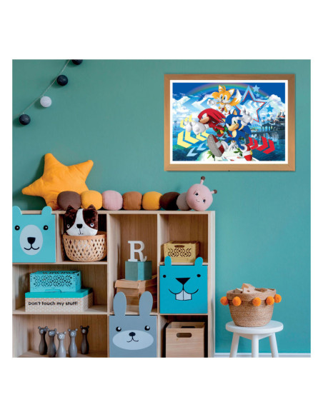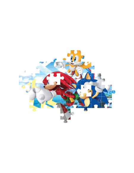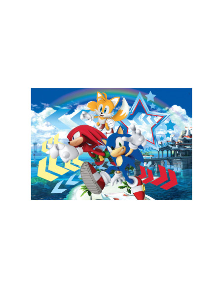 Kleurrijke Sonic-puzzel van 104 stukjes. Gelegd is de puzzel 38 x 27 cm groot. Adviesleeftijd: 6+