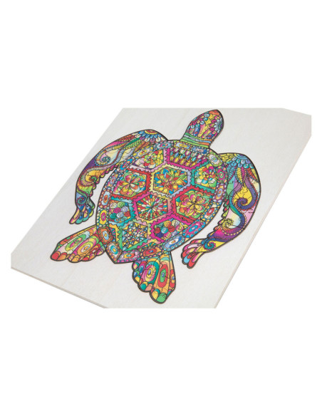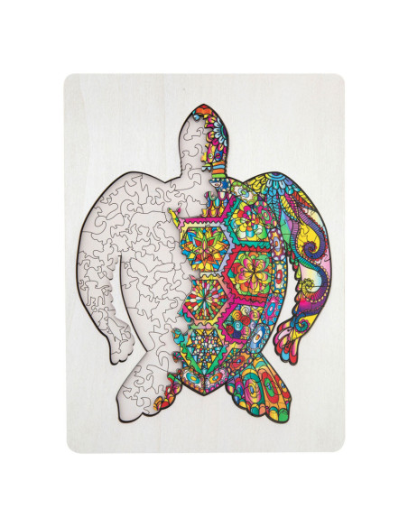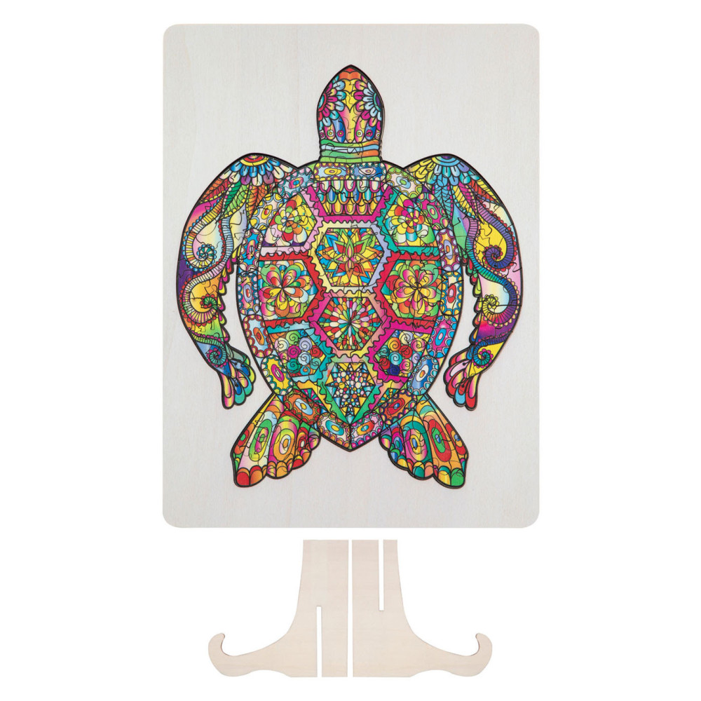 Houten Mozaïekpuzzel met Standaard in design van een Schildpad. De puzzel bestaat uit 130 uniekgevormde stukjes en is na afloop mooi neer te zetten op de meegeleverde houten standaard. Afmetingen: 30 x 22 centimeter. Geschikt vanaf 7 jaar.
