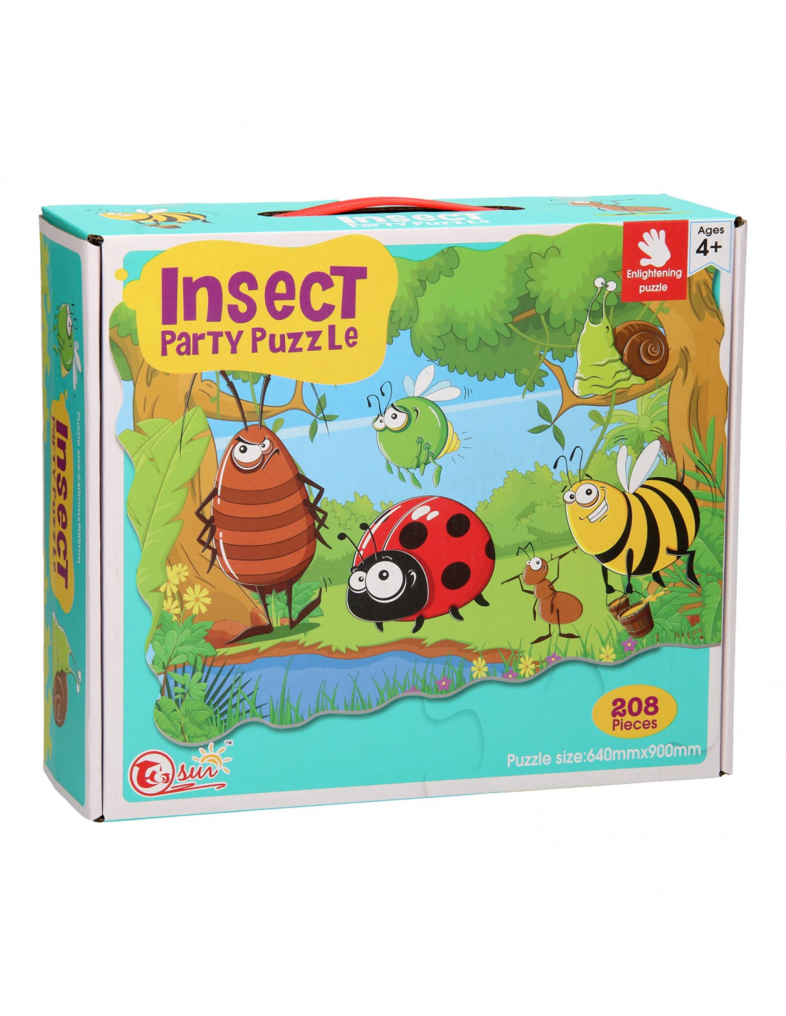 De Insect Party Puzzel bestaat uit 208 stukjes. Op de legpuzzel staat een vrolijke, kleurrijke afbeelding van een lieveheersbeest, bij en andere insecten. De puzzel is 90 x 64 cm. De Insect Party Puzzel zit in een stevige kartonnen doos met handig handvat.