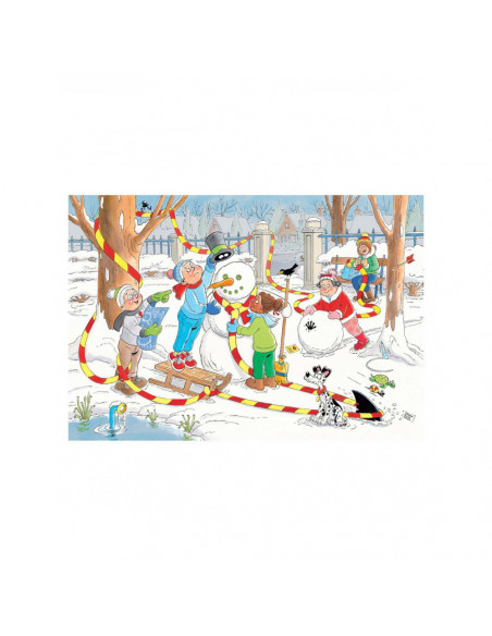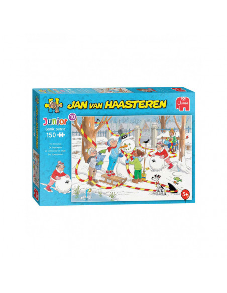 Het sneeuwt! De vrienden van Jan van Haasteren Junior gaan samen aan de slag om de beste sneeuwpop te maken. Maar passen ze wel op? De Haai gaat er met volle snelheid vandoor, en dit zou nog wel eens voor roet in het eten kunnen zorgen! Deze humoristische puzzel van 150 stukjes is geschikt voor kinderen vanaf 5 jaar.