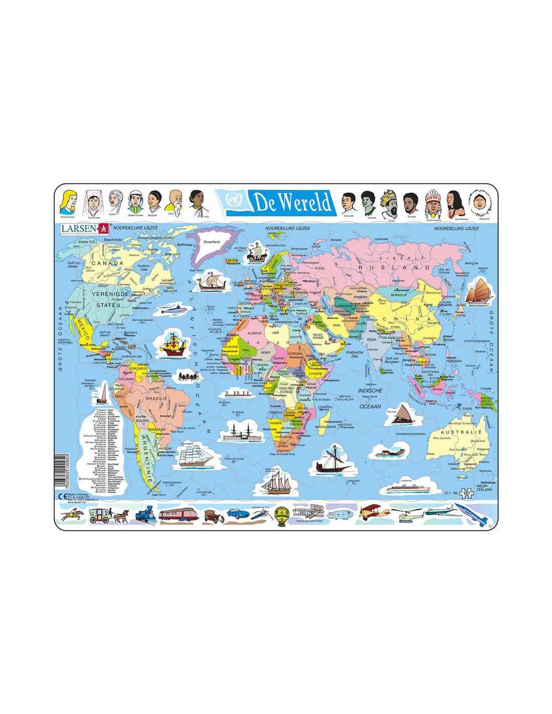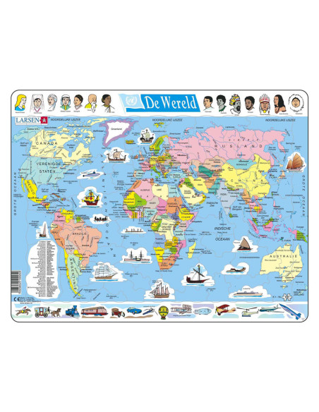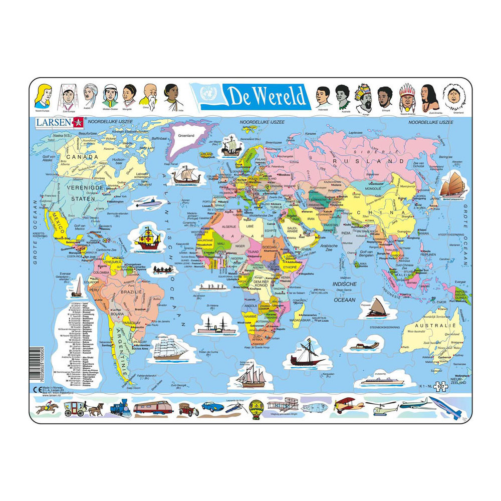 De puzzels van Larsen hebben een frame waarin de puzzelstukjes keer op keer makkelijk gelegd kunnen worden. De puzzelstukjes hebben elk een eigen unieke vorm die maar op één plek in het frame past. Doordat de totale dikte van het gerecyclede karton van de Larsen puzzels 4,4 mm dik is, gaat deze jaren mee. In het thema Larsen Land en Wereldkaarten' kun je de hele wereld, inclusief vlaggen al spelenderwijs leren. De perfecte manier om je topografie kennis naar een hoger niveau te brengen! Waarom Larsen? - De jongste kinderen ontwikkelen hun motoriek met de unieke puzzelstukjes. - Ook oudere kinderen spelen en leren veel over interessante thema's. - Originele thema's moedigen de kinderen aan en helpen hen zich te concentreren.- Extra dikke en stevige puzzelstukjes. - Gemaakt in Europa van gerecycled karton.