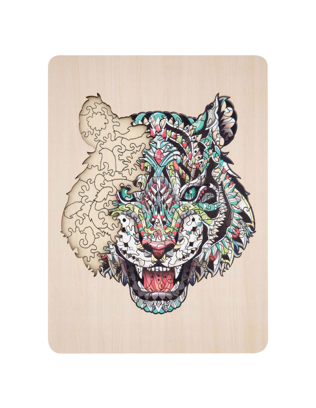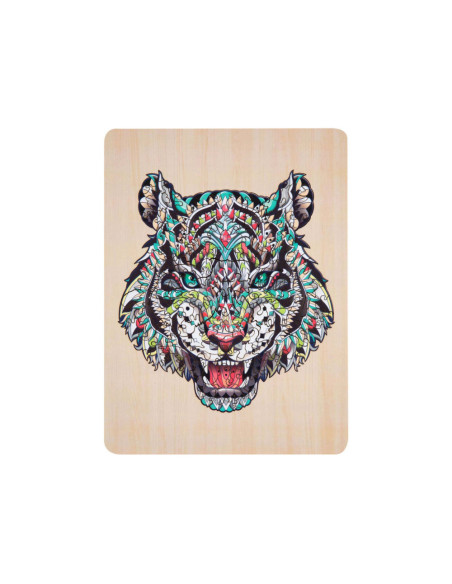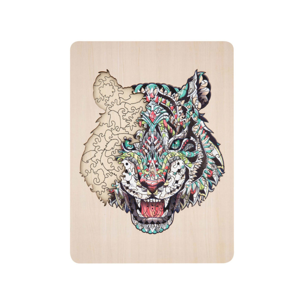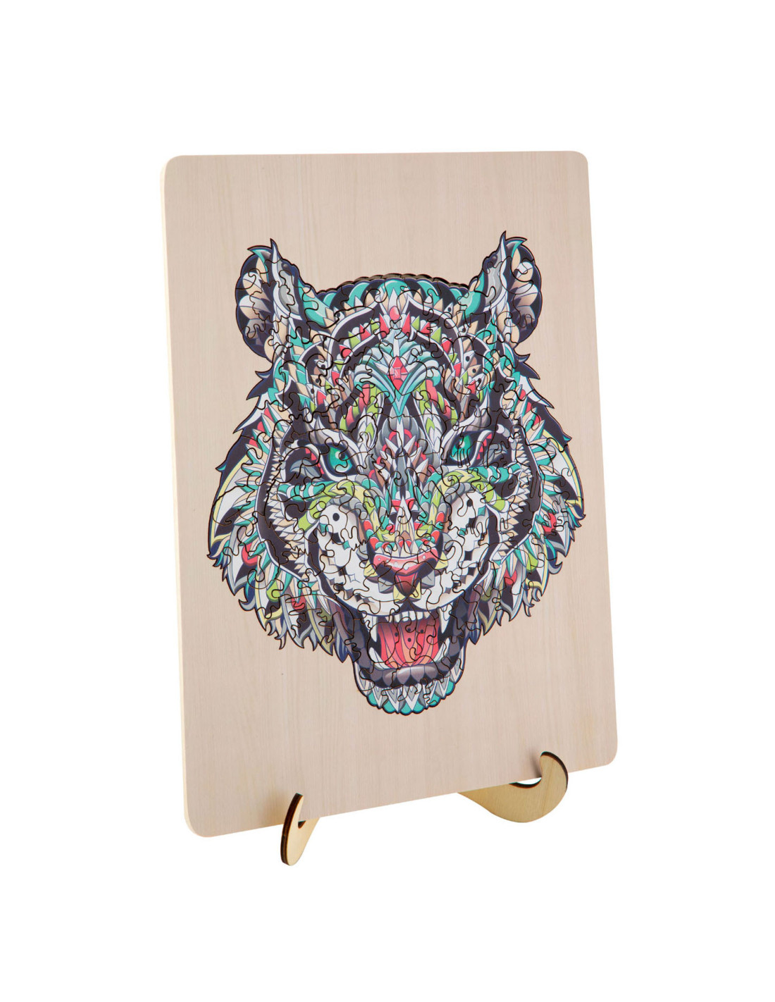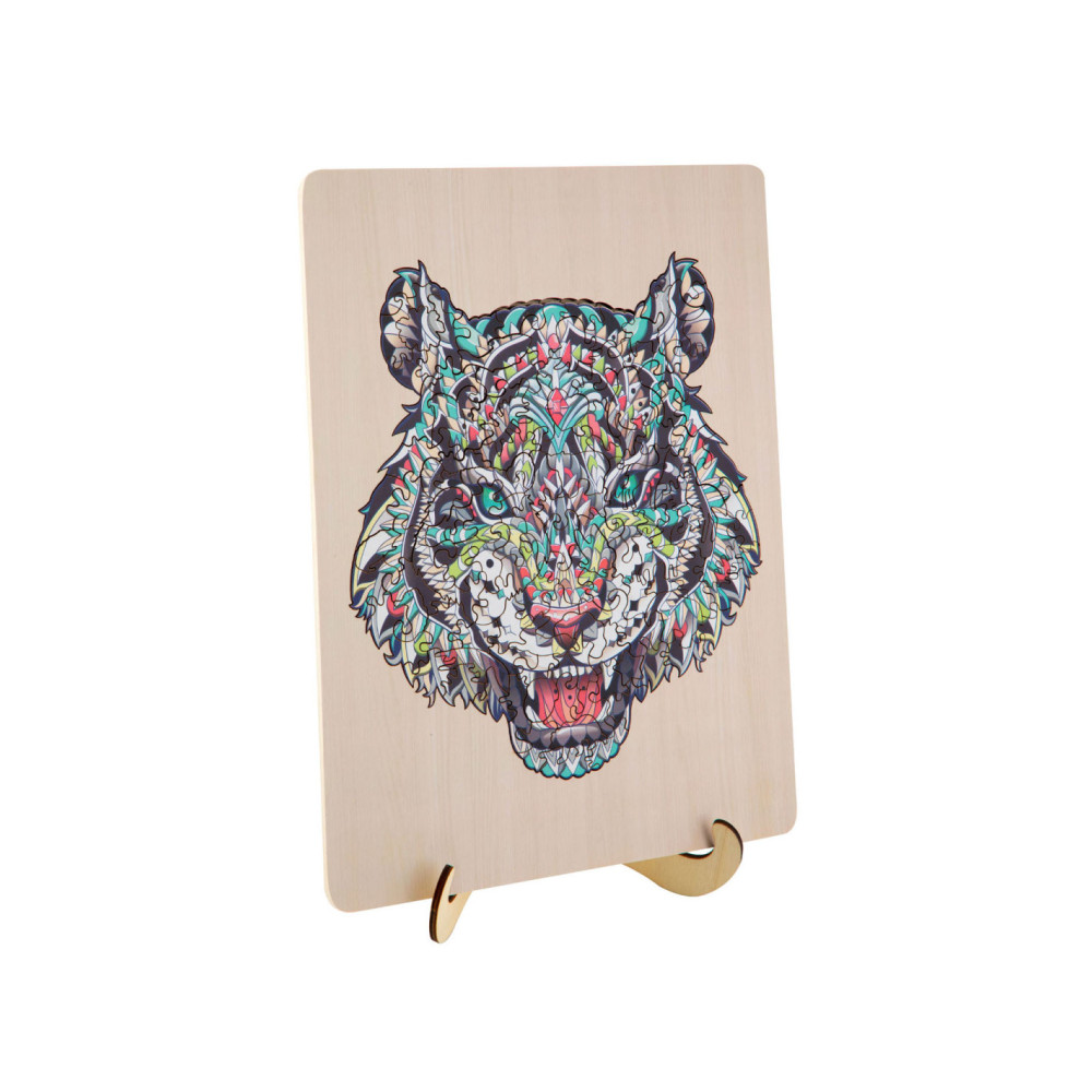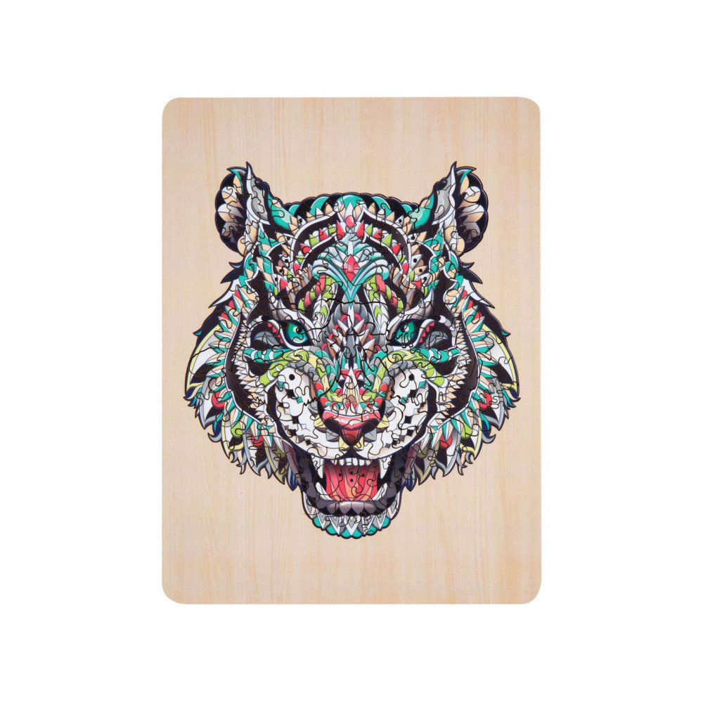 Prachtige houten puzzel van een grafisch vormgegeven tijger met allemaal unieke stukjes! Een échte uitdaging voor de geoefende puzzelaar.