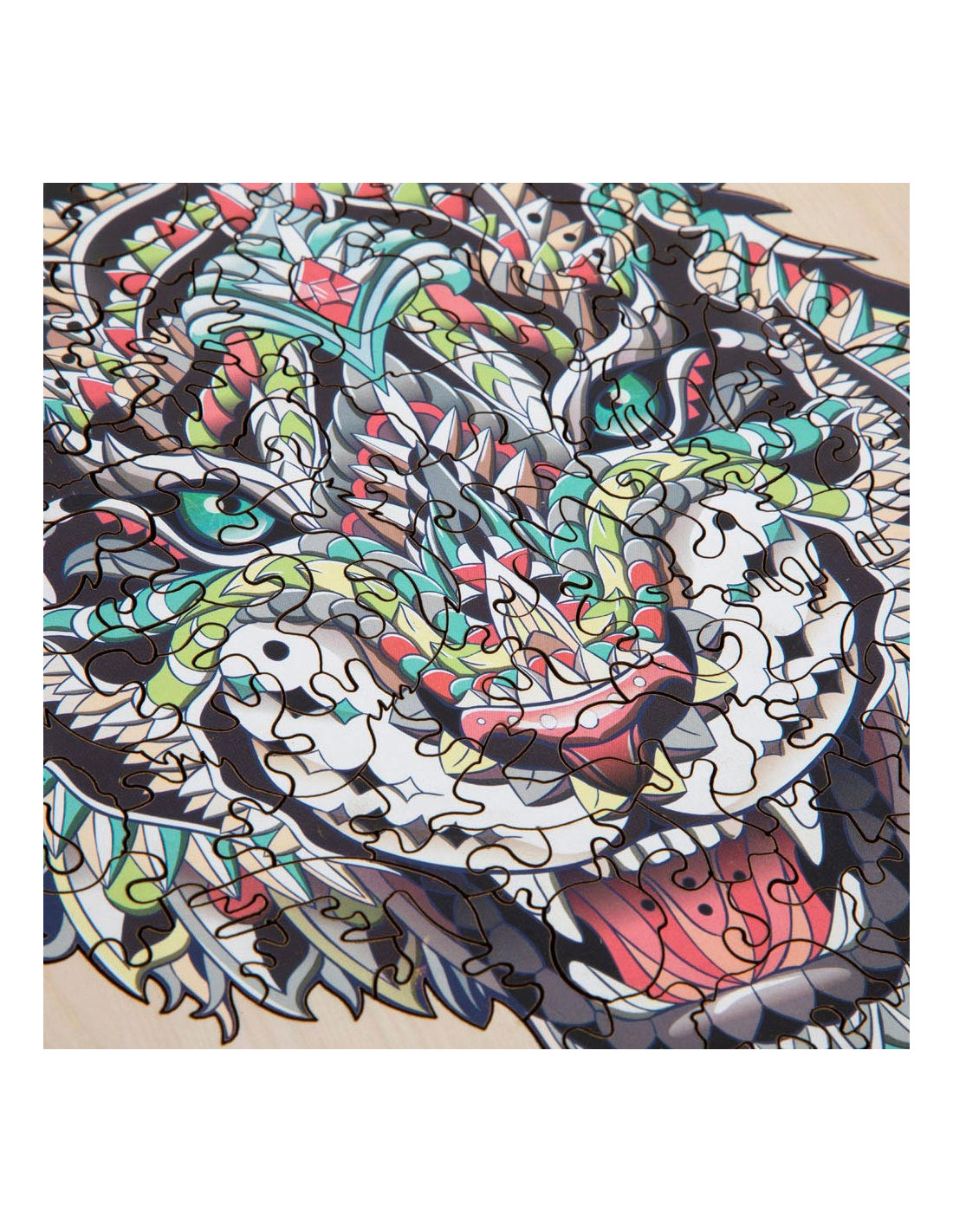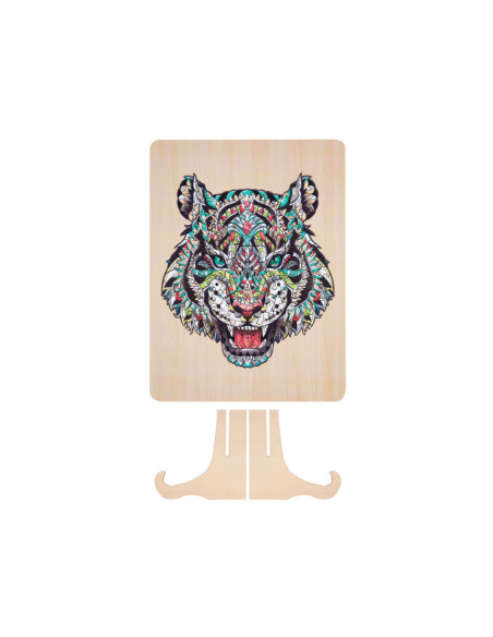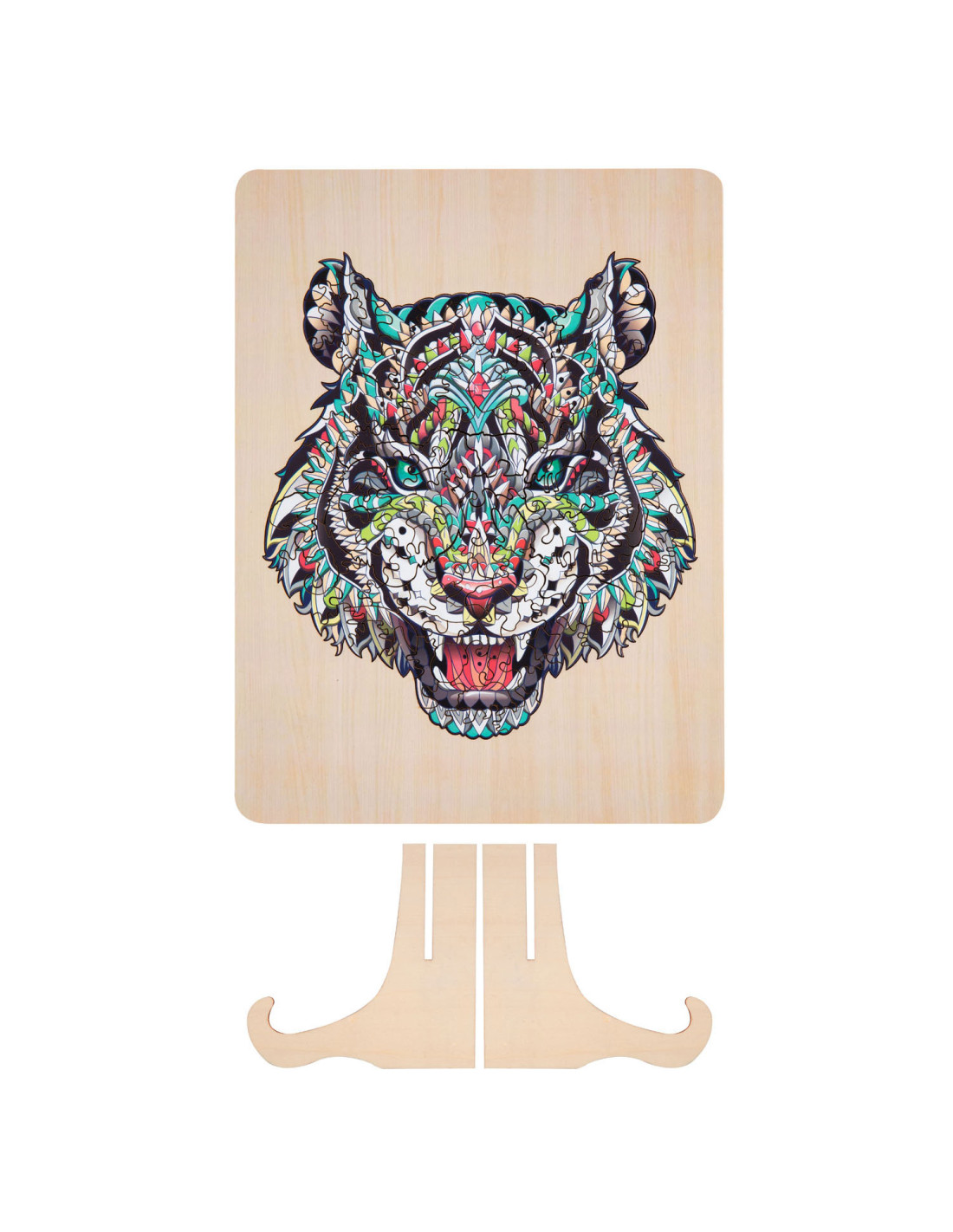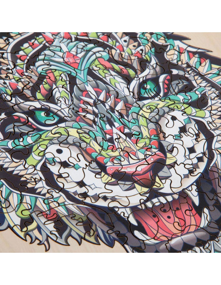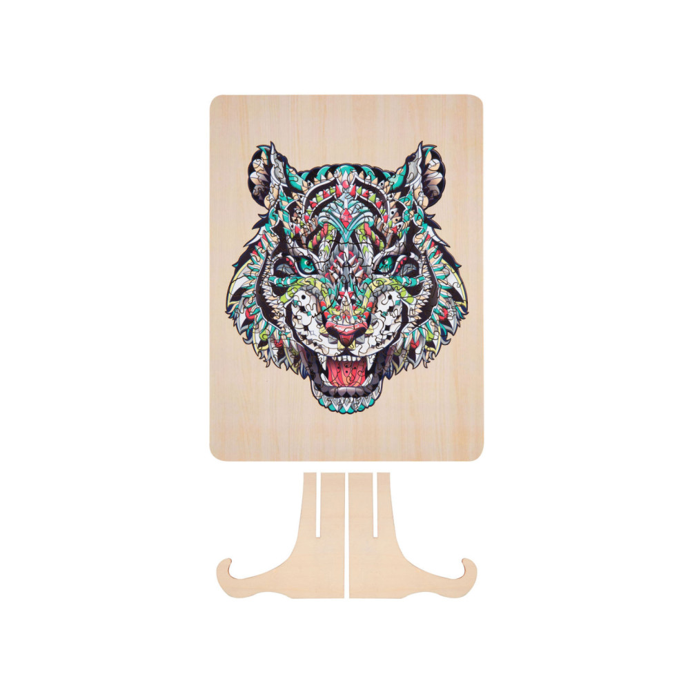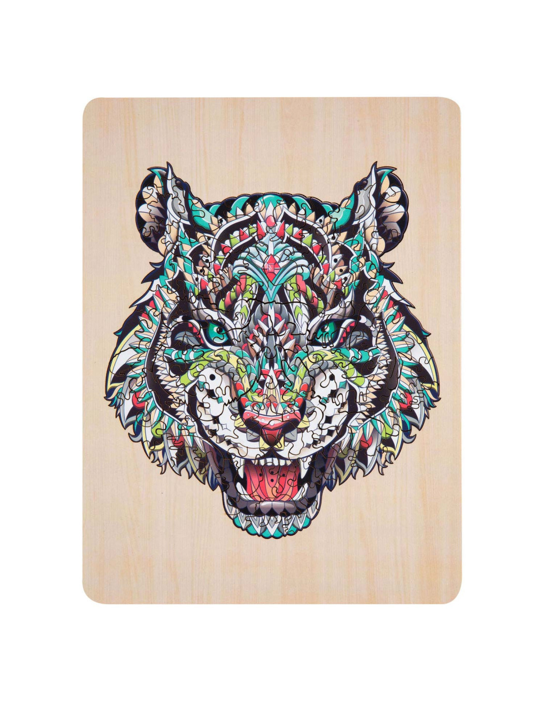 Prachtige houten puzzel van een grafisch vormgegeven tijger met allemaal unieke stukjes! Een échte uitdaging voor de geoefende puzzelaar.