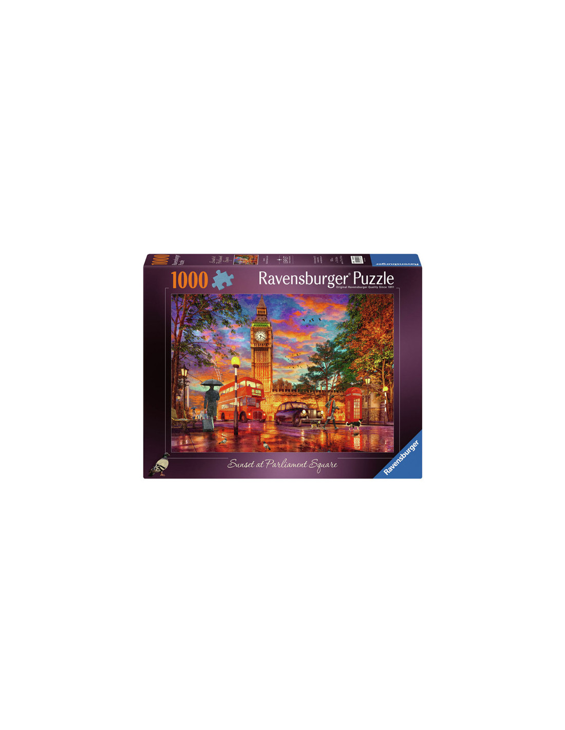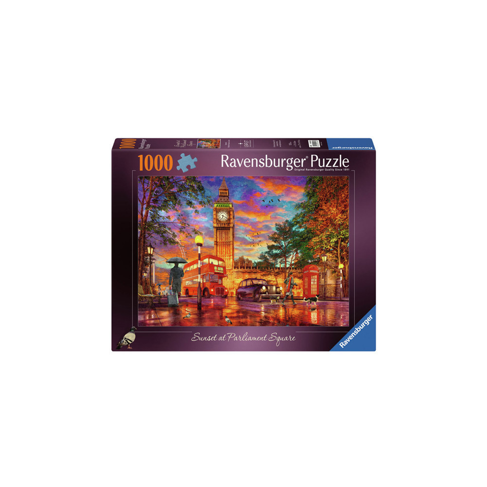 Ontsnap uit de realiteit en stap in de wereld van Ravensburger puzzels. Deze Ravensburger puzzel van 1000 stukjes is geschikt voor zowel beginnende als ervaren puzzelaars. En omdat onze geliefde puzzels een standaard formaat hebben, kun je het resultaat inlijsten en ophangen. Dankzij de met de hand gemaakte stansmessen is de vormvariatie van de stukjes oneindig. Jong en oud zullen genieten van deze Zonsondergang op Parliament Square, Londen puzzel met 1000 stukjes.