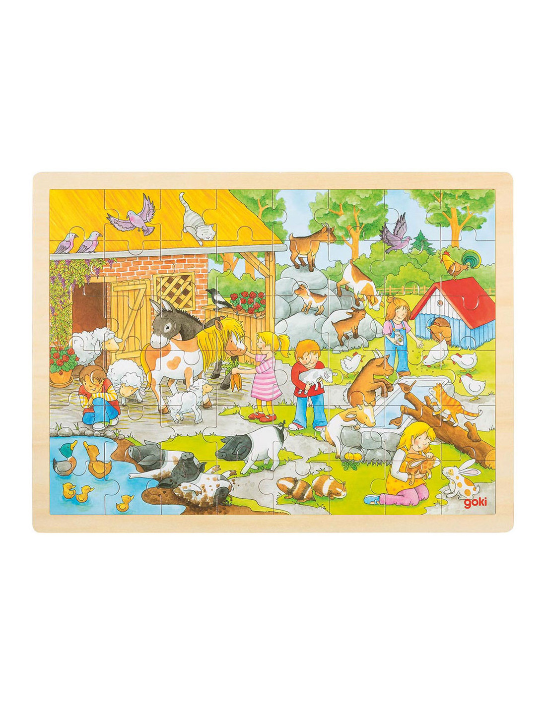 Houten kinderboerderij puzzel van Goki. De puzzel bestaat uit 48 stukjes en is geschikt voor kinderen vanaf 3 jaar. Afmeting: 40 x 30 centimeter.