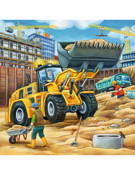 Op de bouwplaats is altijd iets te beleven! Overal wordt gewerkt en de grote bouwvoertuigen rijden af en aan. De stoere graafmachine, cementwagen en shovel kunnen alles aan!