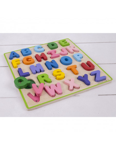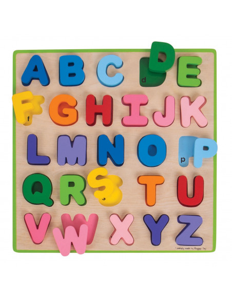 Leer het herkennen van letters met deze houten alfabet puzzel. Leg de juiste letter op de juiste plaats. De 26 puzzelstukjes zijn gemaakt van hout en hebben vrolijke kleuren. De puzzelstukken zijn extra dik. Geschikt voor kinderen vanaf 18 maanden.