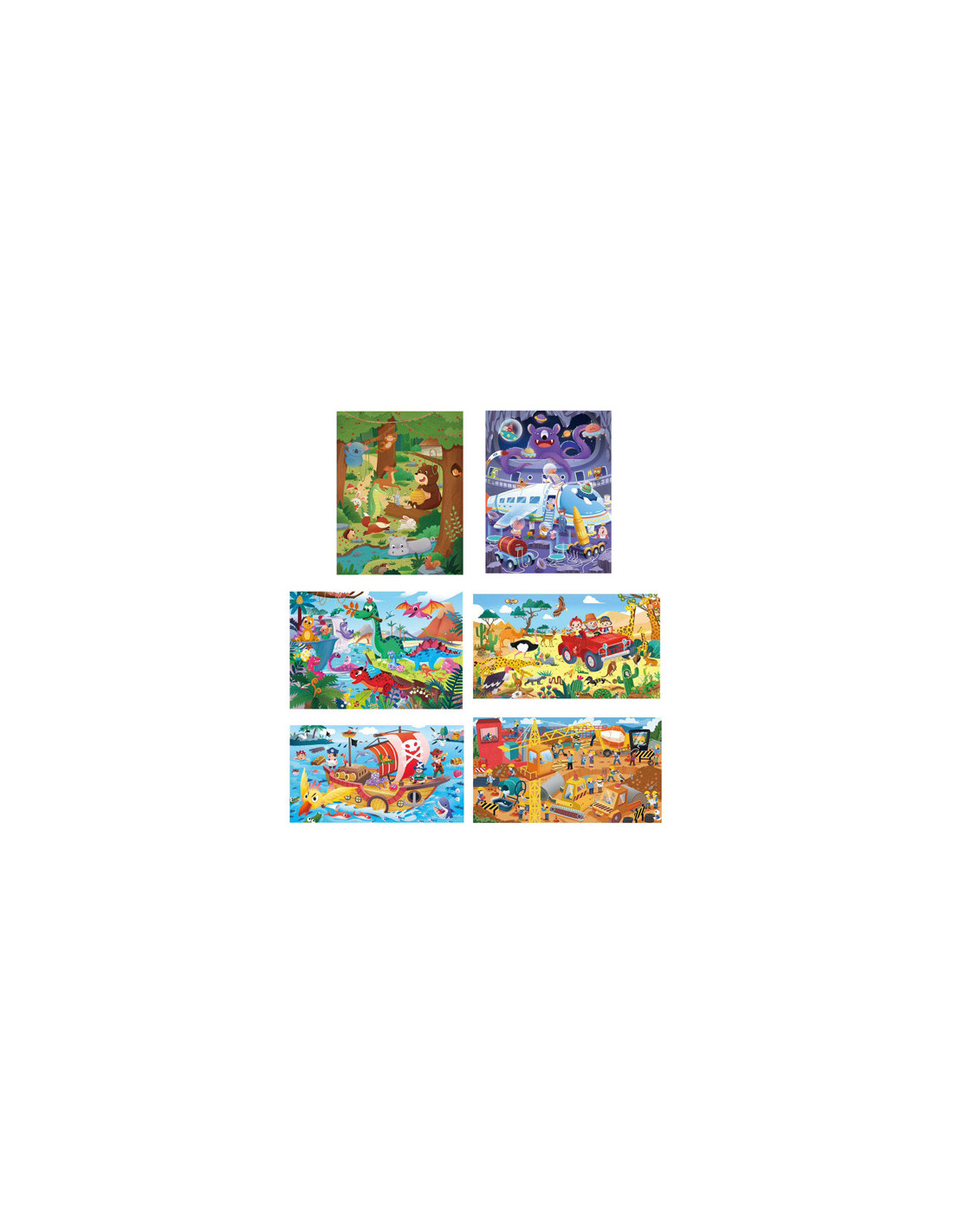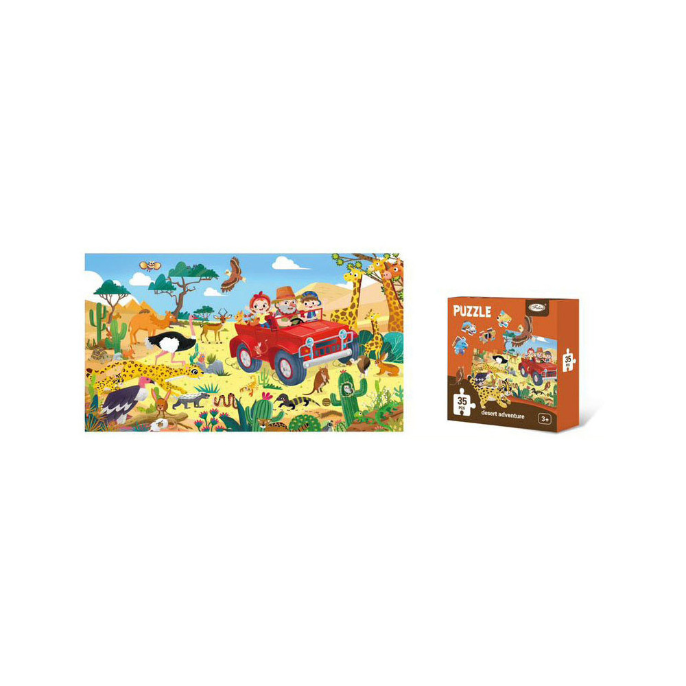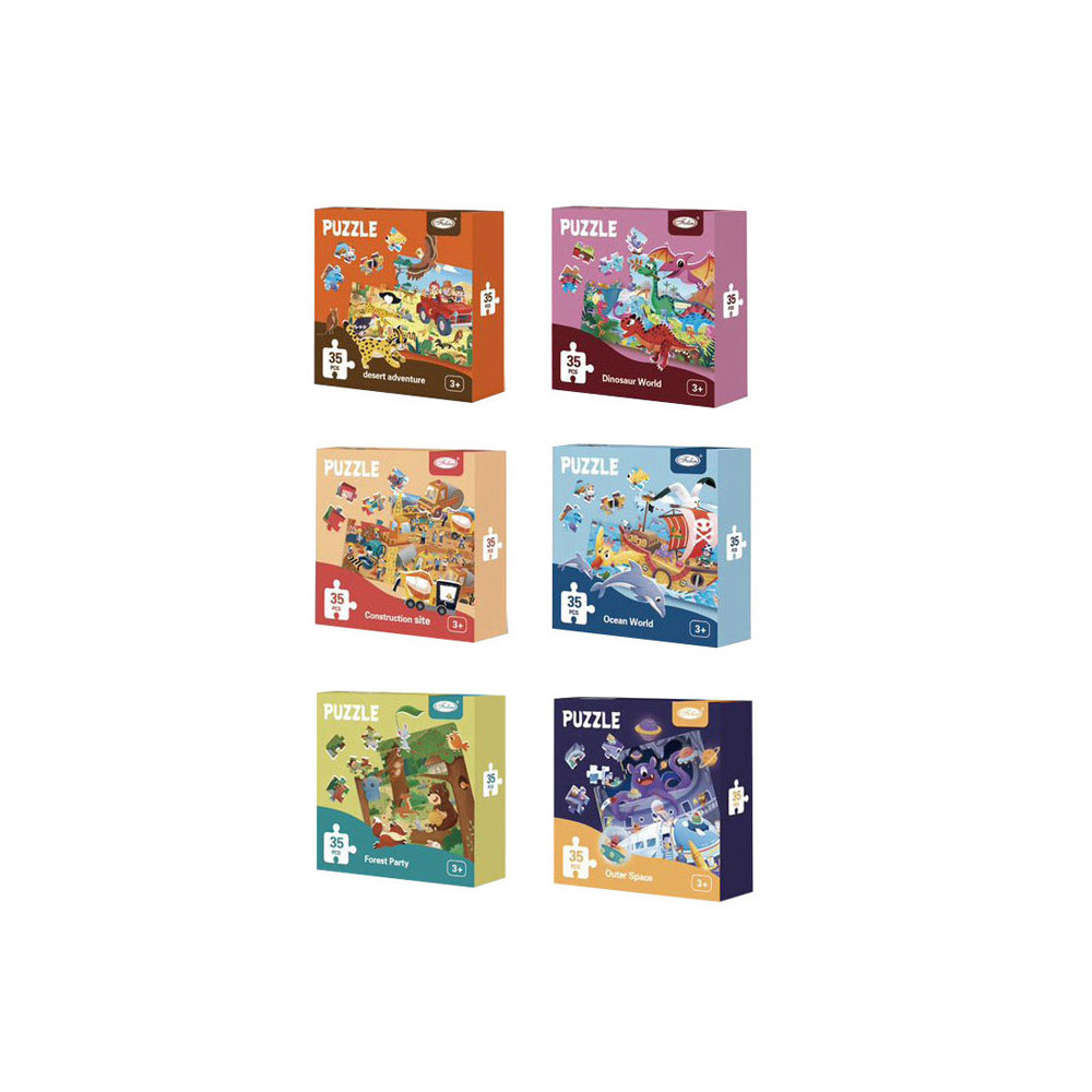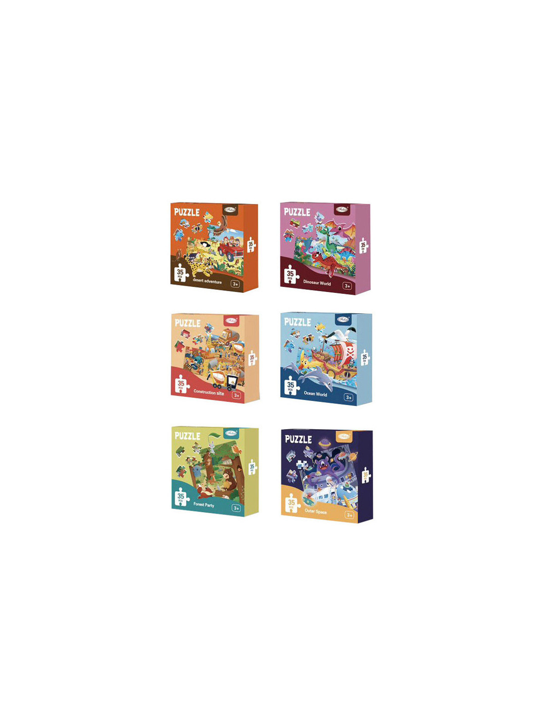 Kleurrijke puzzel van 21,4 x 15,4 centimeter groot. De puzzel heeft 35 stukjes en wordt geleverd in 6 verschillende designs: safari, bouwplaats, dino, piraat, bos en ruimteraket. Geschikt vanaf 3 jaar.