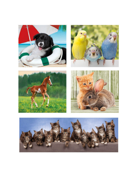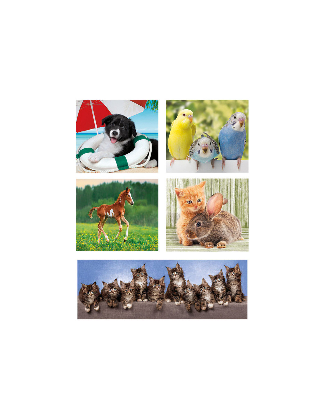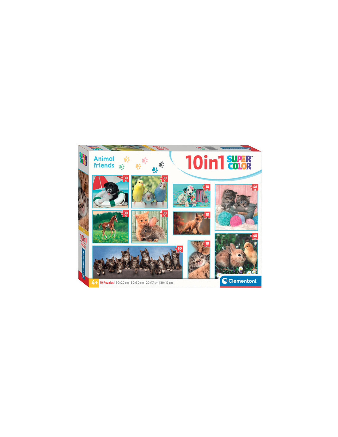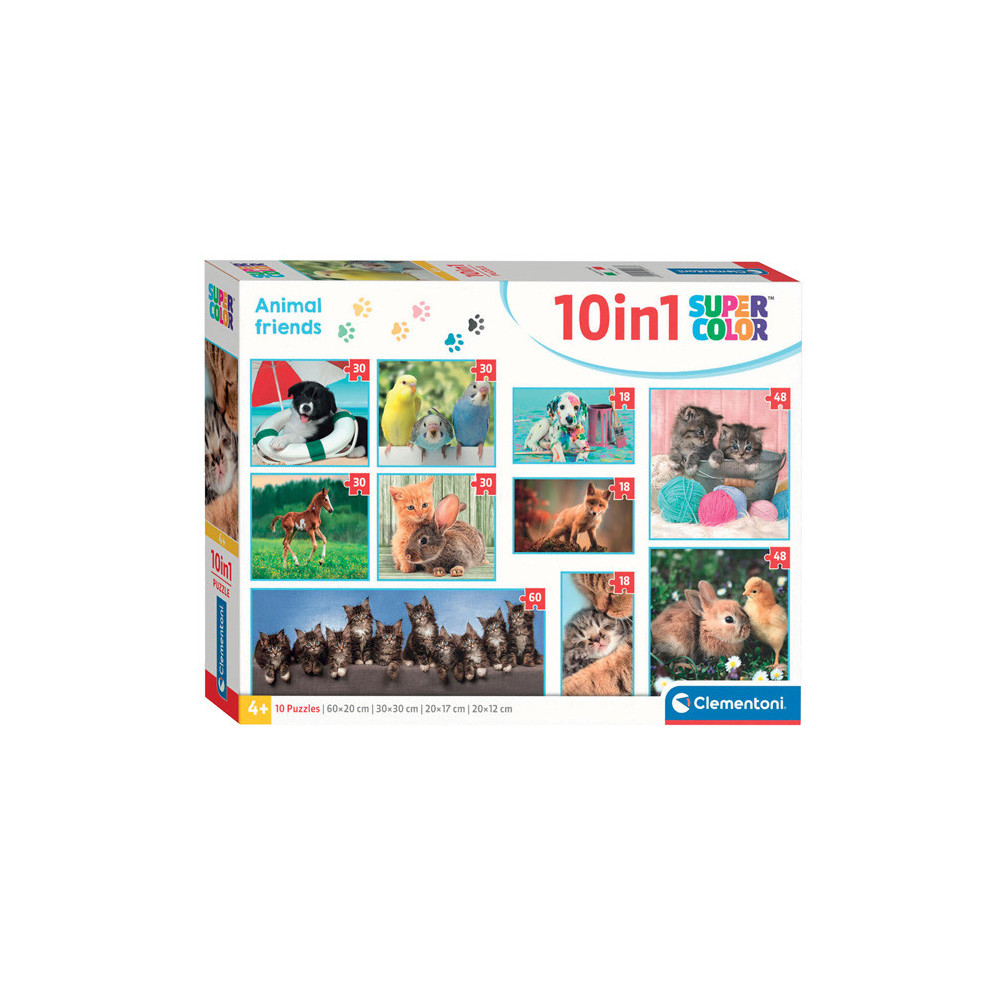 10 in 1 puzzel van Clementoni, met verschillende aantal stukjes (18, 30, 48 en 60 stukjes). Op elke puzzel staat een andere afbeelding van schattige babydieren afgebeeld, zoals puppy's, kittens, een veulen, konijntjes en een vosje. Geschikt voor kinderen vanaf 4 jaar oud.