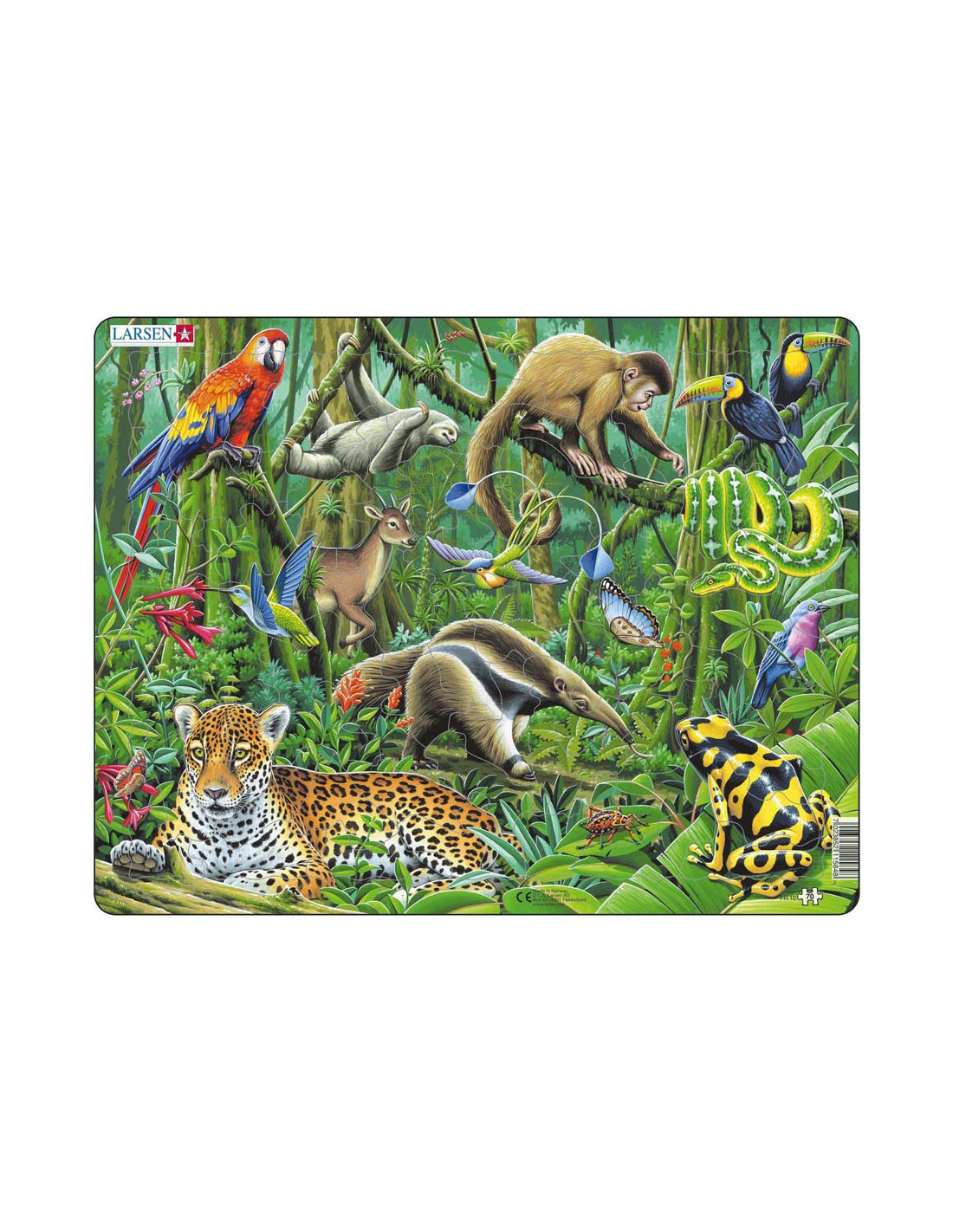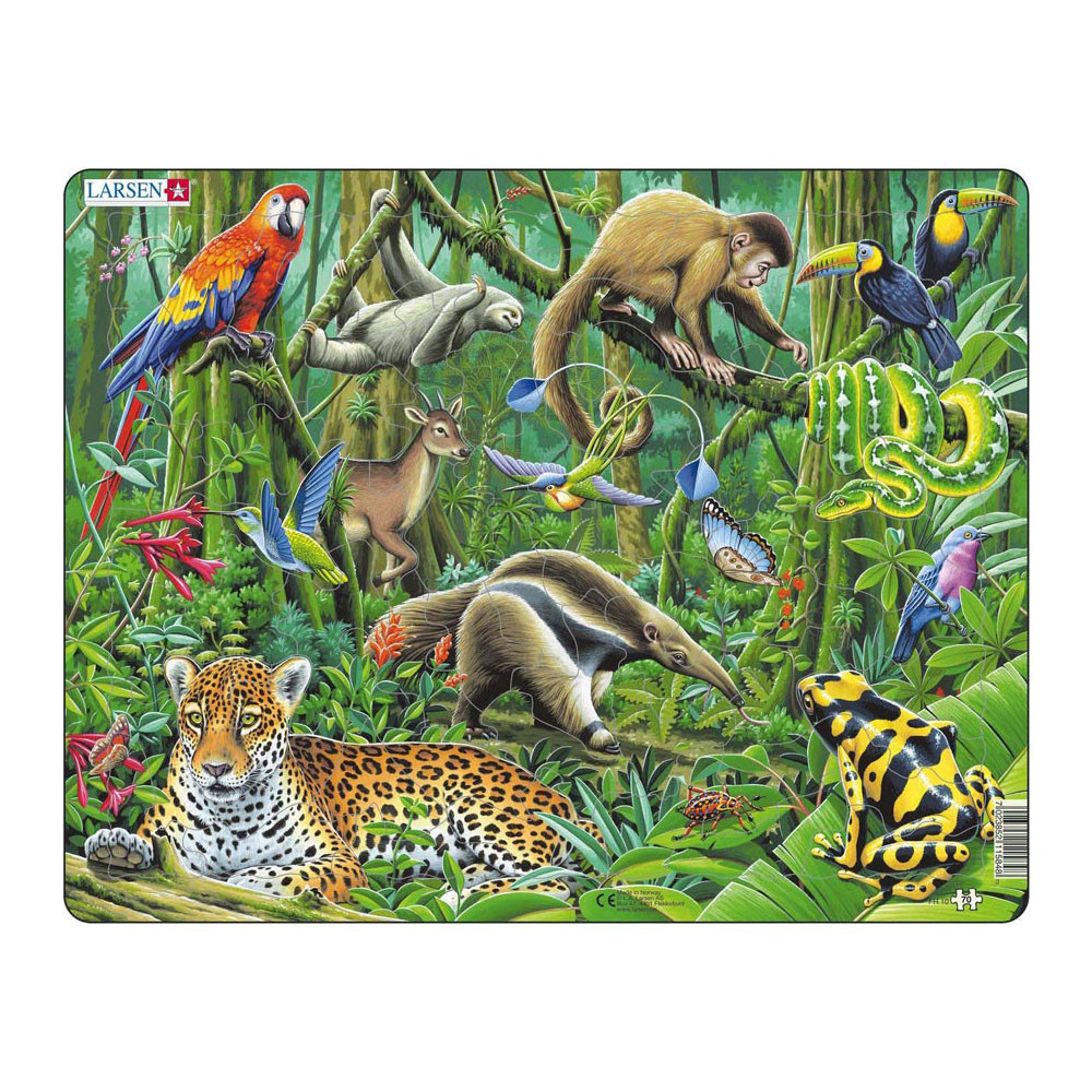 De puzzels van Larsen hebben een frame waarin de puzzelstukjes keer op keer makkelijk gelegd kunnen worden. De puzzelstukjes hebben elk een eigen unieke vorm die maar op één plek in het frame past. Doordat de totale dikte van het gerecyclede karton van de Larsen puzzels 4,4 mm dik is, gaat deze jaren mee. In het thema Larsen Dieren Puzzels' zijn de dieren van over de hele wereld te vinden. Leer alle dieren spelenderwijs kennen! Waarom Larsen? - De jongste kinderen ontwikkelen hun motoriek met de unieke puzzelstukjes. - Ook oudere kinderen spelen en leren veel over interessante thema's. - Originele thema's moedigen de kinderen aan en helpen hen zich te concentreren.- Extra dikke en stevige puzzelstukjes. - Gemaakt in Europa van gerecycled karton.