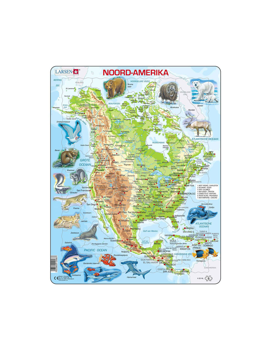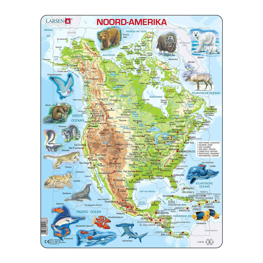 De puzzels van Larsen hebben een frame waarin de puzzelstukjes keer op keer makkelijk gelegd kunnen worden. De puzzelstukjes hebben elk een eigen unieke vorm die maar op één plek in het frame past. Doordat de totale dikte van het gerecyclede karton van de Larsen puzzels 4,4 mm dik is, gaat deze jaren mee. In het thema Larsen Land en Wereldkaarten' kun je de hele wereld, inclusief vlaggen al spelenderwijs leren. De perfecte manier om je topografie kennis naar een hoger niveau te brengen! Waarom Larsen? - De jongste kinderen ontwikkelen hun motoriek met de unieke puzzelstukjes. - Ook oudere kinderen spelen en leren veel over interessante thema's. - Originele thema's moedigen de kinderen aan en helpen hen zich te concentreren. - Extra dikke en stevige puzzelstukjes. - Gemaakt in Europa van gerecycled karton.
