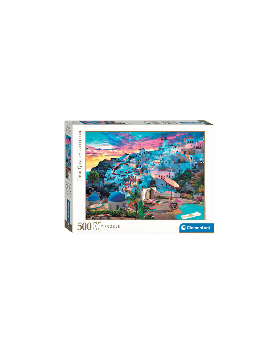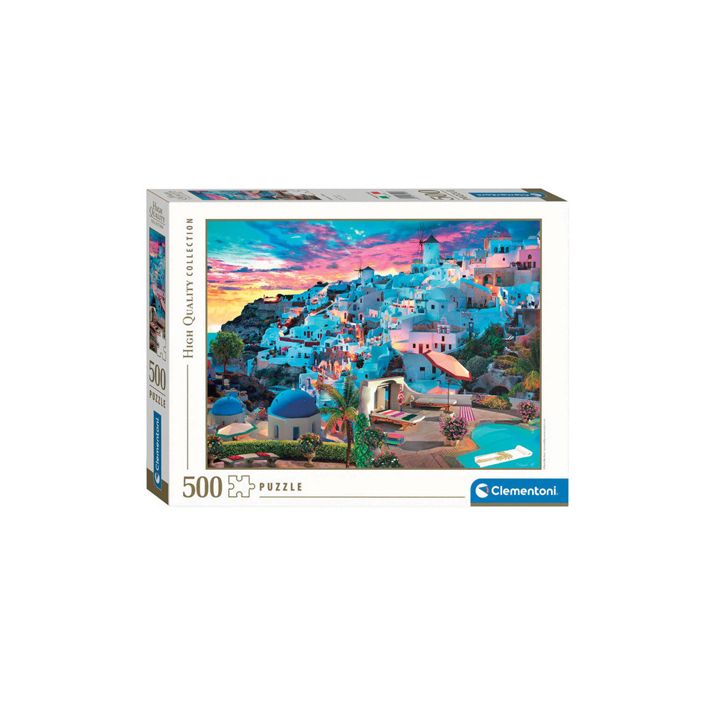 Puzzel van 500 stukjes met een prachtige, idyllische afbeelding van het dorpje Santorini in Italië. Gelegd is de puzzel 36 x 49 centimeter groot. Clementoni gebruikt ecologisch verantwoordelijk, gerecyclede materialen om daarmee vervuilende componenten te vermijden. Gemaakt in Italië.
