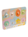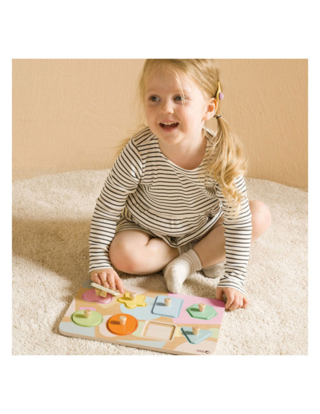 Deze houten vormen-penpuzzel van stapelspeelgoed met extra dik puzzelbord in verschillende geometrische vormen en pastelkleuren. Laat uw kind platte geometrische figuren herkennen door te kijken en te voelen. Wanneer kinderen proberen om vormpuzzels te matchen met het doel of combinaties te maken, helpt het om vroege vorm- en kleuronderscheidingsvaardigheden op te bouwen.