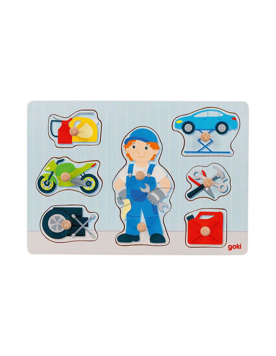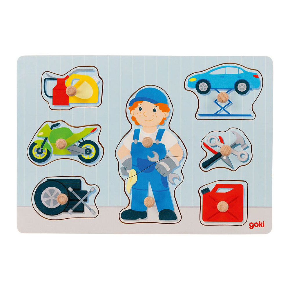 Extra grote knoppen en kindvriendelijke afbeeldingen maken deze puzzel ideaal als jouw eerste puzzel. Bestaat uit 7 stukken met verschillende voertuigen, gereedschap en een monteur.