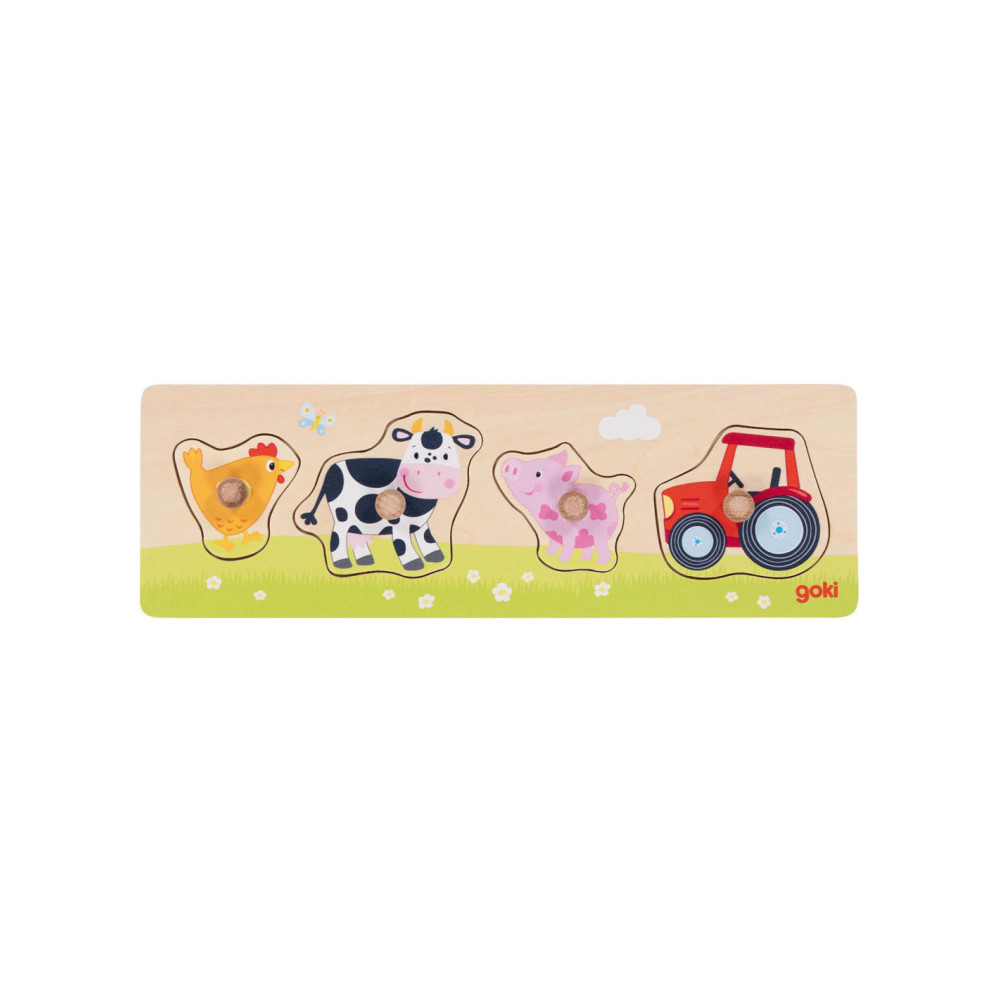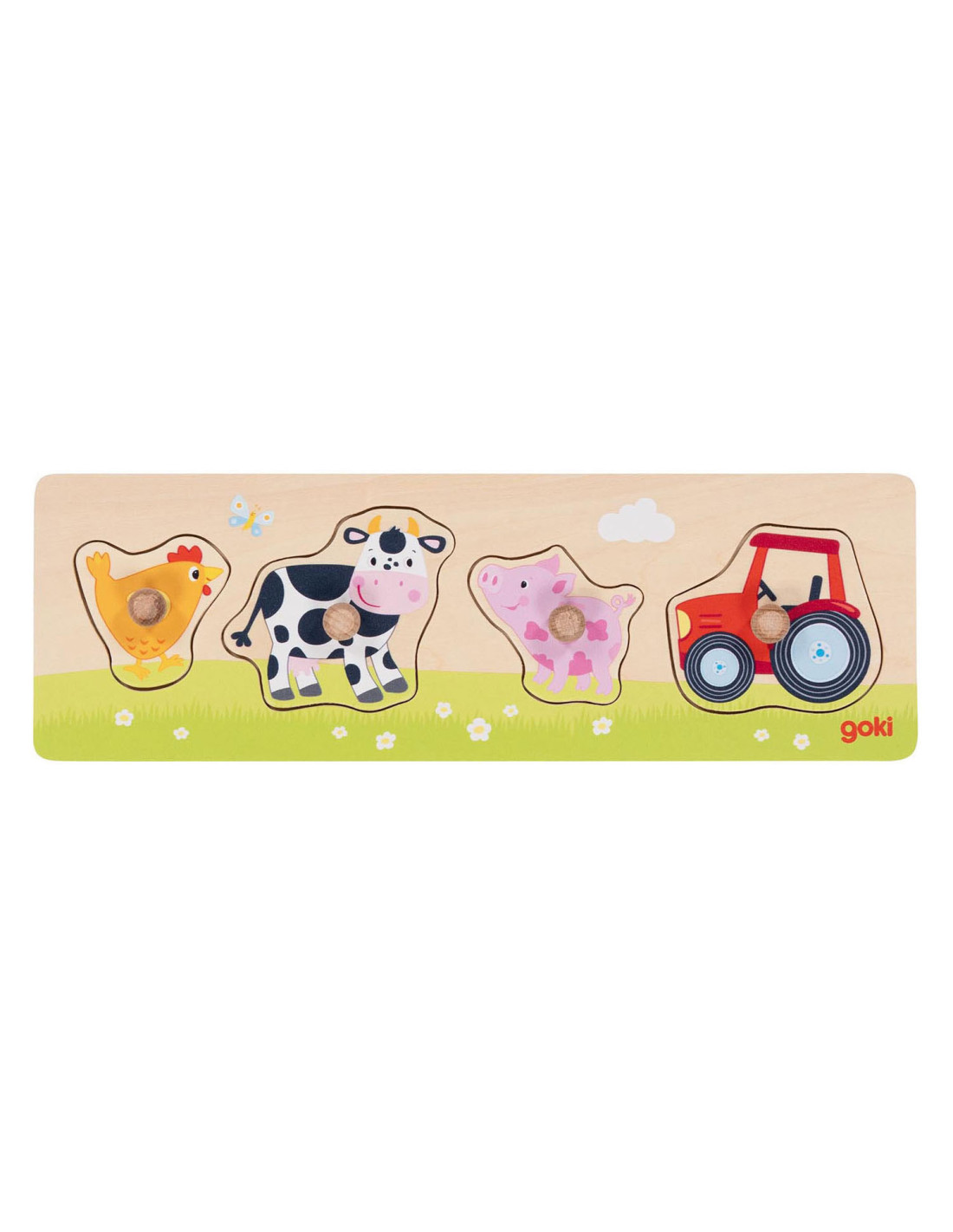 Houten noppenpuzzel van Goki met 4 stukken. De 4 stukjes zijn een kip, koe, varken en een tractor. De puzzel is 30 x 10 x 2,4 centimeter groot en geschikt voor kinderen vanaf 12 maanden.