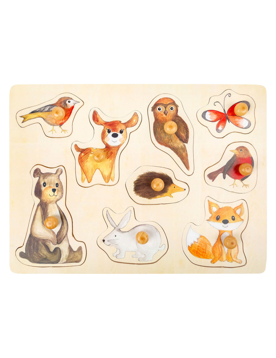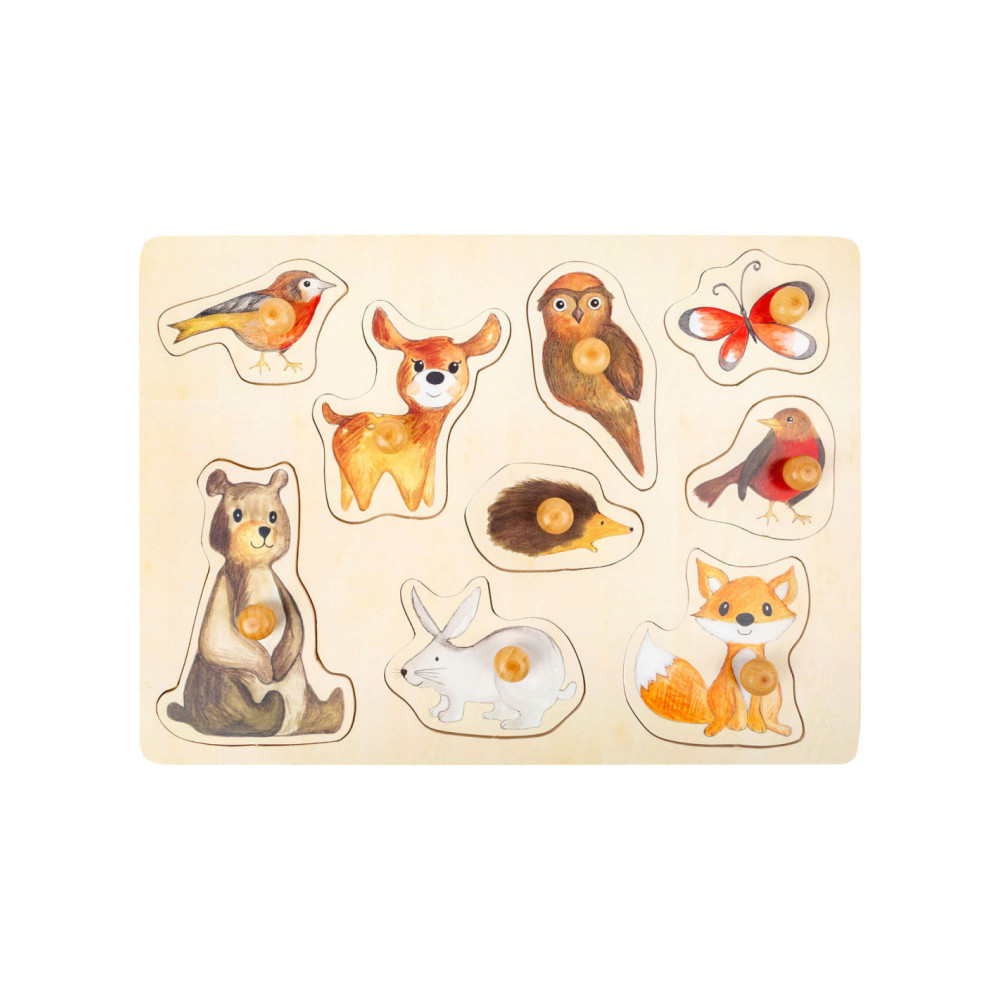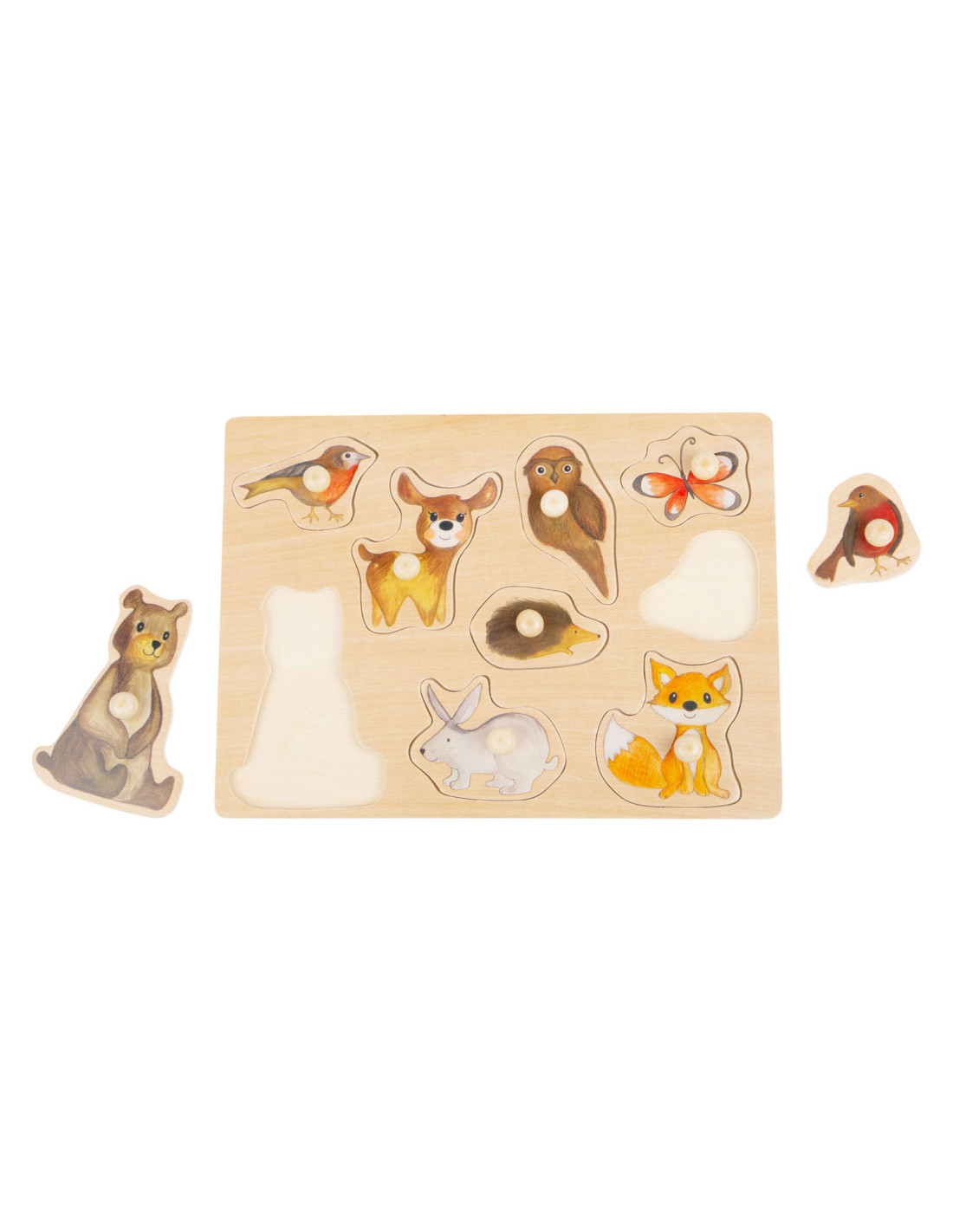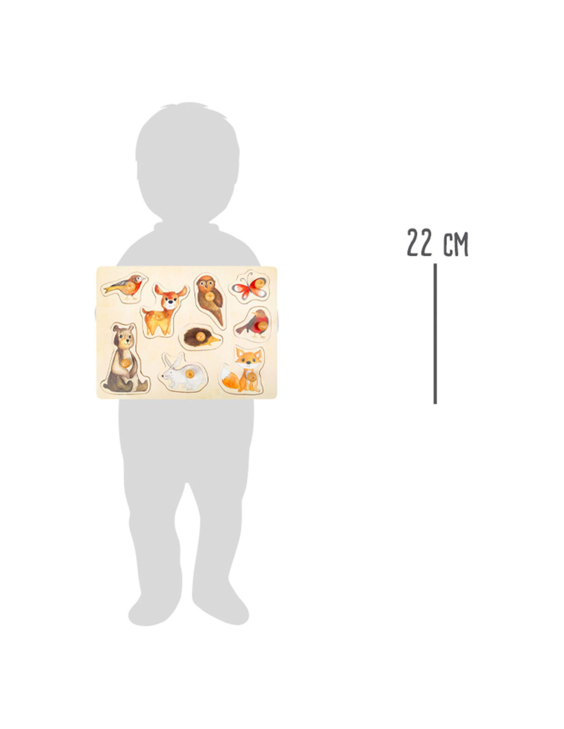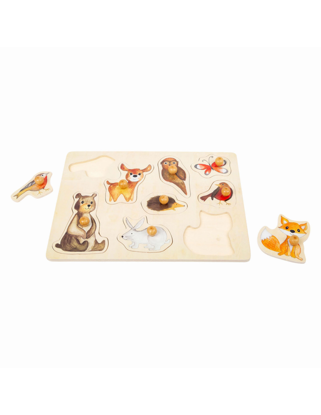 Snel naar het bos! Deze robuuste houten puzzel bevat liefdevol geïllustreerde puzzelstukken met houten knoppen uit de themawereld bosdieren. De puzzelstukjes kunnen gemakkelijk door jonge kinderen worden vastgepakt en in de voorgesneden posities worden geplaatst, wat op een speelse manier hun fijne motoriek en geduld traint.