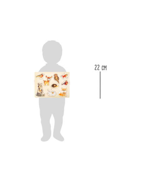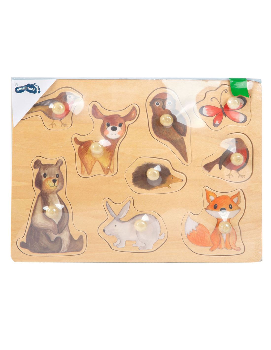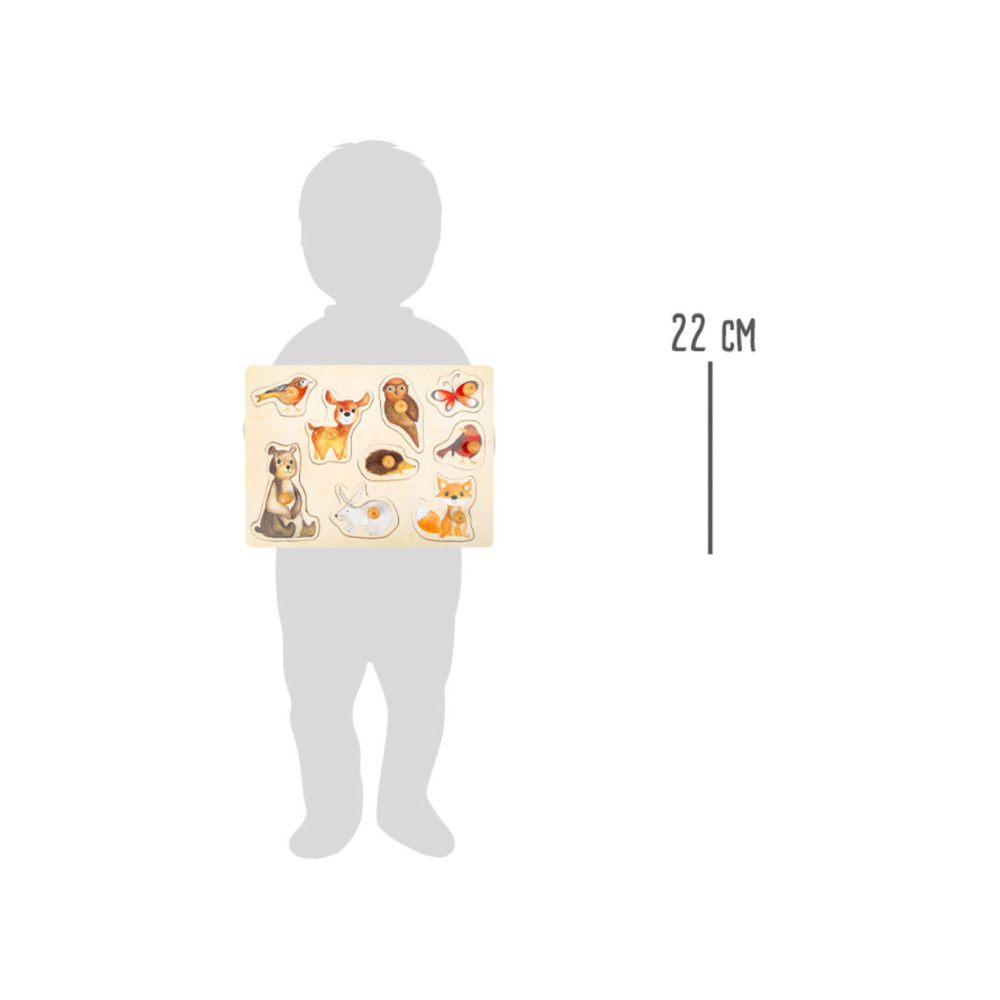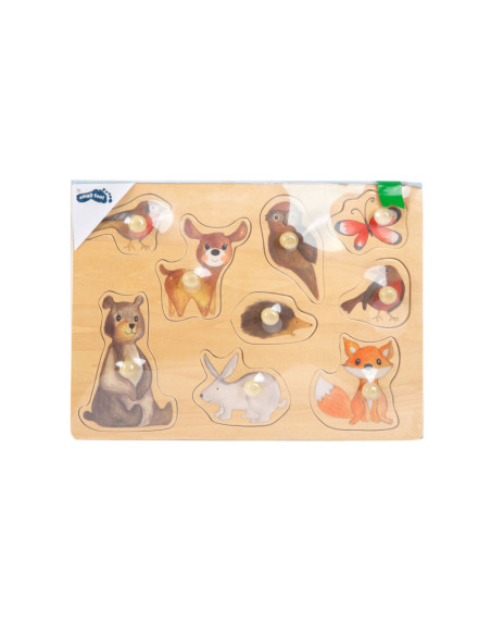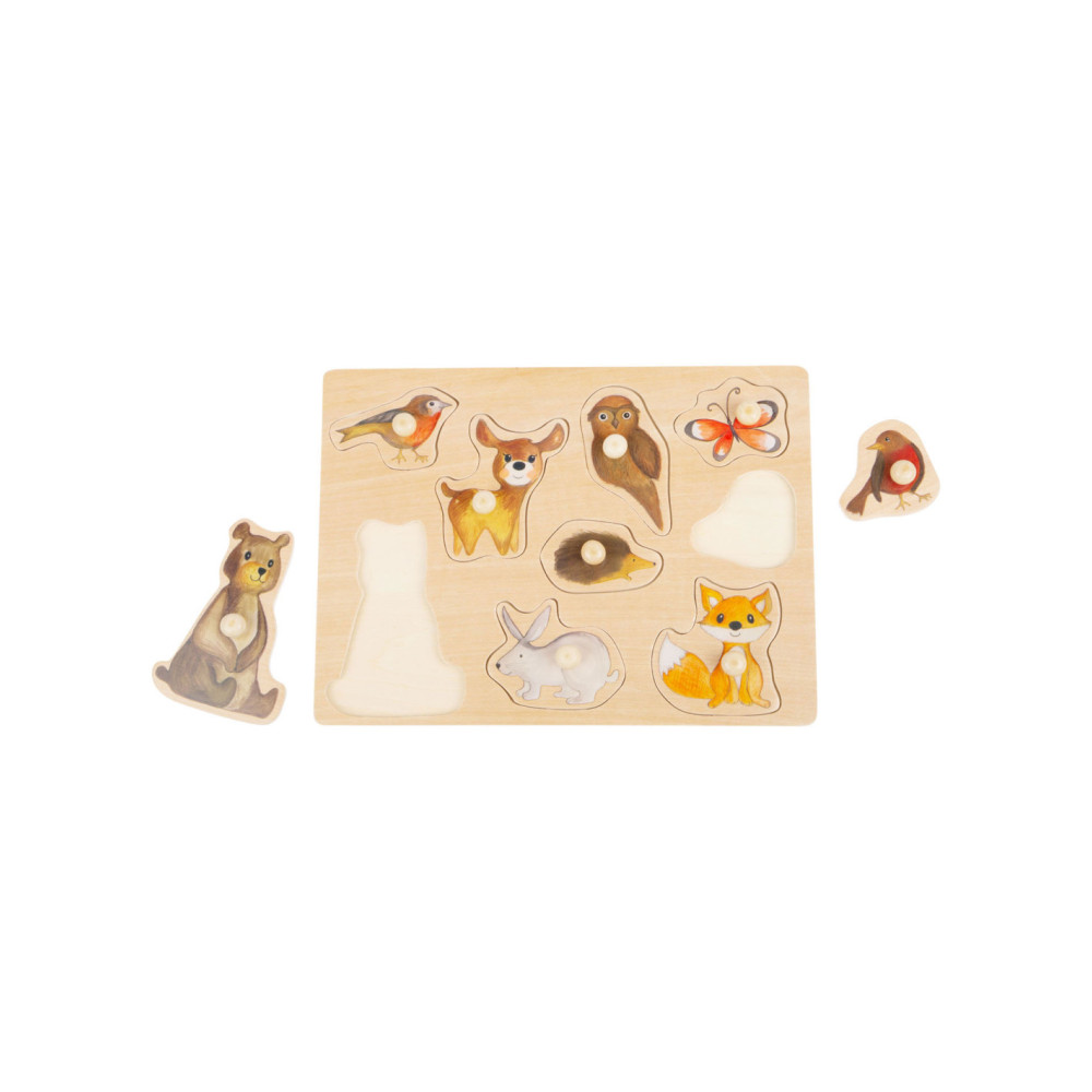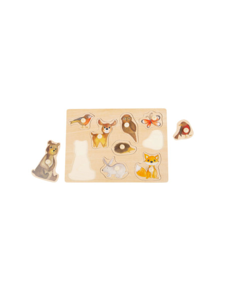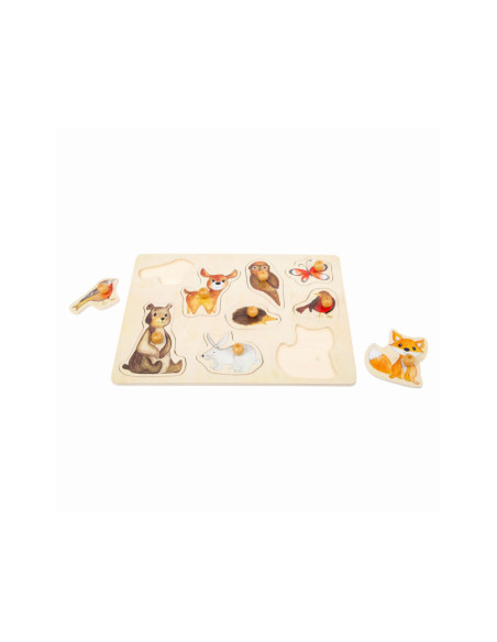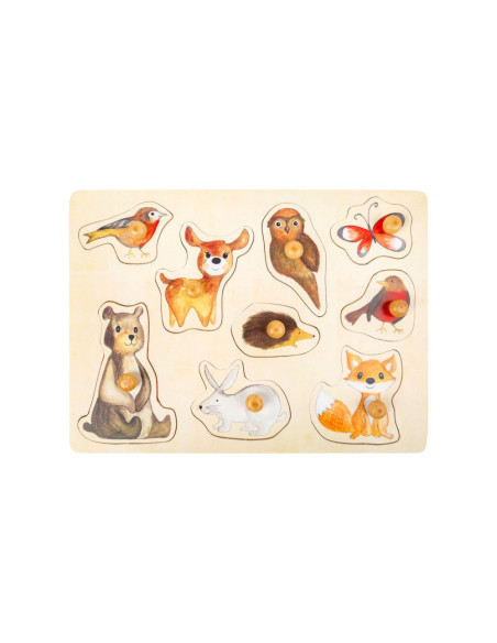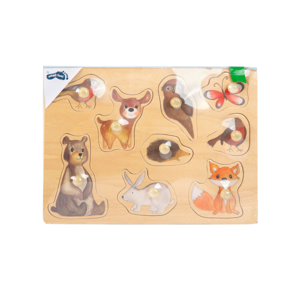 Snel naar het bos! Deze robuuste houten puzzel bevat liefdevol geïllustreerde puzzelstukken met houten knoppen uit de themawereld bosdieren. De puzzelstukjes kunnen gemakkelijk door jonge kinderen worden vastgepakt en in de voorgesneden posities worden geplaatst, wat op een speelse manier hun fijne motoriek en geduld traint.