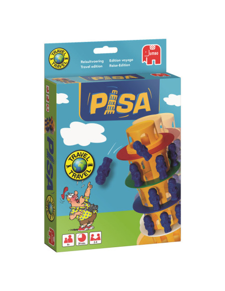 De reiseditie van het spel 'Toren van Pisa'. In makkelijk meeneem formaat. Geschikt voor 2 tot 4 spelers. Speelduur 20 minuten.
