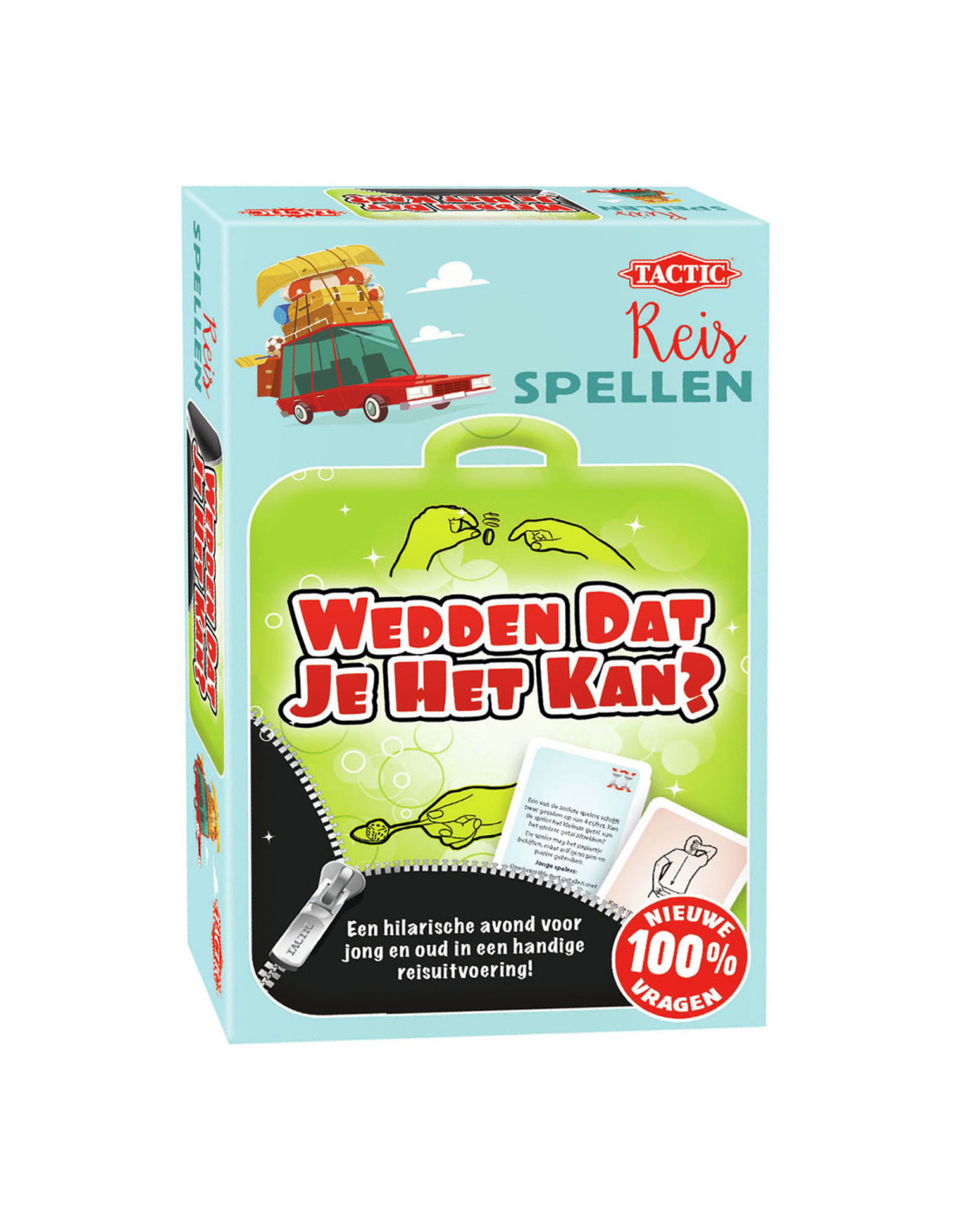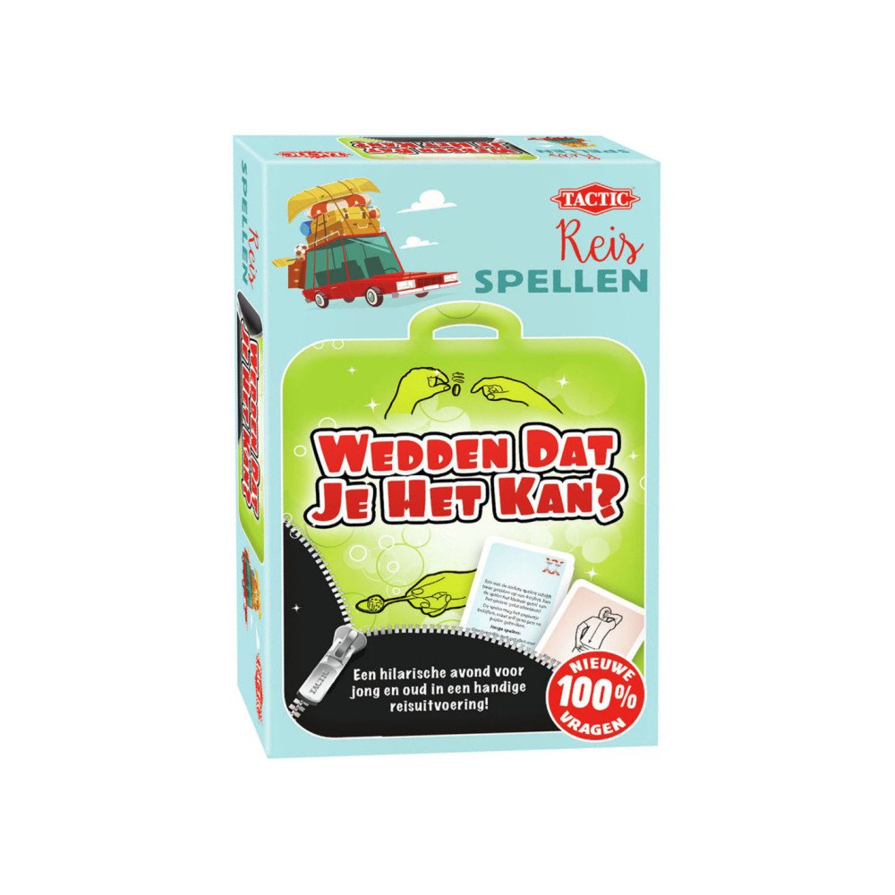 Wedden Dat Je Het Kan ? Een schaterlachend spel voor jong en oud. Kun jij je schoenen wisselen en binnen 10 seconden rond de tafel rennen? De andere spelers wedden of jij dat kan. Dat is... Wedden dat je het kan! Soms krijg je een vraag , soms moet je een opdracht uitvoeren en wedt je op de andere spelers. Wedden dat jullie een lachen-gieren-brullen avond hebben? Dit is de handige reisuitvoering van het grote spel, vol met nieuwe vragen en hilarische opdrachten!