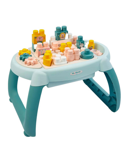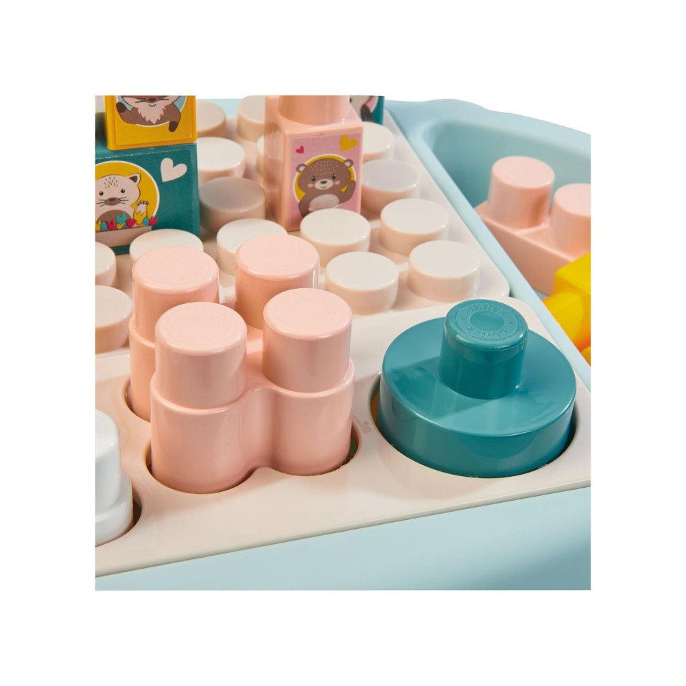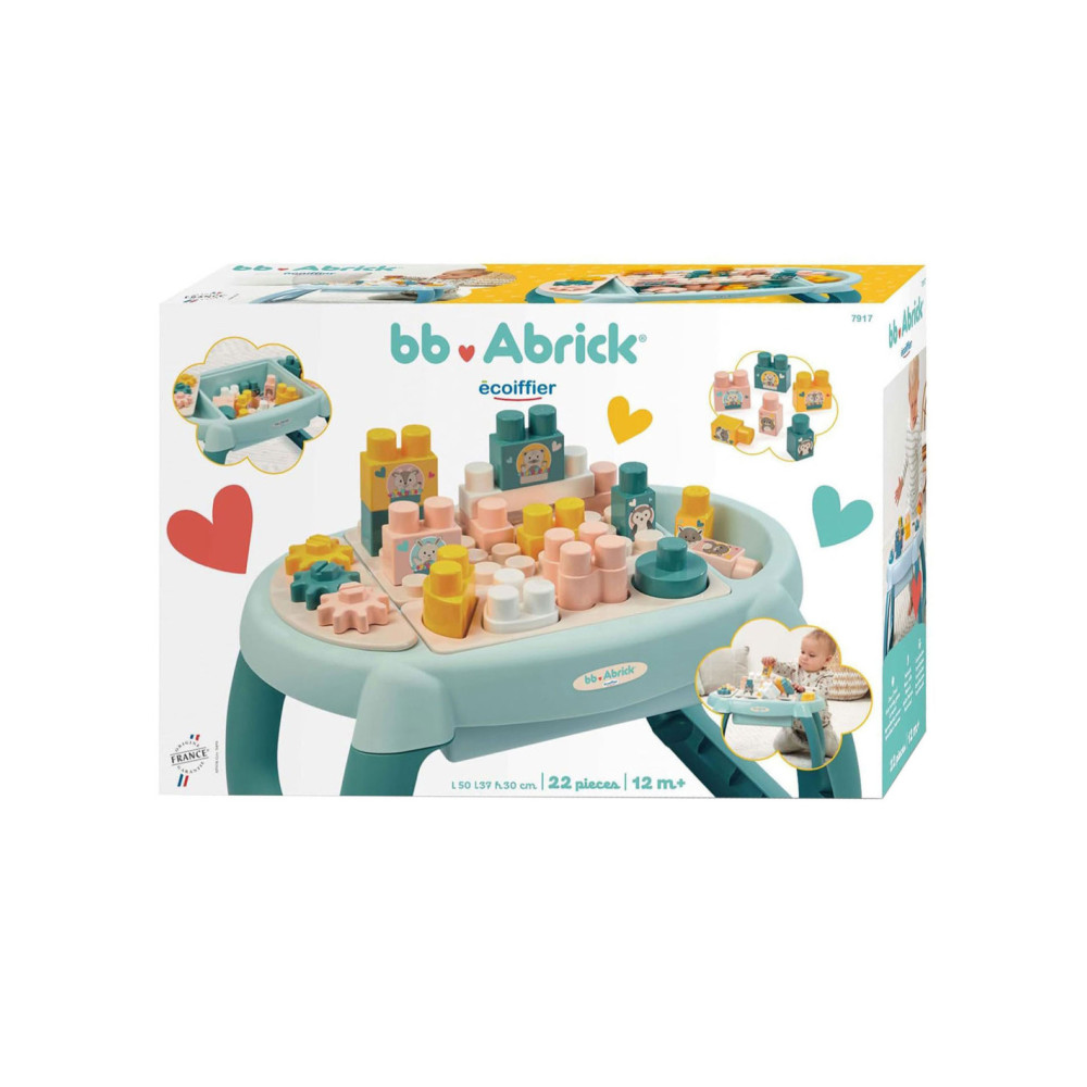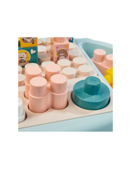Ecoiffier activiteitentafel in pastelkleuren, met 15 kunststof bouwblokken in 4 verschillende vormen. Voor bouwen, sorteren en spelen. Afmetingen (gemonteerd): 50 x 37 x 30 centimeter. Geschikt vanaf 12 maanden.