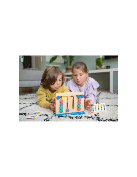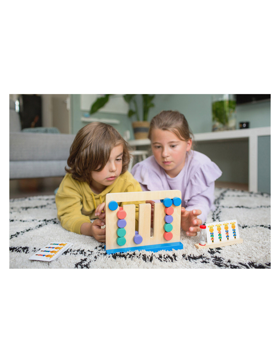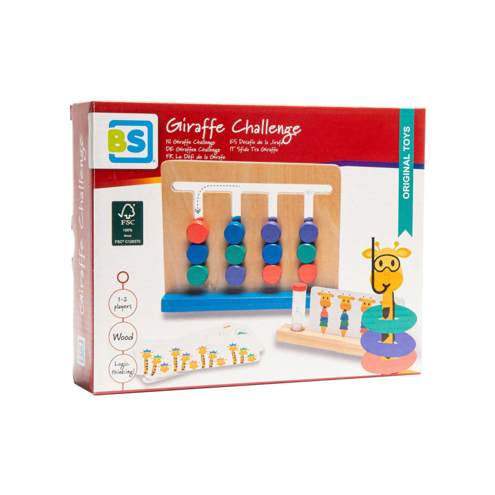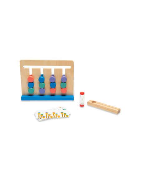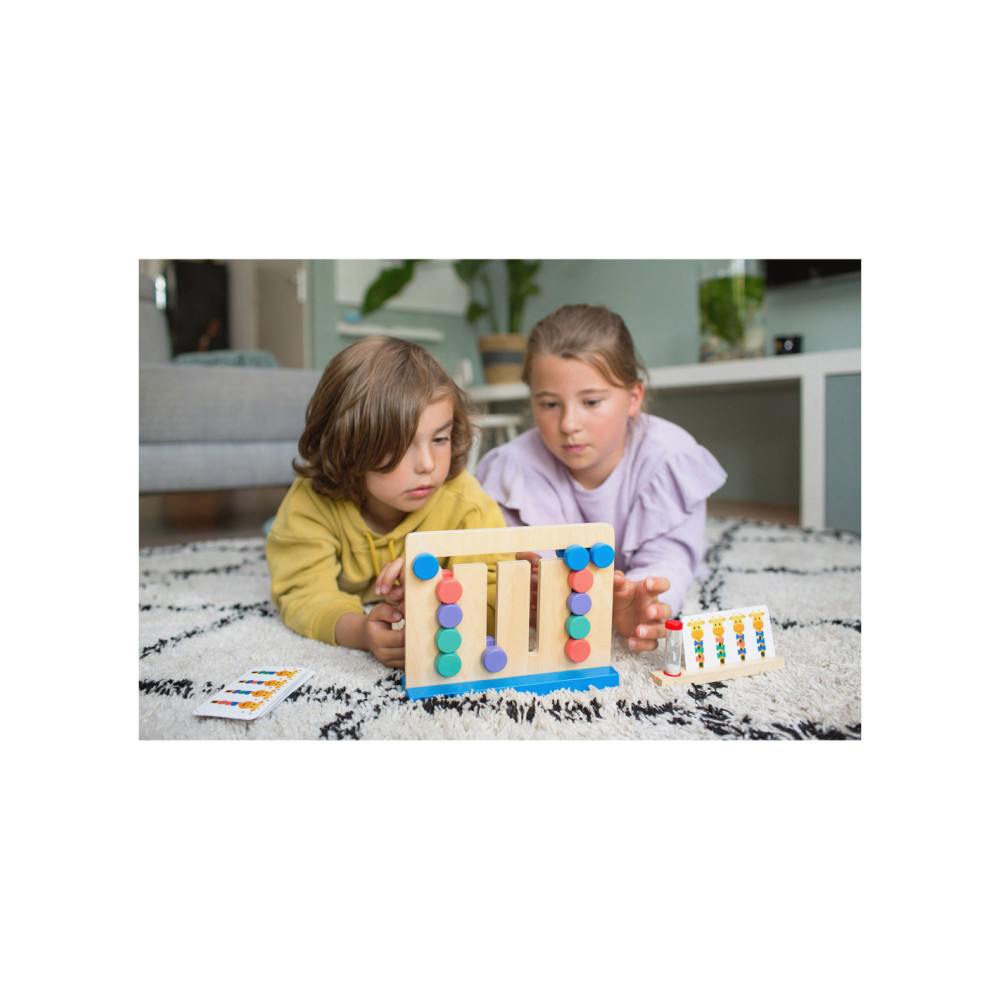 Kijk goed naar de giraffen en het kleurenpatroon op de kaart. Schuif nu de puzzel in dezelfde volgorde als het patroon. Gaat het goed? Probeer dan eens of je het binnen de tijd van de zandloper kan.
