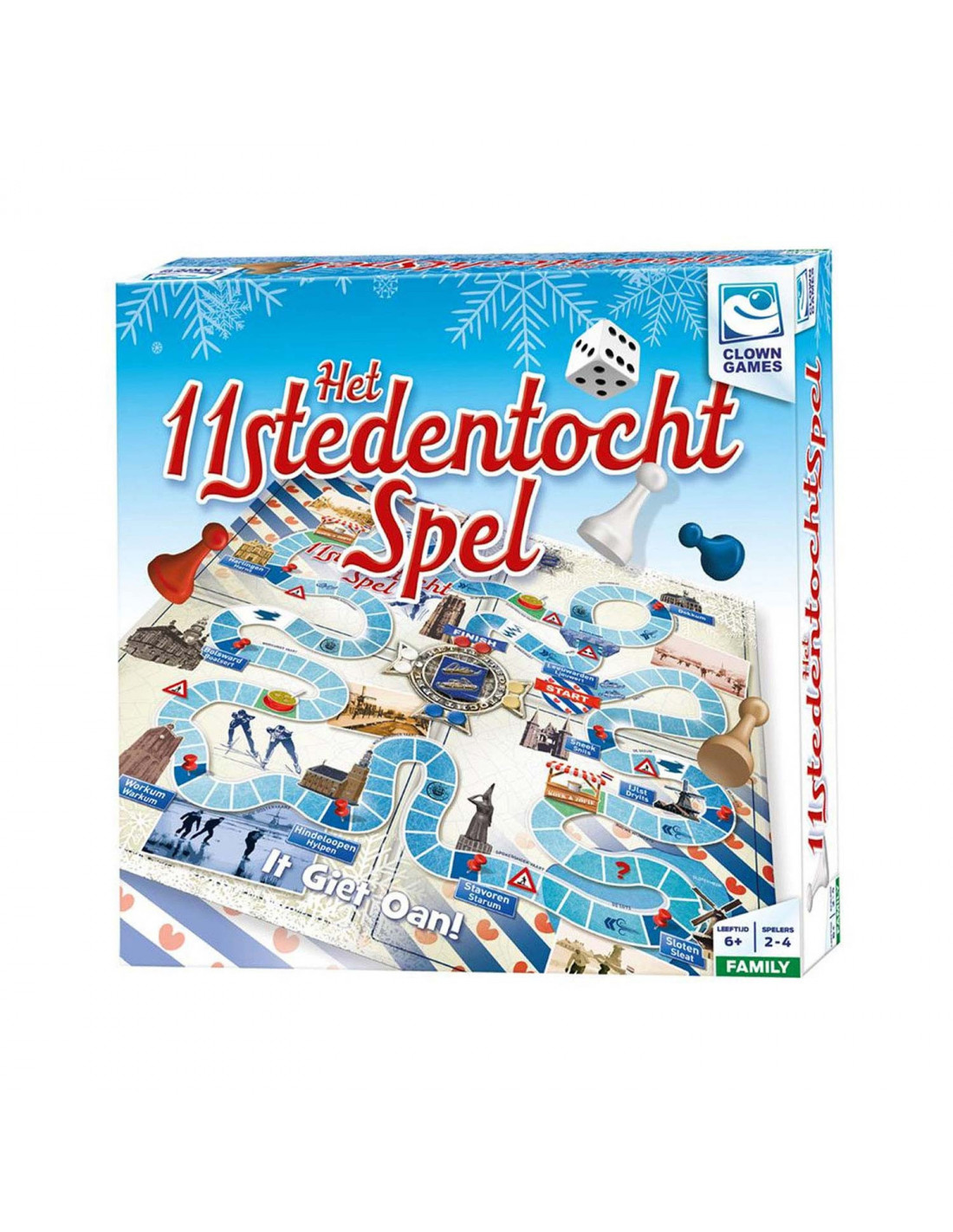 Het 11-Stedentochtspel. Wie is als eerste bij de finish en wint het felbegeerde elfstedenkruisje? Gooi met de dobbelsteen en verplaats de pion met het aantal ogen dat is gegooid. Wanneer je op één van de vakjes komt met een plaatje, voer dan de opdracht uit die bij het plaatje hoort. Als je bijvoorbeeld moet klúnen, sla je een beurt over. Of heb jij de wind in de rug en telt je worp dubbel? De speler die als eerste over de finish komt, wint de Elfstedentocht. Inhoud: 1 spelbord van 50 x 50 cm, 8 houten pionnen in vier kleuren, 1 dobbelsteen en handleiding met spelregels. Voor 2-4 spelers of teams vanaf 6 jaar.