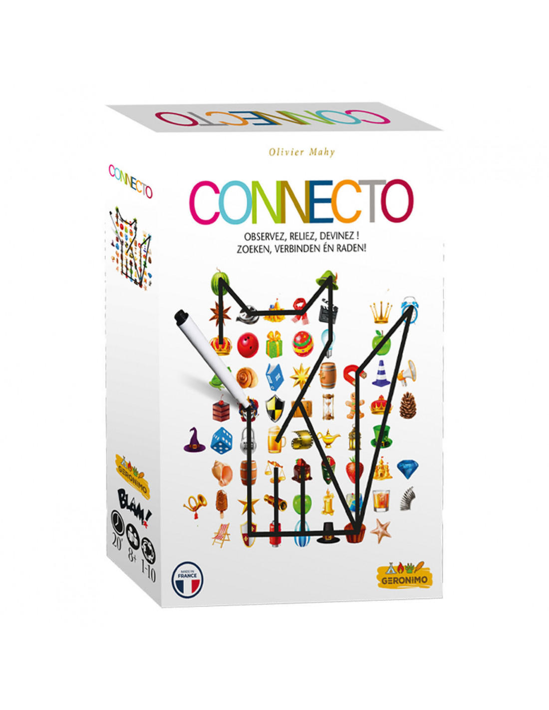Connecto tovert het principe van de “verbind de punten”-kleurplaten om in een leuk familiespel voor jong en oud. In dit spel verbind je symbolen met een stiftje op je spelersbord volgens de instructies op de raadselkaart. Je probeert daarbij als eerste te raden wat je aan het tekenen bent. Wie na 8 raadsels de meeste sterren heeft verdiend, wint! Connecto is simpel, doeltreffend en verslavend. Met 184 raadsels om op te lossen en 4 spelvarianten garandeert dit spel heel wat plezier.