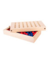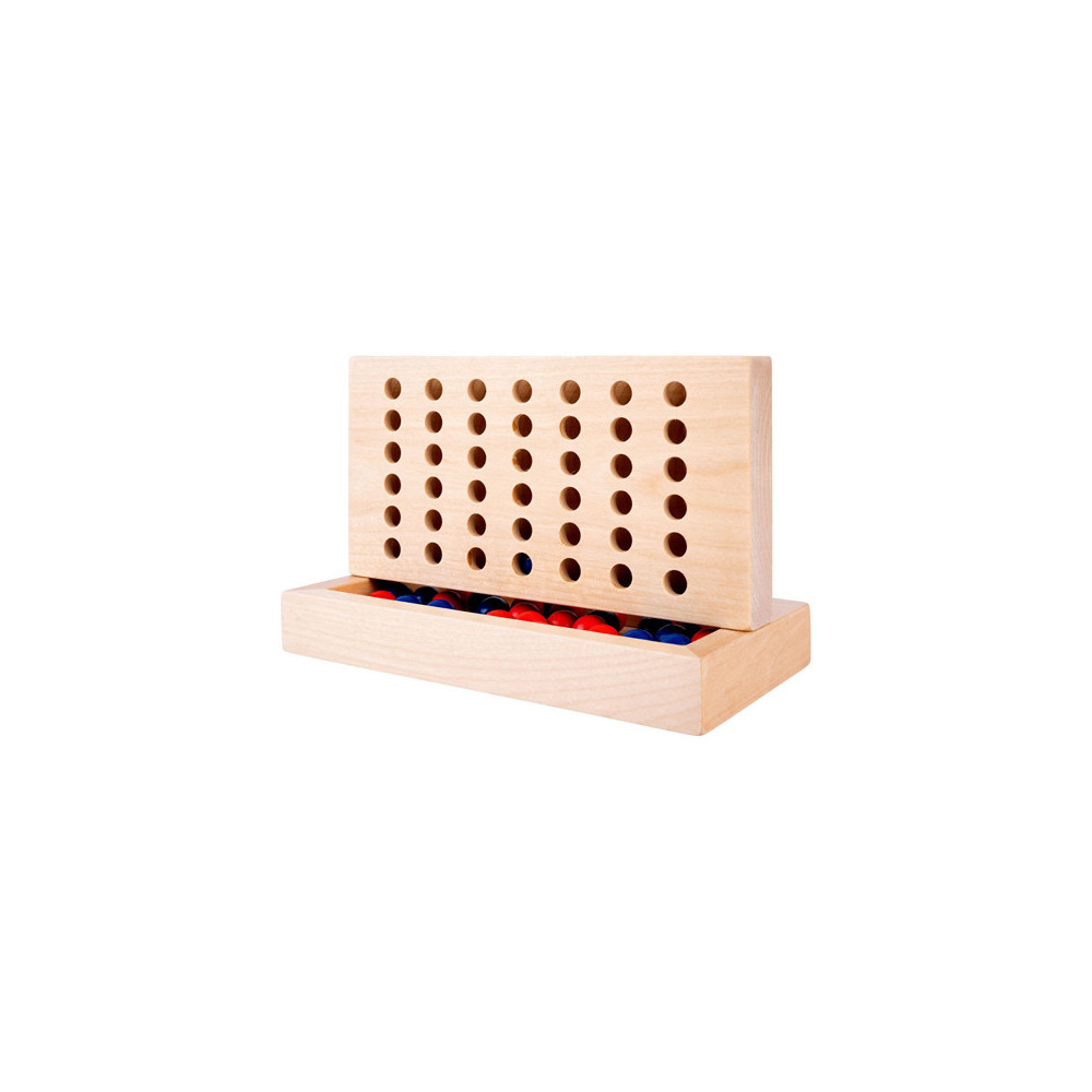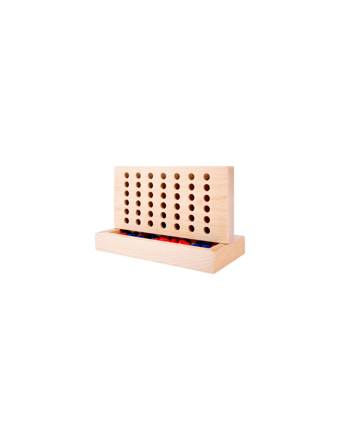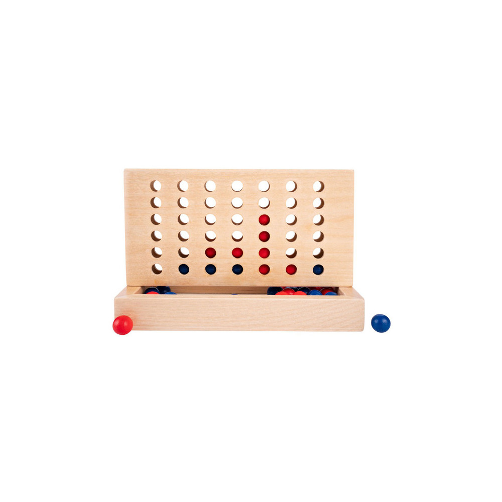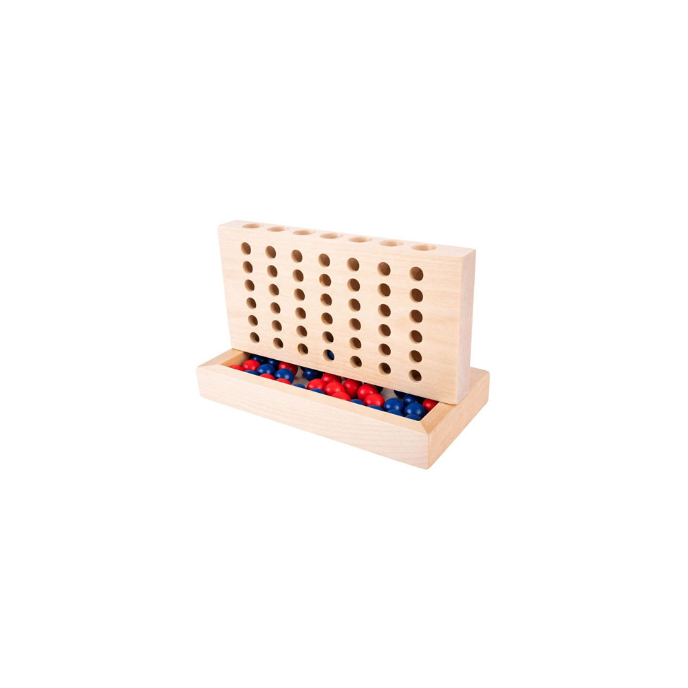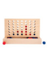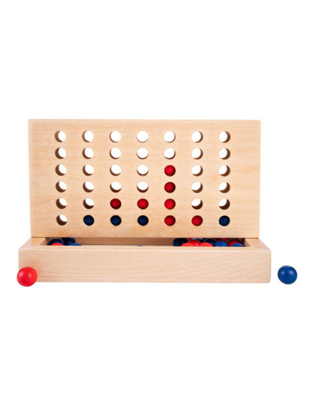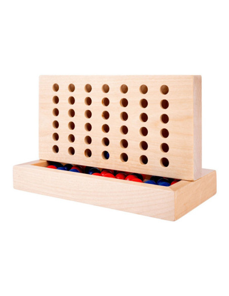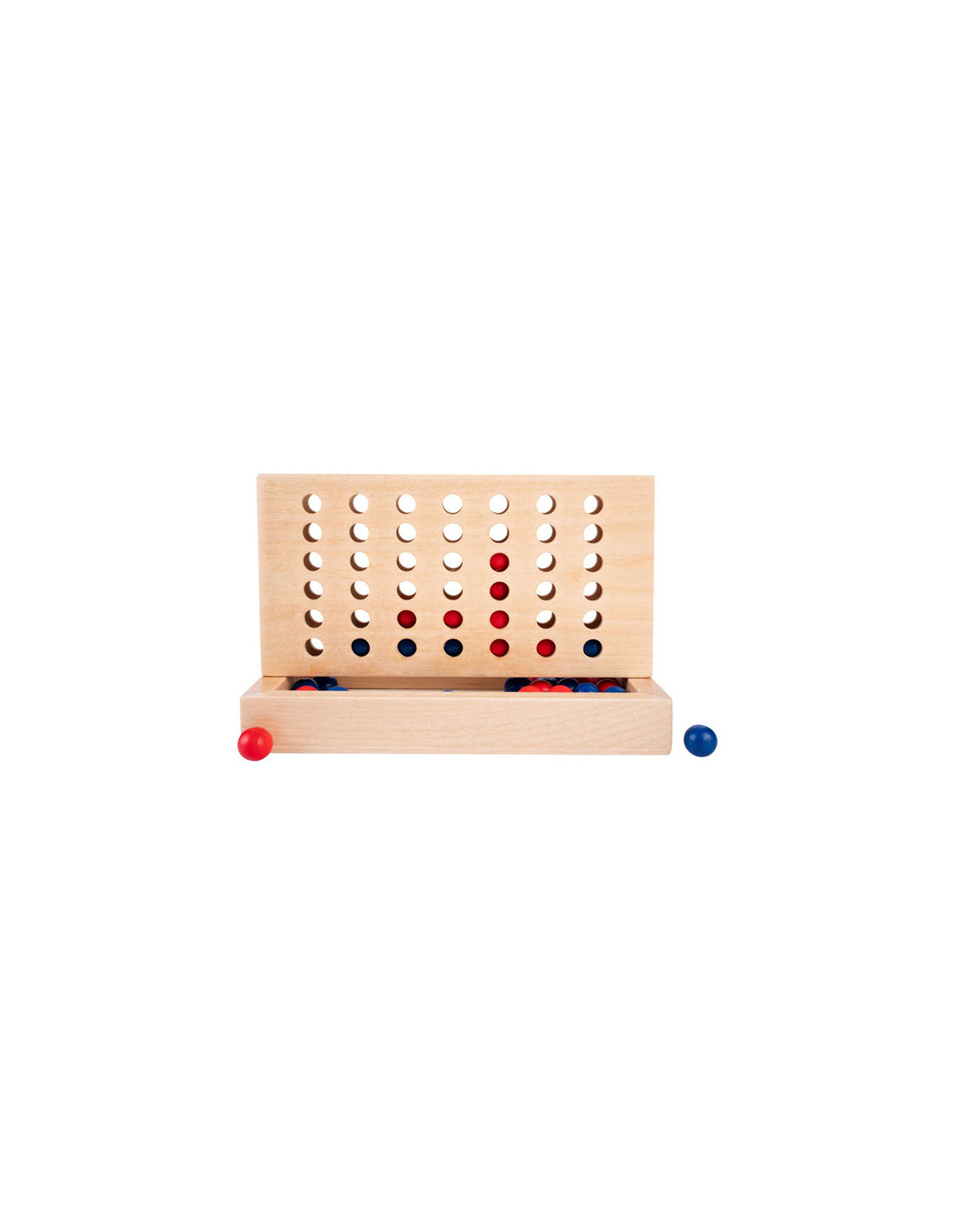 Houten Vier op een Rij-spel met blauwe en rode balletjes. De speler die als eerste 4 schijven van zijn kleur op een rij weet te plaatsen wint. Het houten frame is eraf te halen en gebruiken als deksel voor de houten bak met balletjes. Geschikt voor kinderen vanaf 3 jaar oud.
