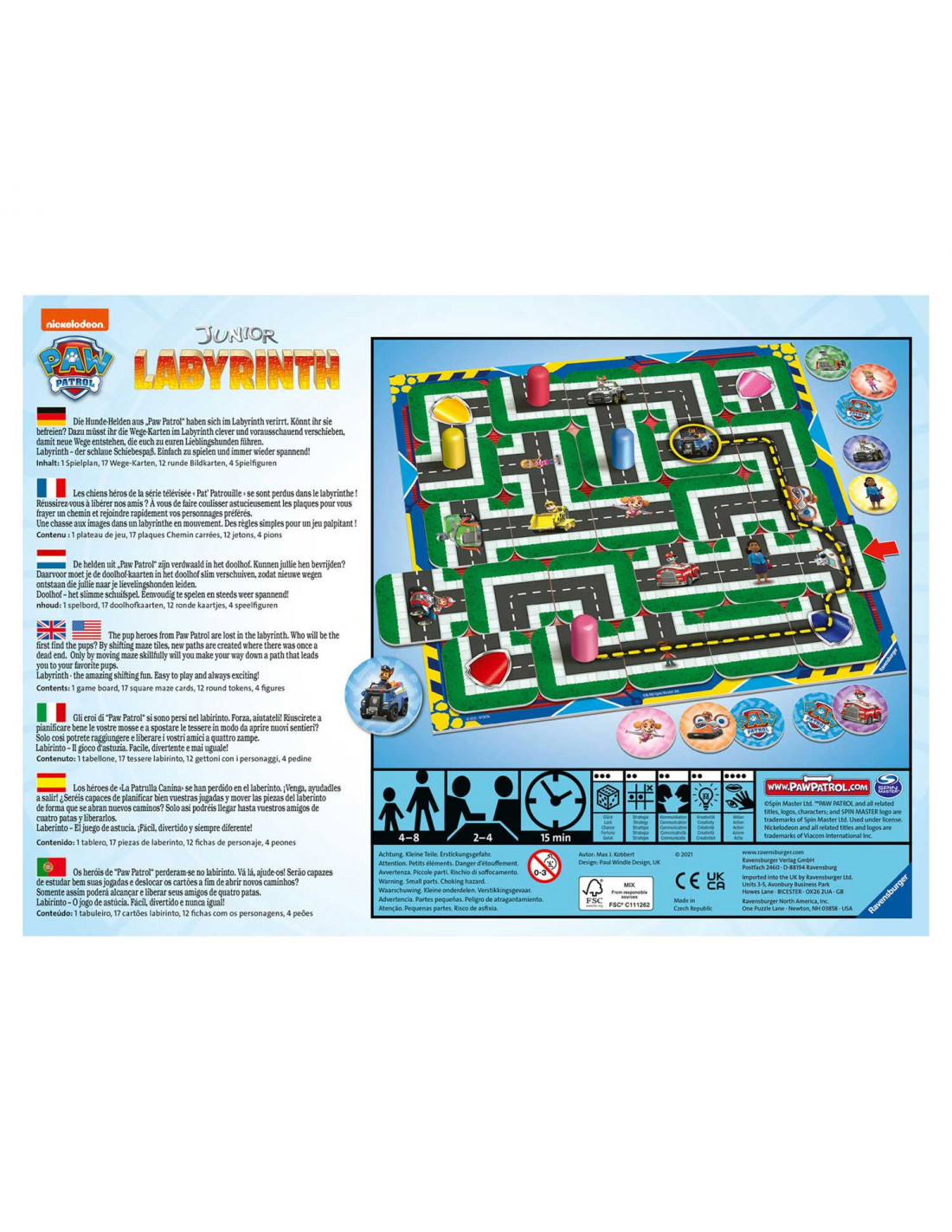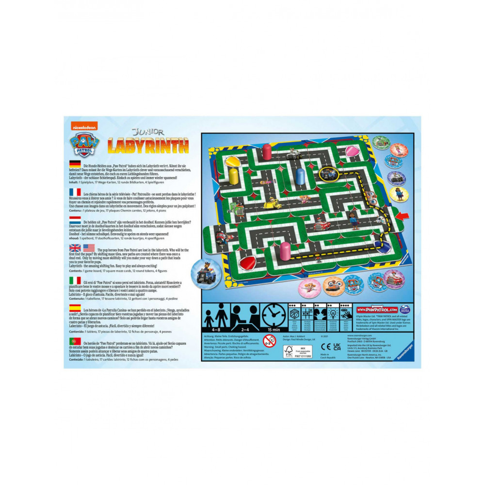 De helden uit PAW Patrol zijn verdwaald in het doolhof. Kunnen jullie hen bevrijden? Daarvoor moet je de doolhof- kaarten in het doolhof slim verschuiven, zodat nieuwe wegen ontstaan die naar jullie lievelingshonden leiden. Doolhof - het slimme schuifspel. Eenvoudig te spelen en steeds weer spannend!