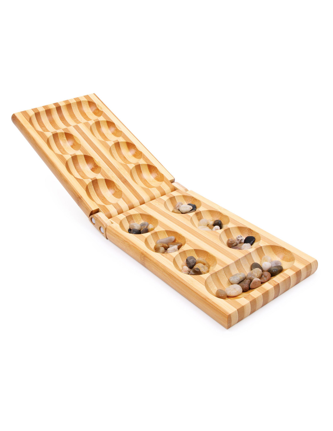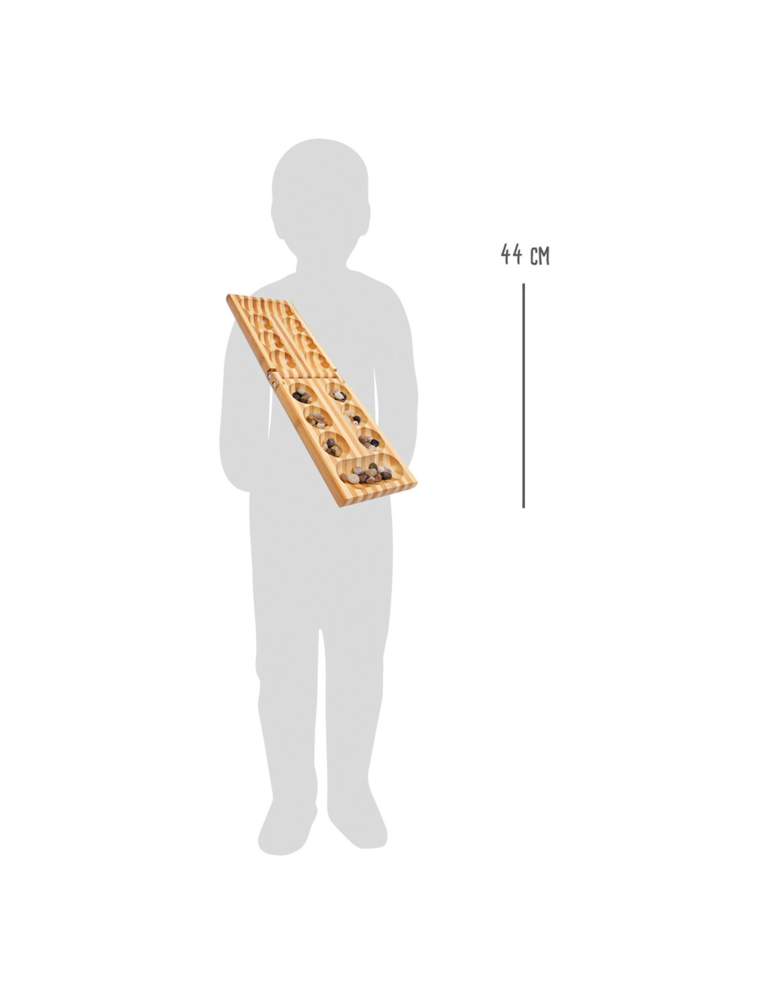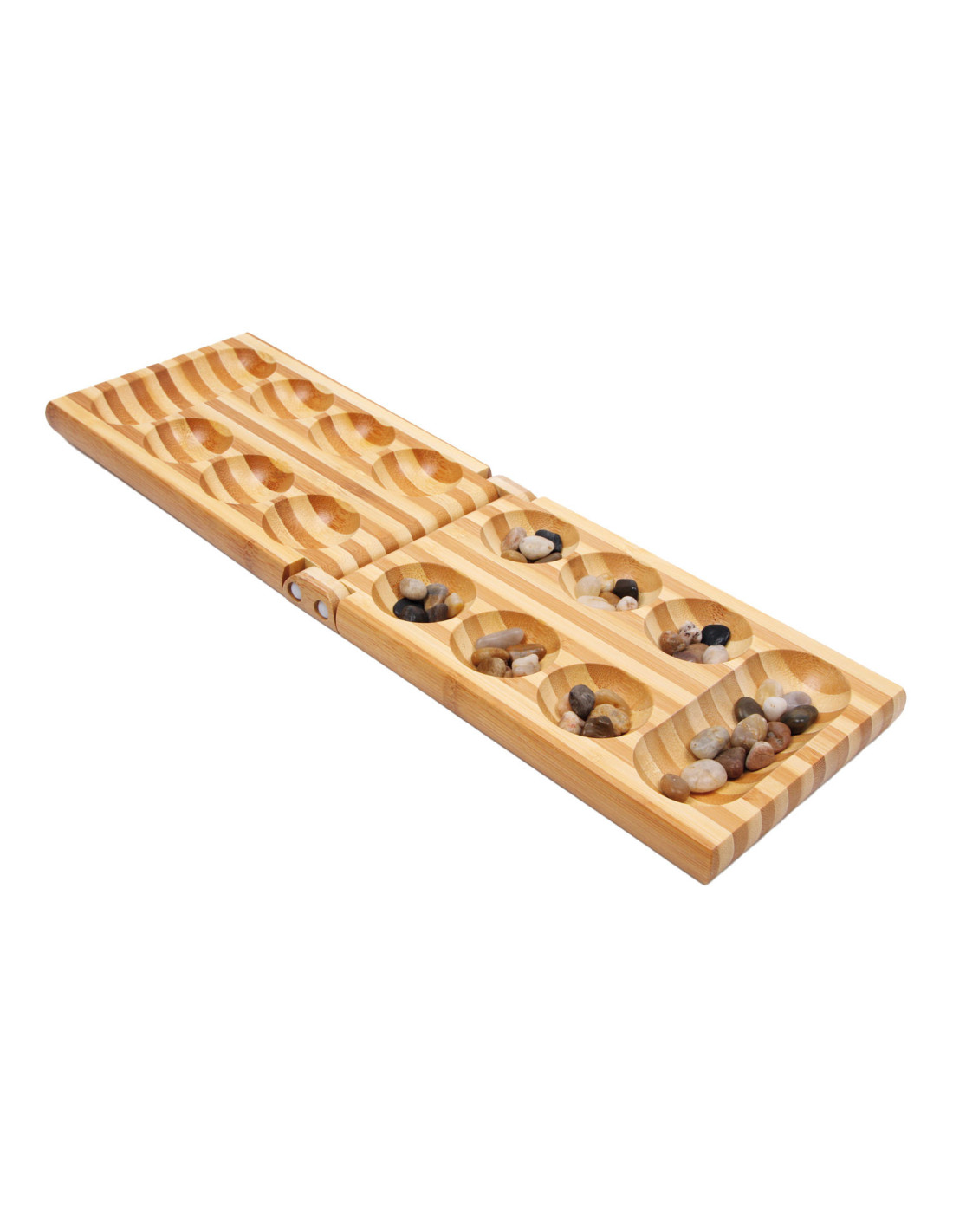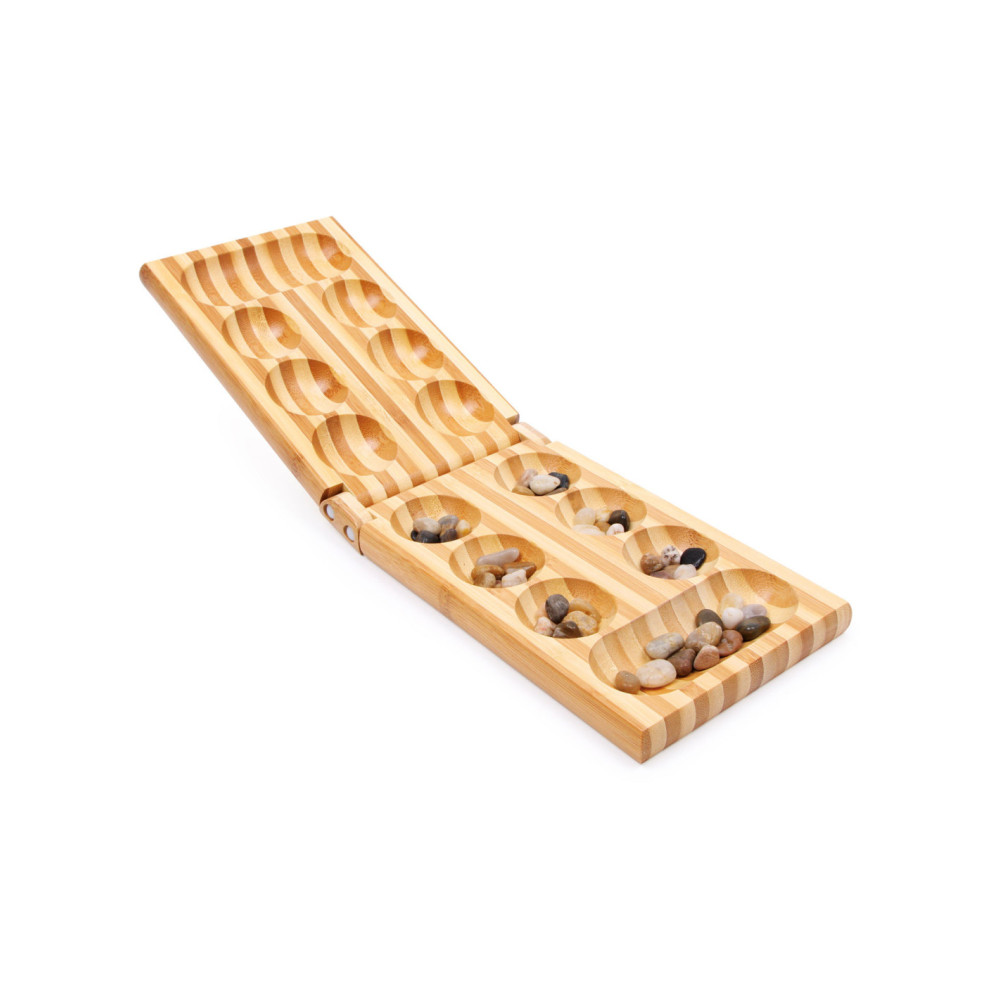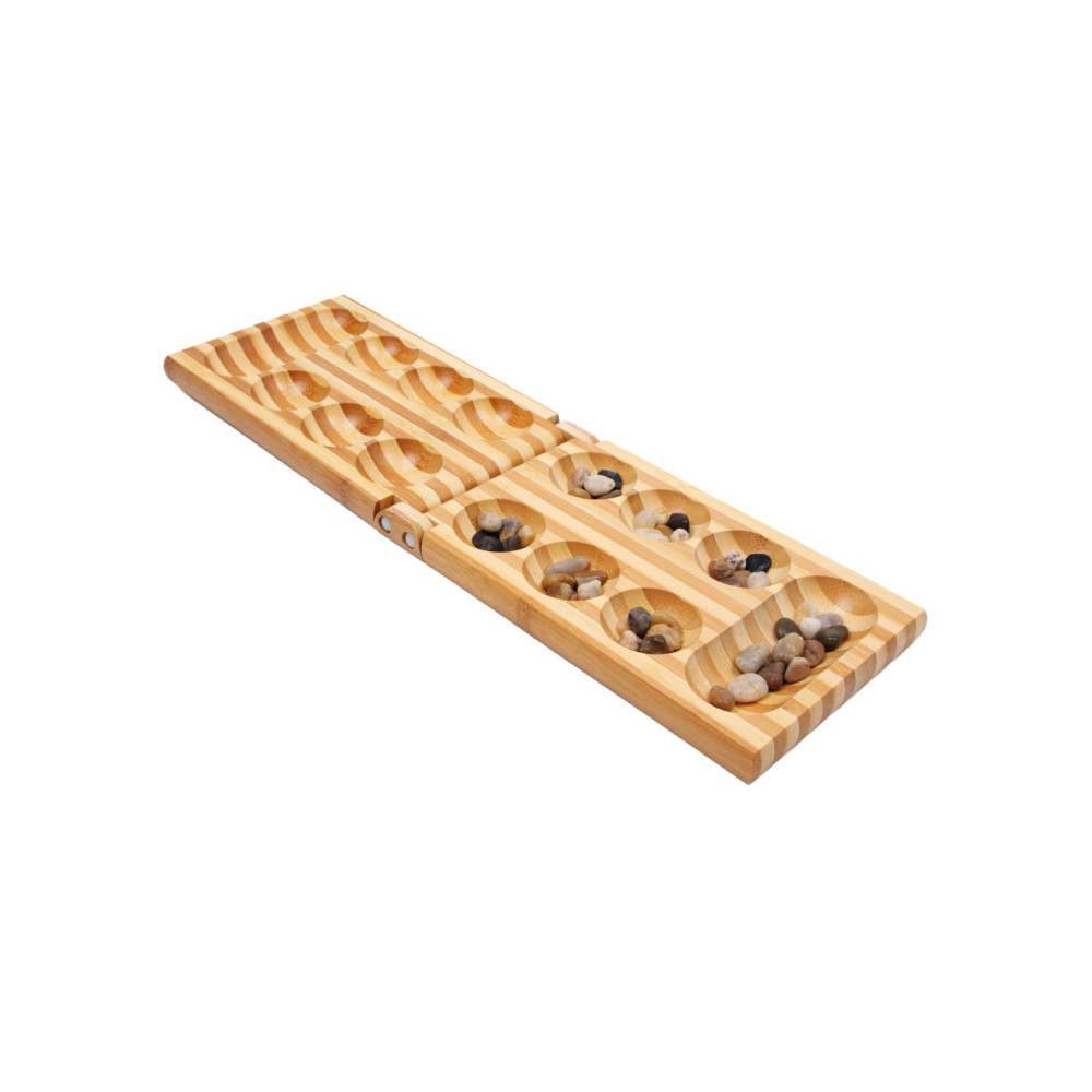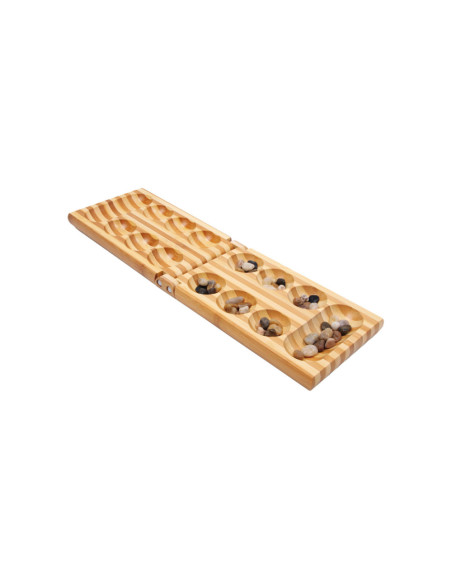 Mooi en praktisch voor onderweg! Deze hoogwaardige box van bamboehout met binnenschalen bevat het eeuwenoude maar tijdloos spannende strategie- en logicaspel “Kalaha”. Twee spelers vechten om het spel te winnen door de 48 natuurstenen opnieuw te verdelen. U zult zich niet vervelen! De winnaar is degene die de meeste natuurlijke stenen in zijn kommen heeft.