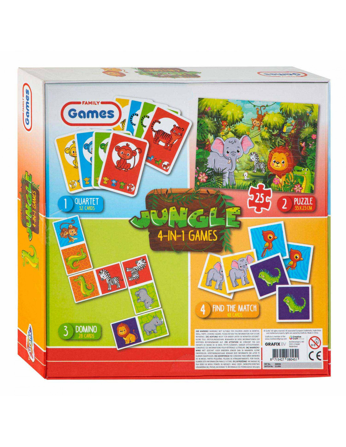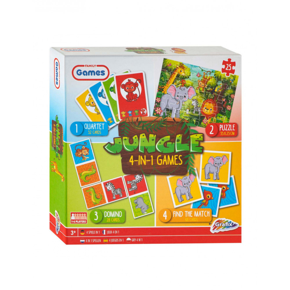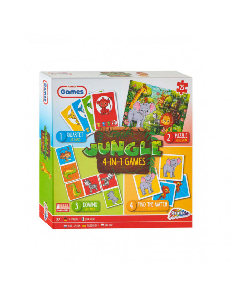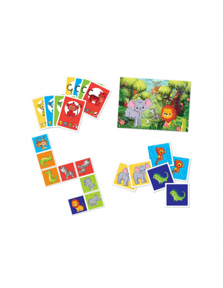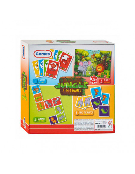 Spellendoos met 4 spellen met jungledieren. Kwartet, puzzel, domino en memorie. Geschikt voor kinderen van 3 tot 6 jaar oud.