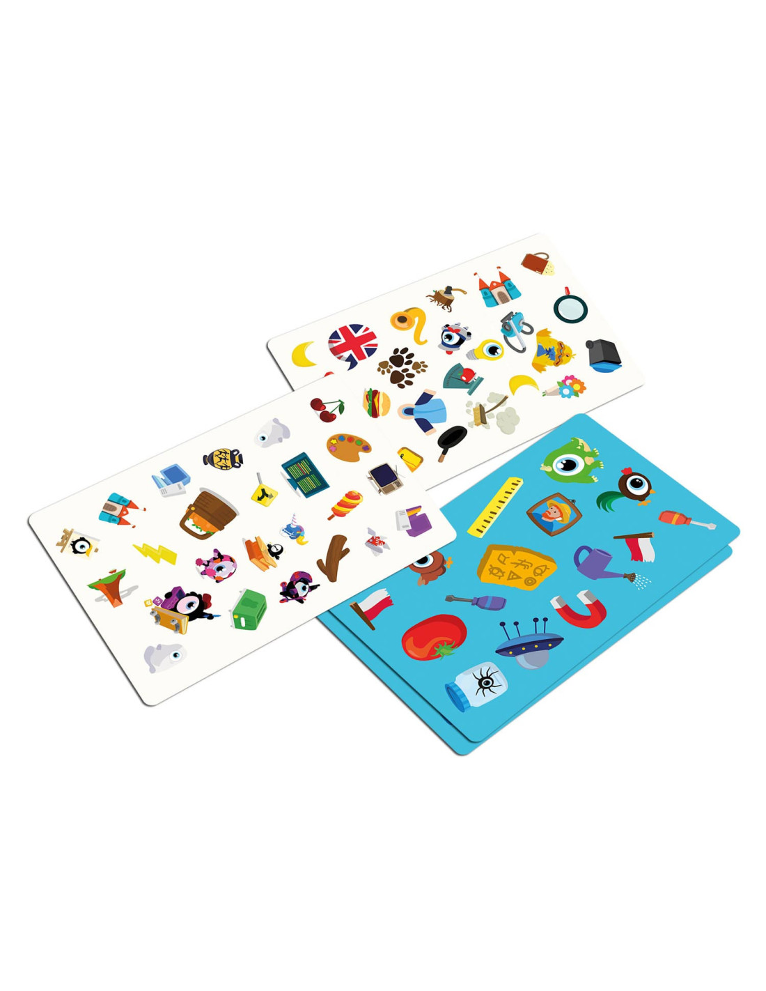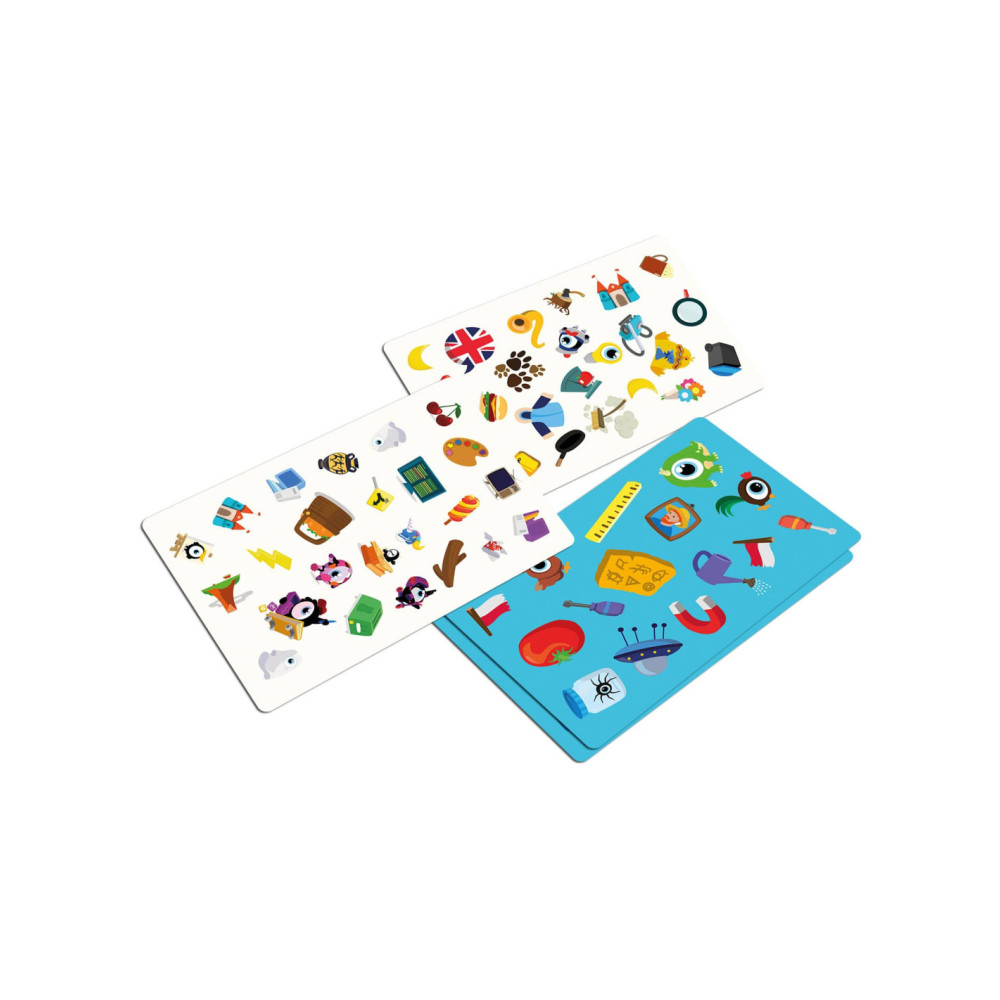 In dit spel gaat het er om dat je zo snel mogelijk ziet welk voorwerp 2x op de kaart staat! Alle spelers doen mee, dus je moet echt vliegensvlug zijn! Op elke kaart staan ook 2 dezelfde voorwerpen met allebei een andere kleur - ben je nu nog steeds de snelste? Daarnaast staan op elke kaart nog 2 voorwerpen die met elkaar te maken hebben, zoals een zon en een maan of een hamer en een zaag. Zie jij het verband en ben je ook weer de snelste?
