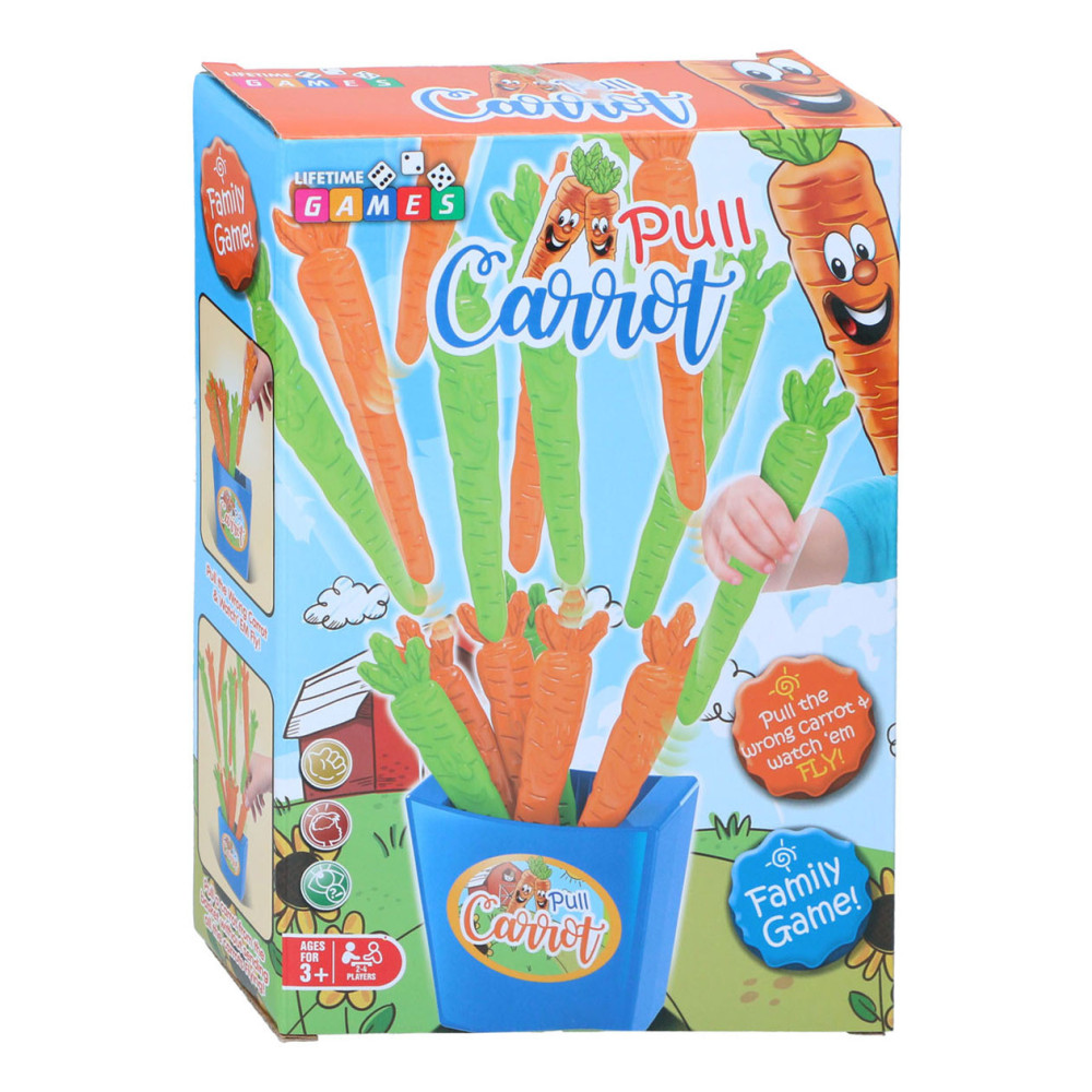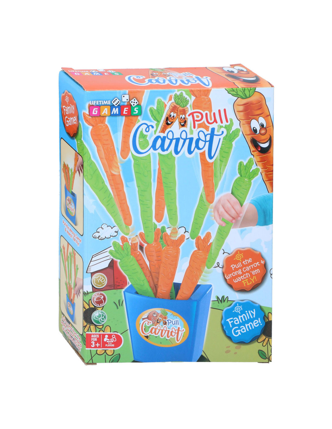 Worteltrekspel. Trek om de beurt een wortel uit het mandje. Kies je de verkeerde, dan vliegen alle wortels eruit! Geschikt voor 2 tot 4 spelers vanaf 3 jaar oud.