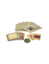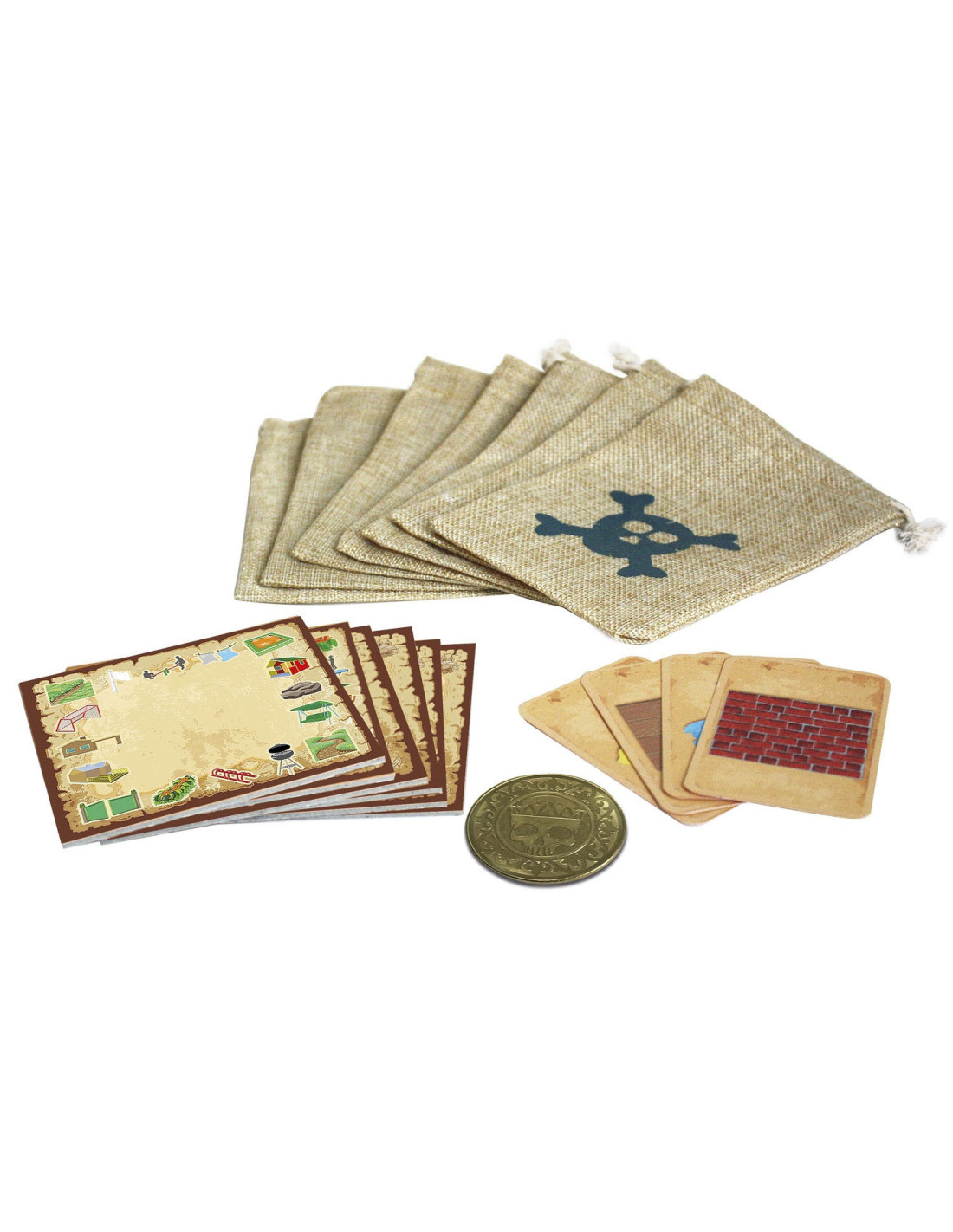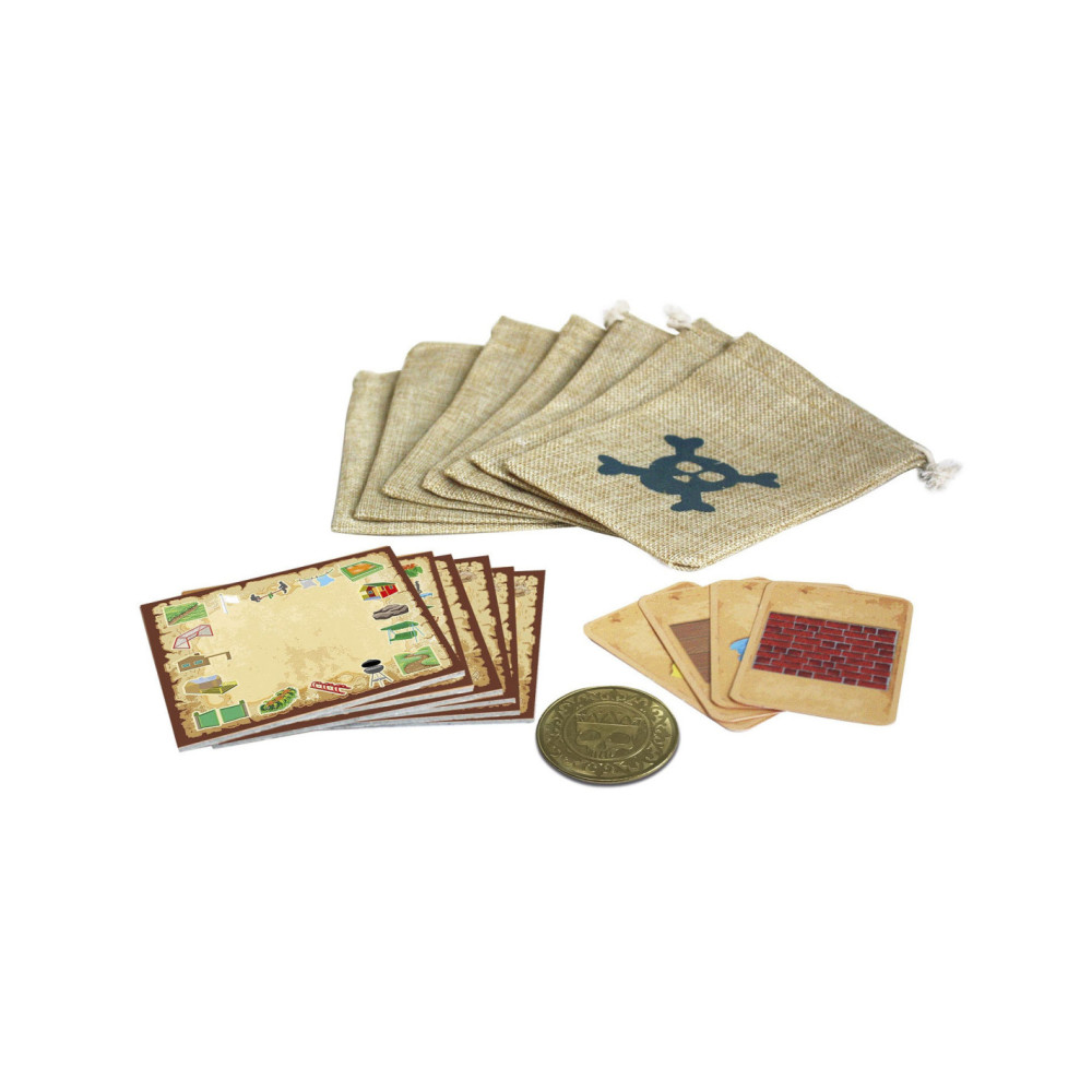 - Inclusief grote jute zakken, spelborden met hints, witte stiften en een echte metalen munt!
